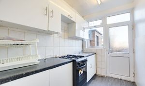 With double glazed window and door to the rear elevation, stainless steel sink and drainer unit with a range of wall and base units with work surface over, cooker point, part tiled walls.