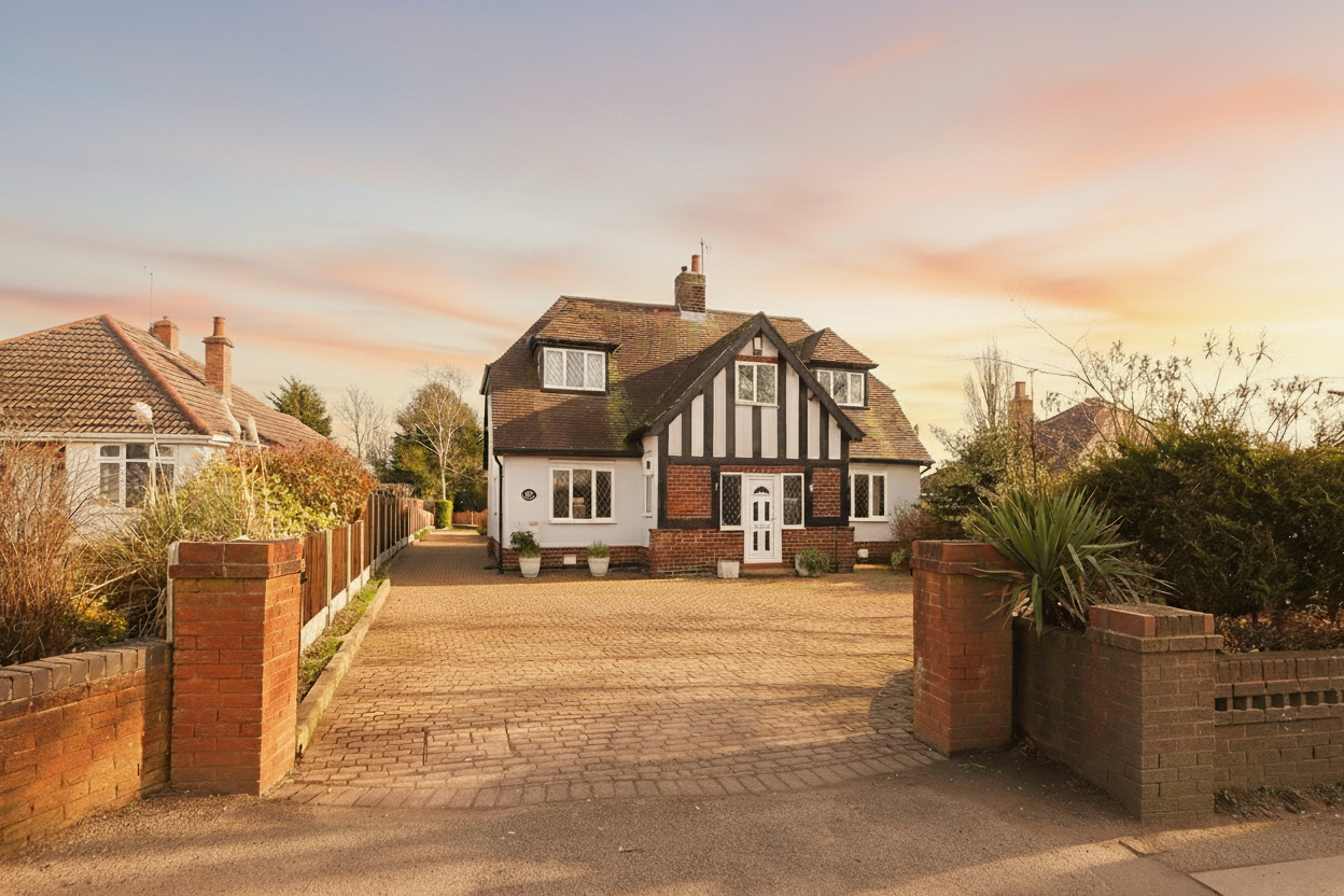 A generous block-paved driveway runs along the left side of the property, providing ample parking and leading down to three garages, offering excellent storage and parking options.