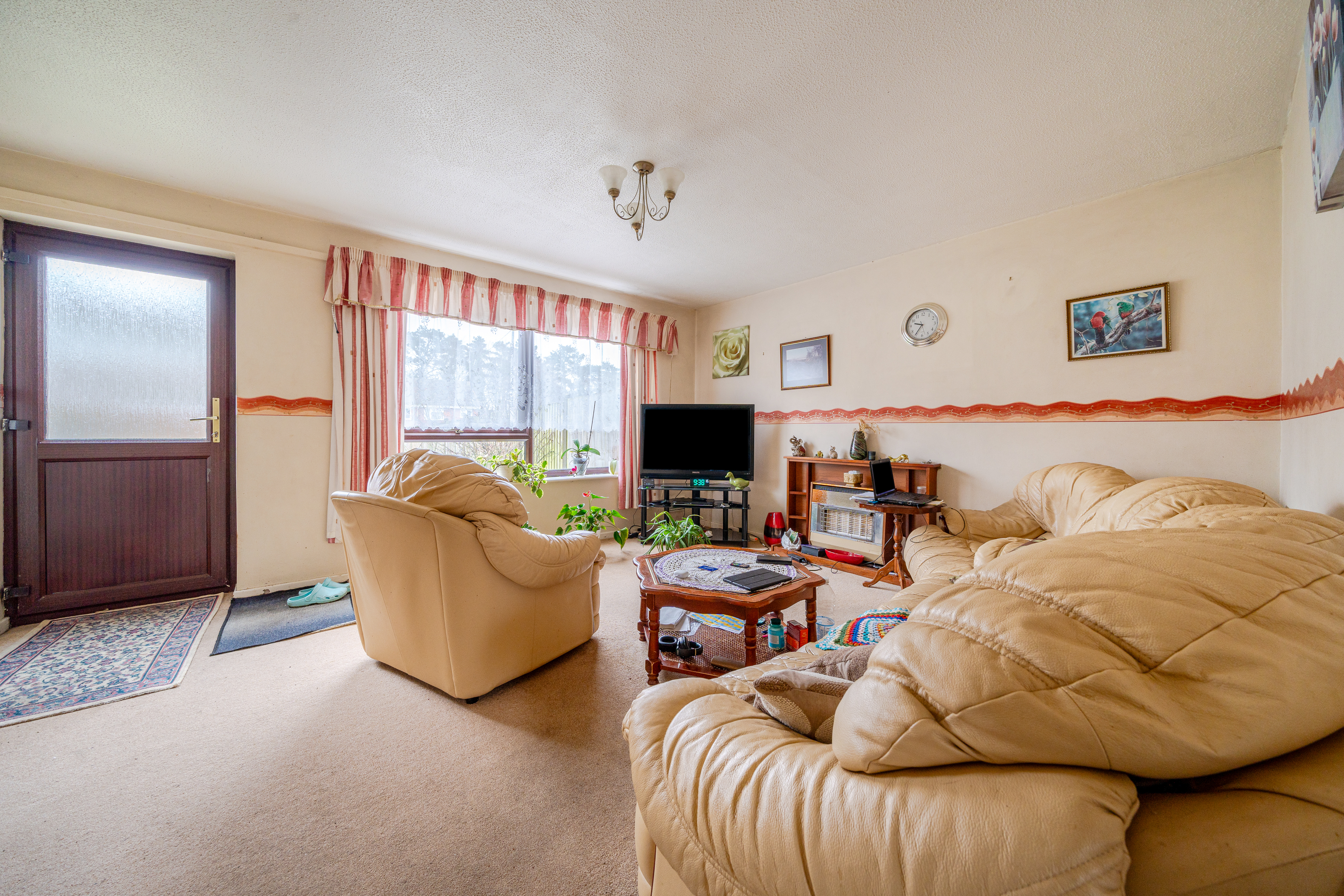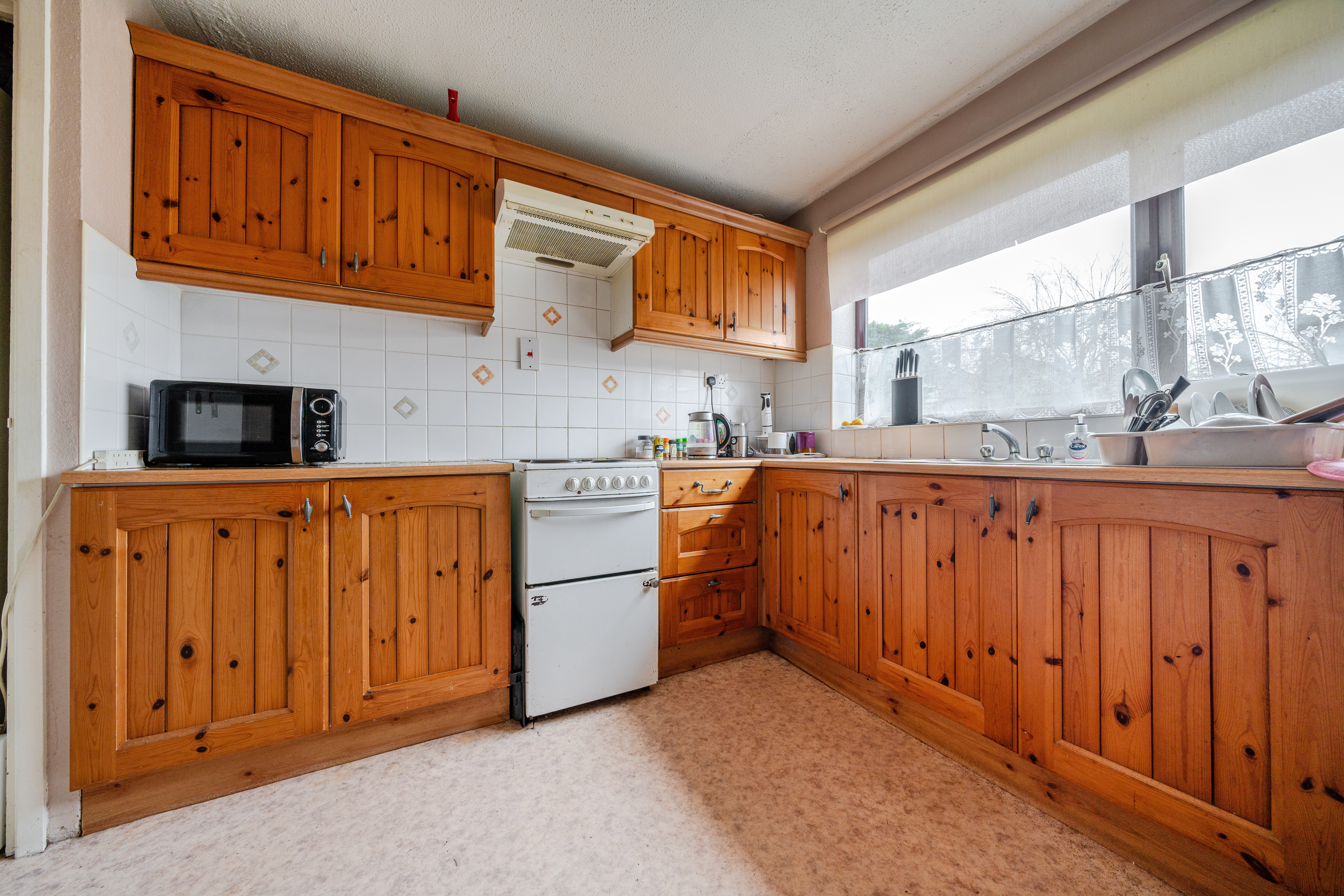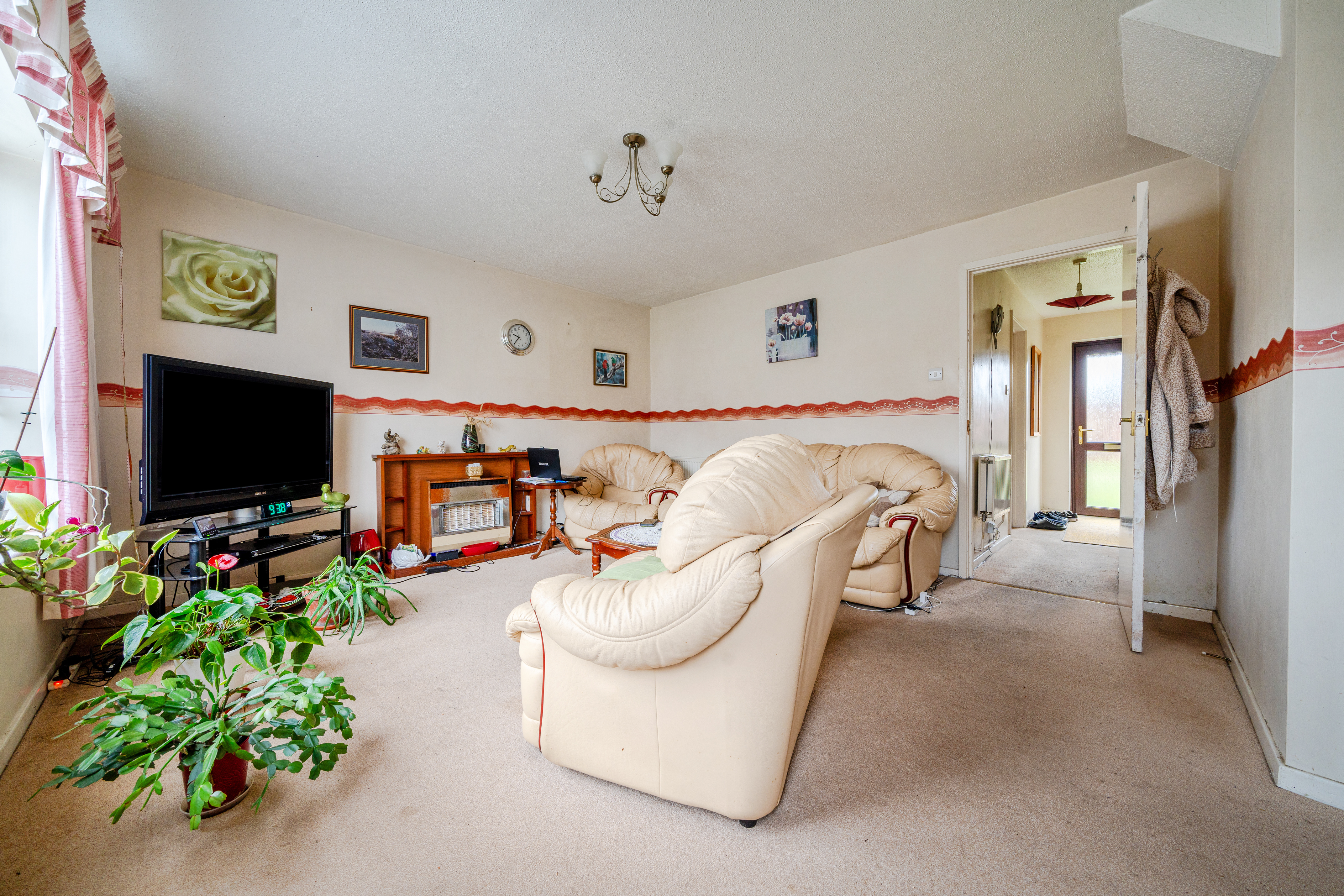 Upon entering, the hallway leads to a downstairs WC with a sink unit and tiled surround. The kitchen/dining room provides space for a table seating four, with base and wall-mounted units, a sink overlooking the front garden, an electric cooker point, and space for a tall-standing fridge freezer. The living room benefits from direct access to the rear garden and features a useful understairs storage cupboard.