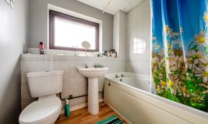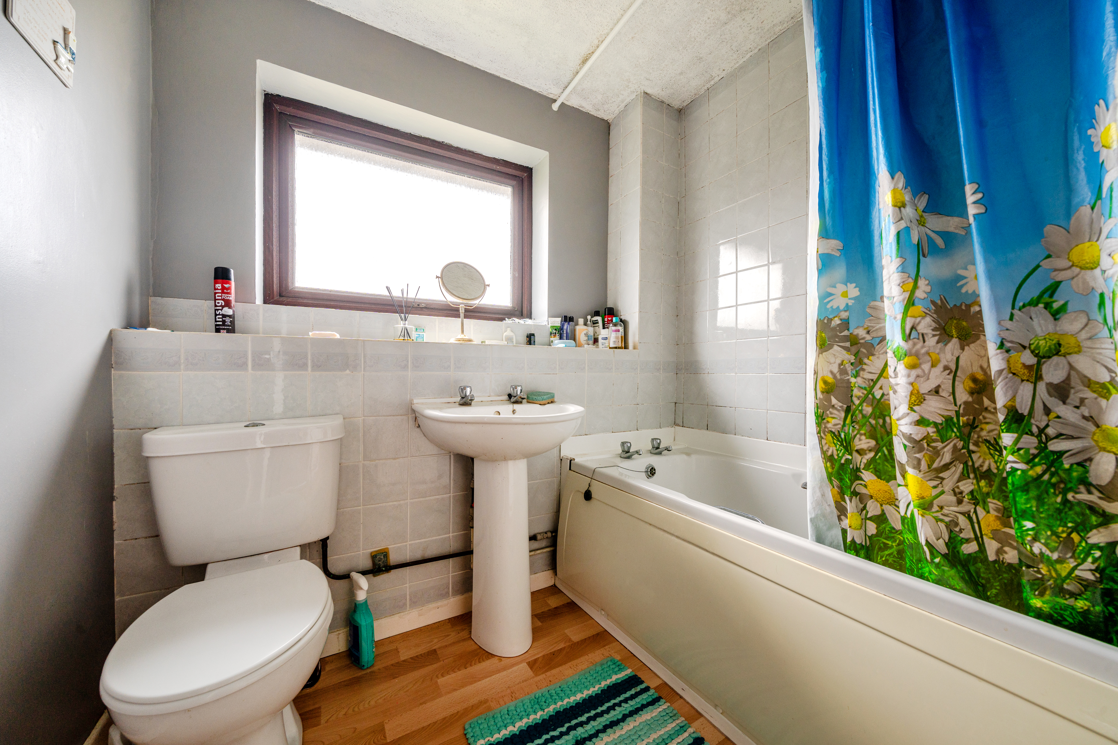 The first-floor landing, with a window allowing generous natural light, leads to three bedrooms. The principal bedroom, positioned at the front, includes a built-in double wardrobe, while the second double bedroom enjoys a rear aspect and also features a built-in double wardrobe. The third bedroom is a single with a rear-facing window. The family bathroom comprises a white three-piece suite with a shower over the bath. The property benefits from a newly installed gas combination boiler (2025), housed within the airing cupboard.