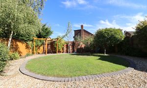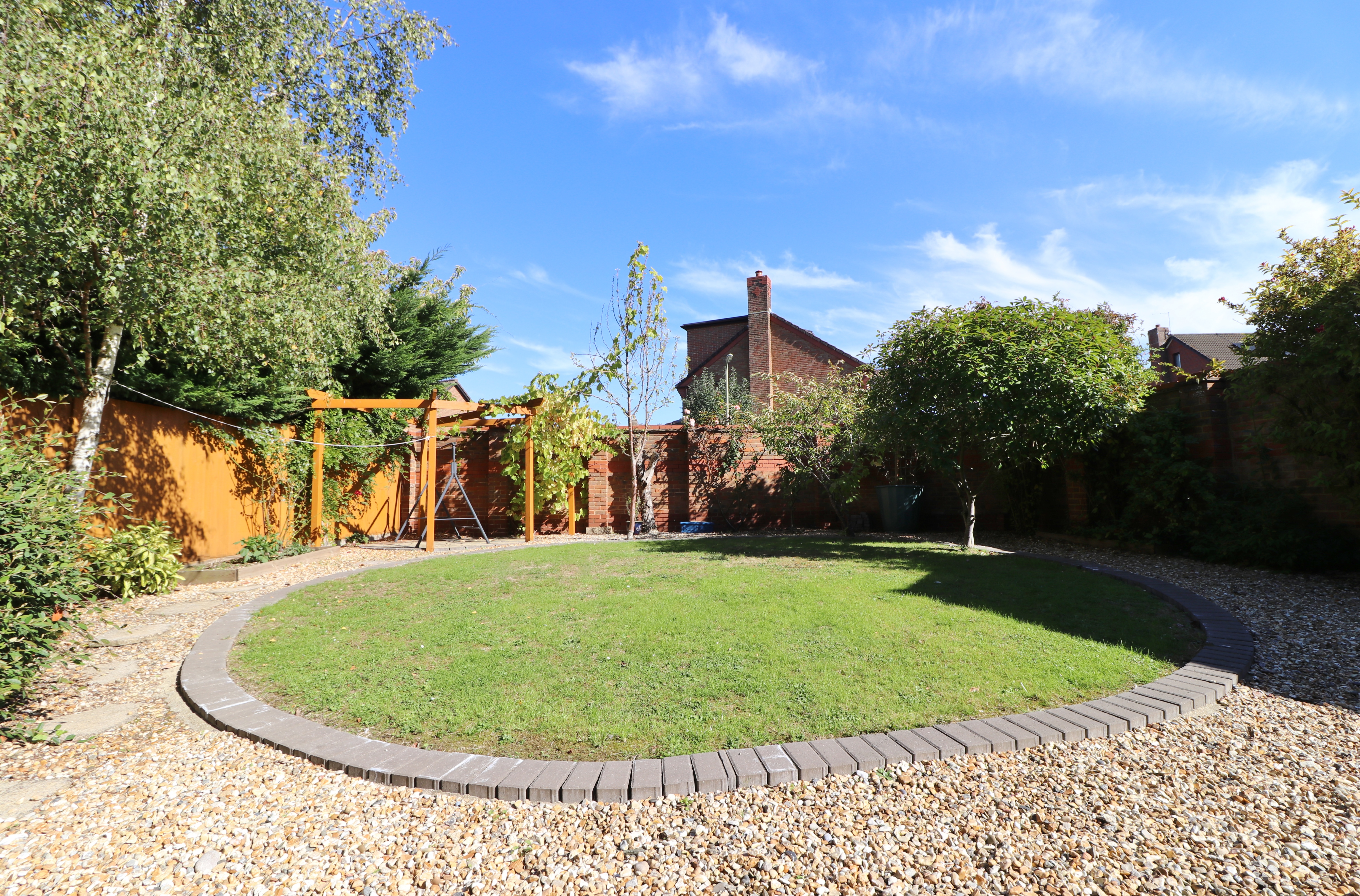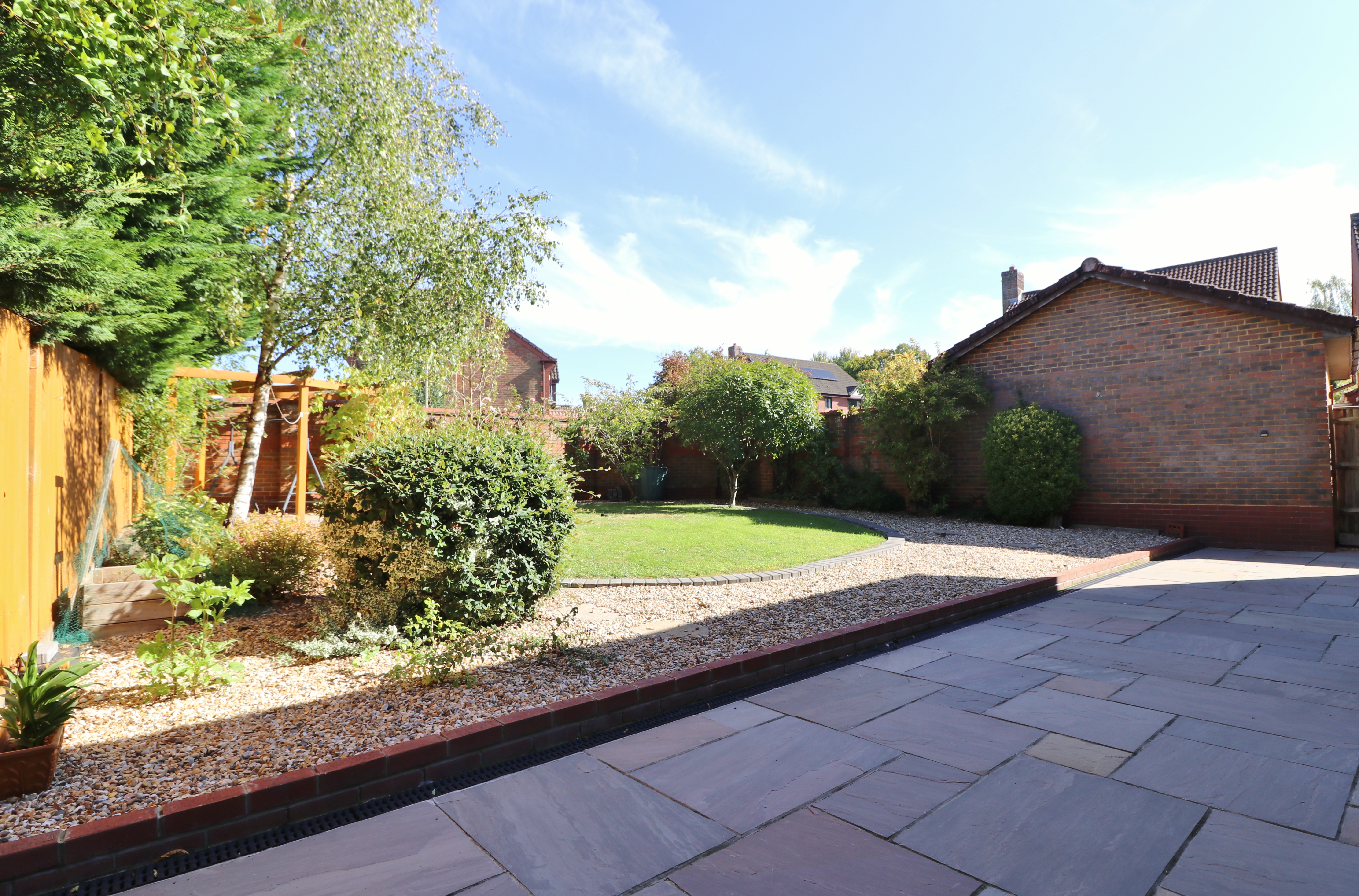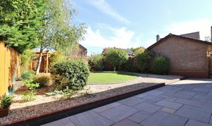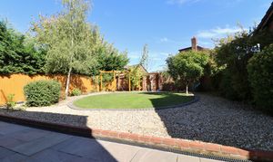 To the front there is ample driveway parking, leading to the attached double garage. Gated side access leads round to the beautiful rear garden which has been landscaped to provide a large, paved seating area which wraps around to the side, a circular section of lawn surrounded by shingle and planted borders.