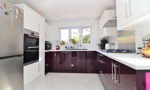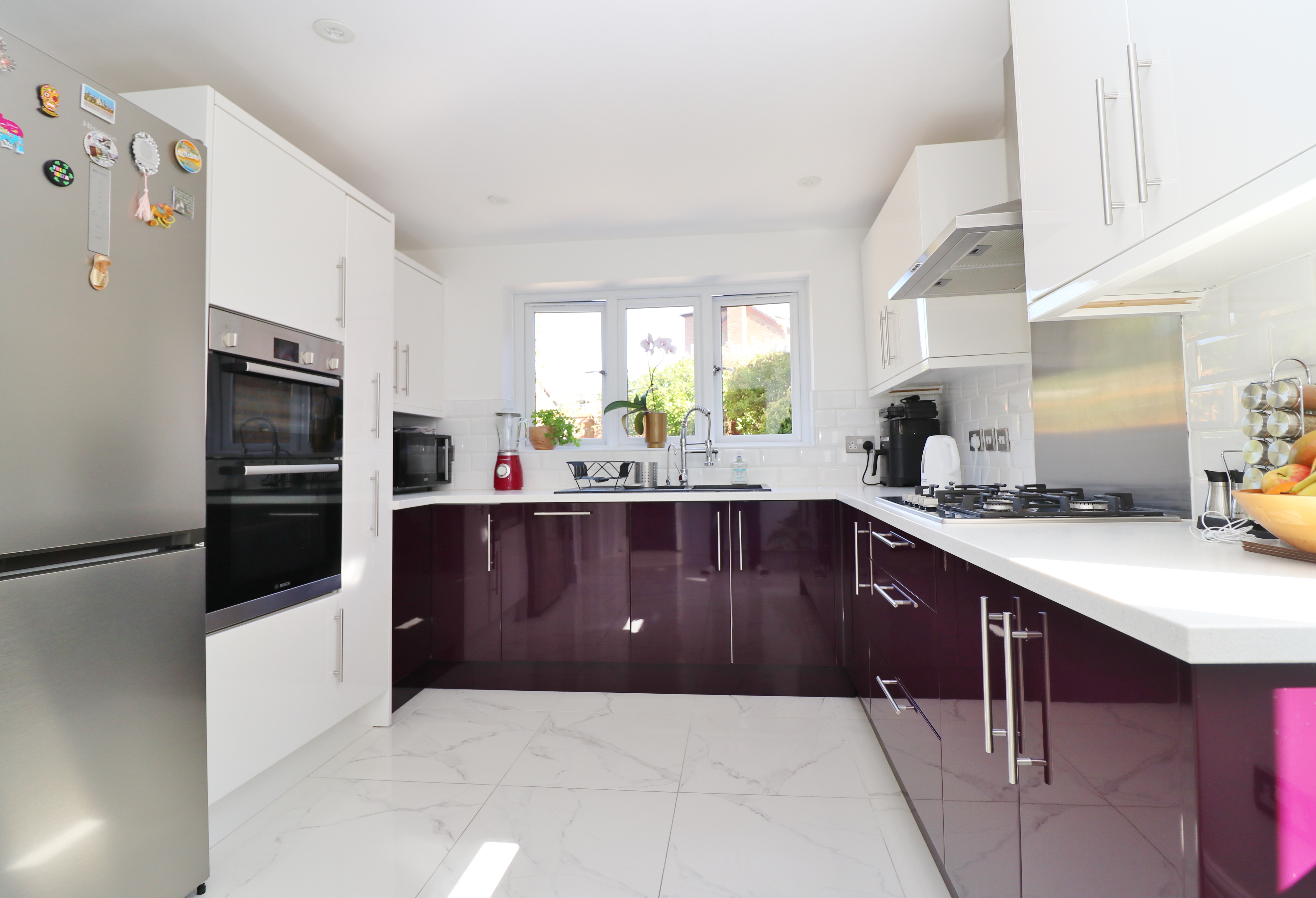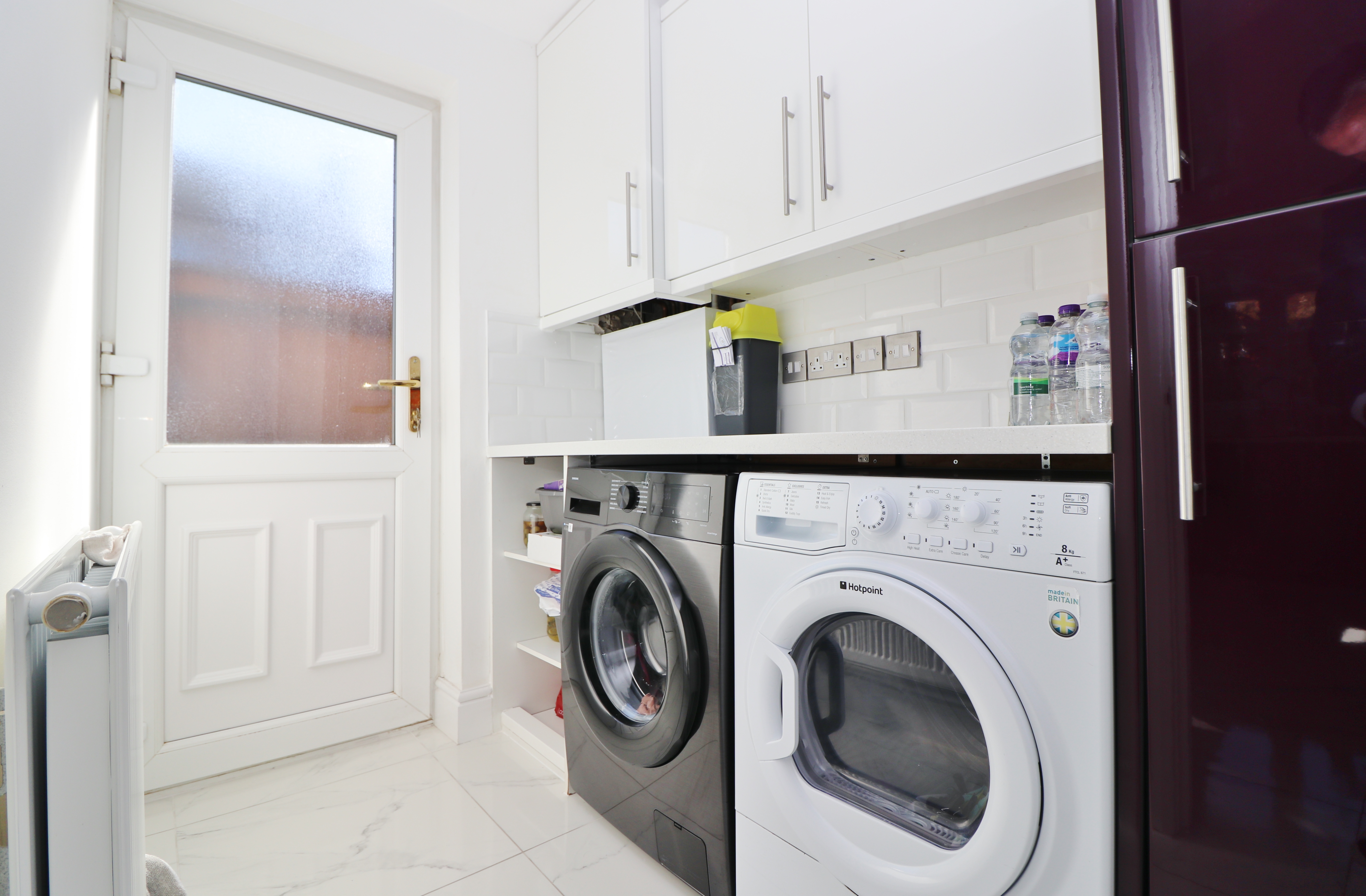 The kitchen has been fitted with a modern range of wall and base units with a built-in double oven and gas hob with extractor over, as well as an integrated dishwasher and space for a fridge/freezer. There are windows to the side and rear and a door leading through to the utility which has further fitted units, space for a washing machine and tumble, and a door to the side.