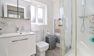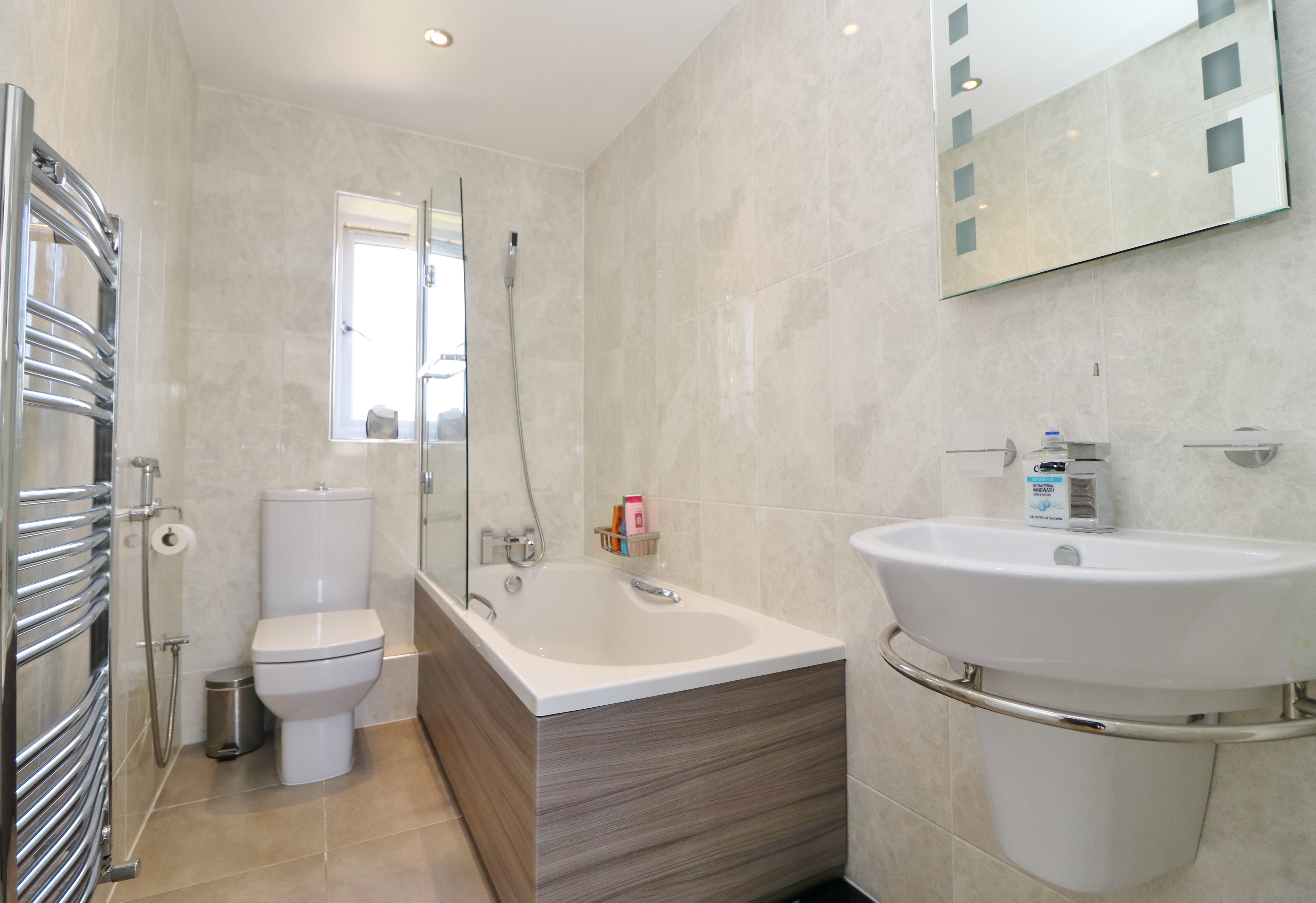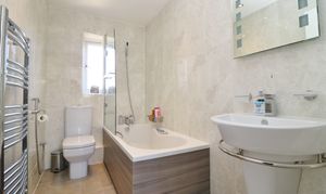 The modern family bathroom has a window to the rear and has been fitted with a panel enclosed bath with shower attachment and screen over, wash hand basin and WC.
