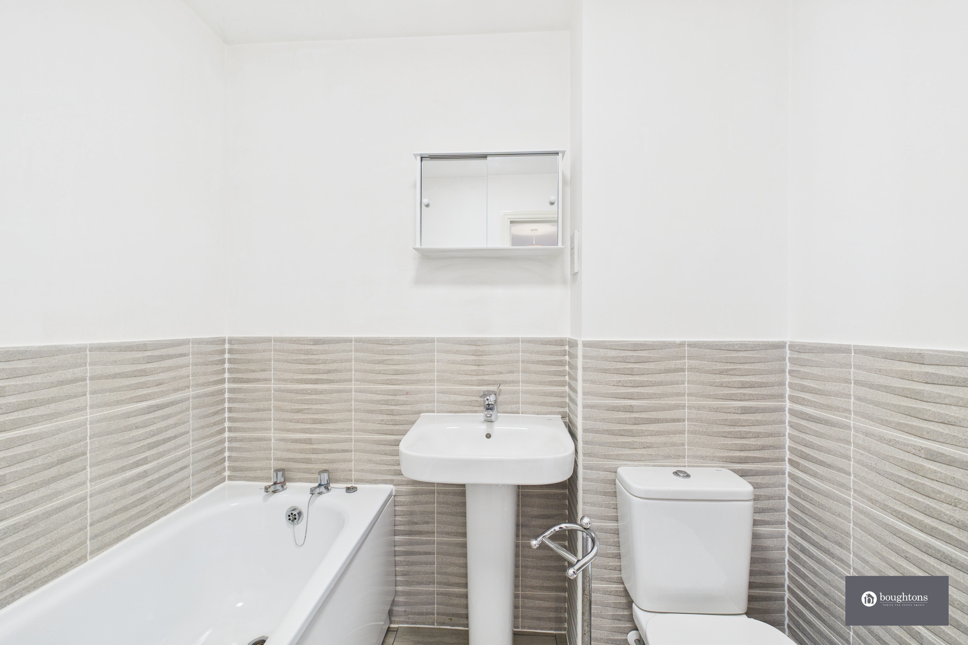 - Modern, partially tiled family bathroom featuring bath, sink, W.C. and mirrored storage cupboard