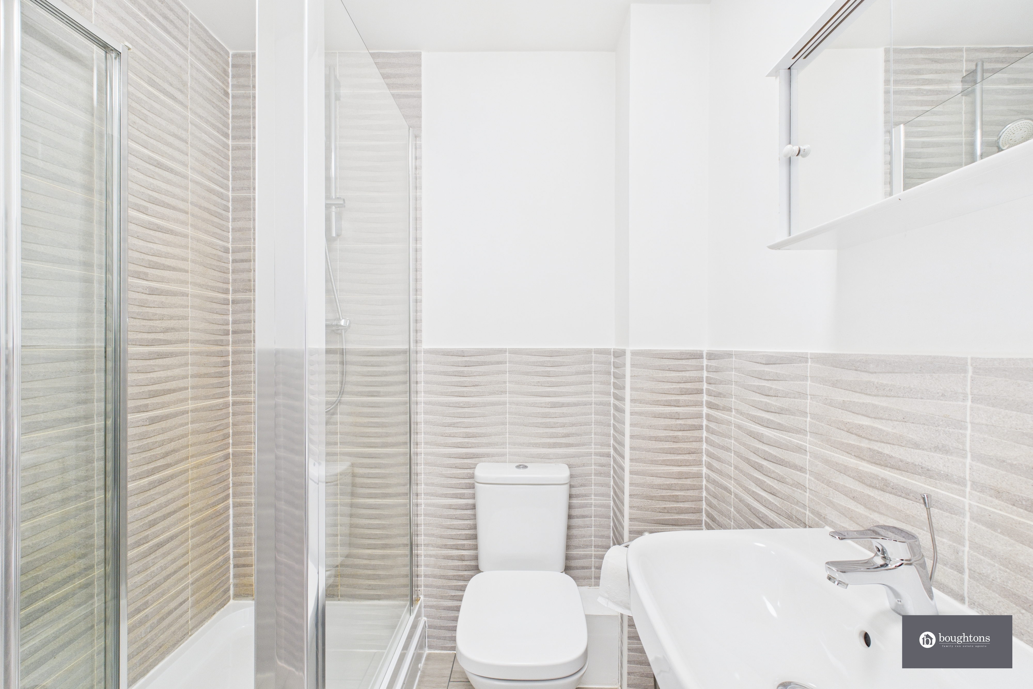 Upstairs is home to three well-proportioned bedrooms. The master and second bedrooms both benefit from built-in mirrored wardrobes, with the main bedroom further enhanced by a stylish en-suite shower room featuring a shower cubicle, sink, W.C., mirrored storage cupboard, and heated towel rail. The modern family bathroom mirrors the en-suite design, offering a partially tiled finish with a bathtub, sink, W.C., and mirrored storage cupboard.