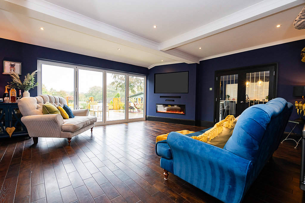 Built in media wall with electric fire place. Large bifolds showcasing the garden and double doors leading to kitchen.