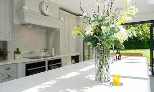 Large central island with stylish pendant lighting and a variety of storage units featuring white worktops. It includes a Stoves gas hob, a Miele fridge freezer, and a wine fridge.