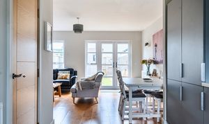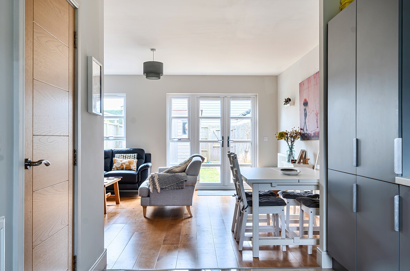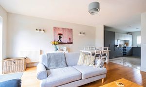 On the ground floor, the property opens into a bright and expansive open-plan kitchen and sitting room, stretching over 32 feet in length. This generous space is perfect for both everyday living and entertaining, with room for dining, relaxing, and cooking. A convenient ground-floor cloakroom is near the entrance, along with access to the staircase leading upstairs.