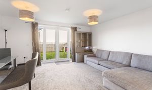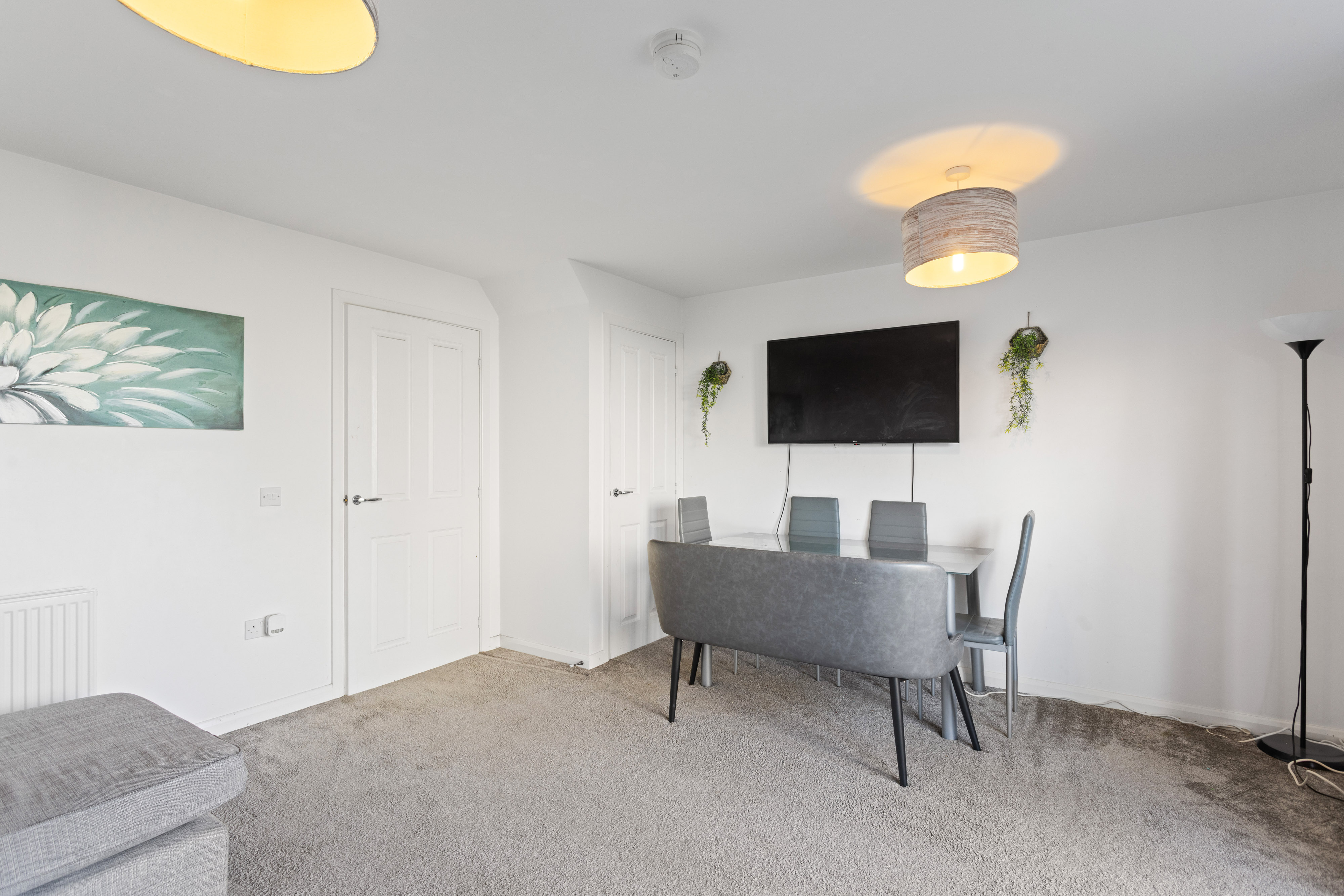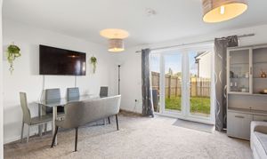 To the rear of the home lies the open plan lounge and dining area, a spacious and versatile living space that comfortably accommodates two large sofas and a media wall, along with dining space for four. A generous under stair cupboard provides additional storage. Patio doors open directly onto the rear garden, creating a seamless indoor outdoor flow ideal for entertaining.