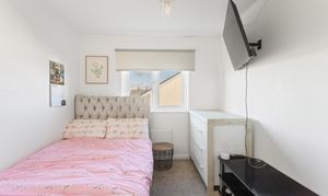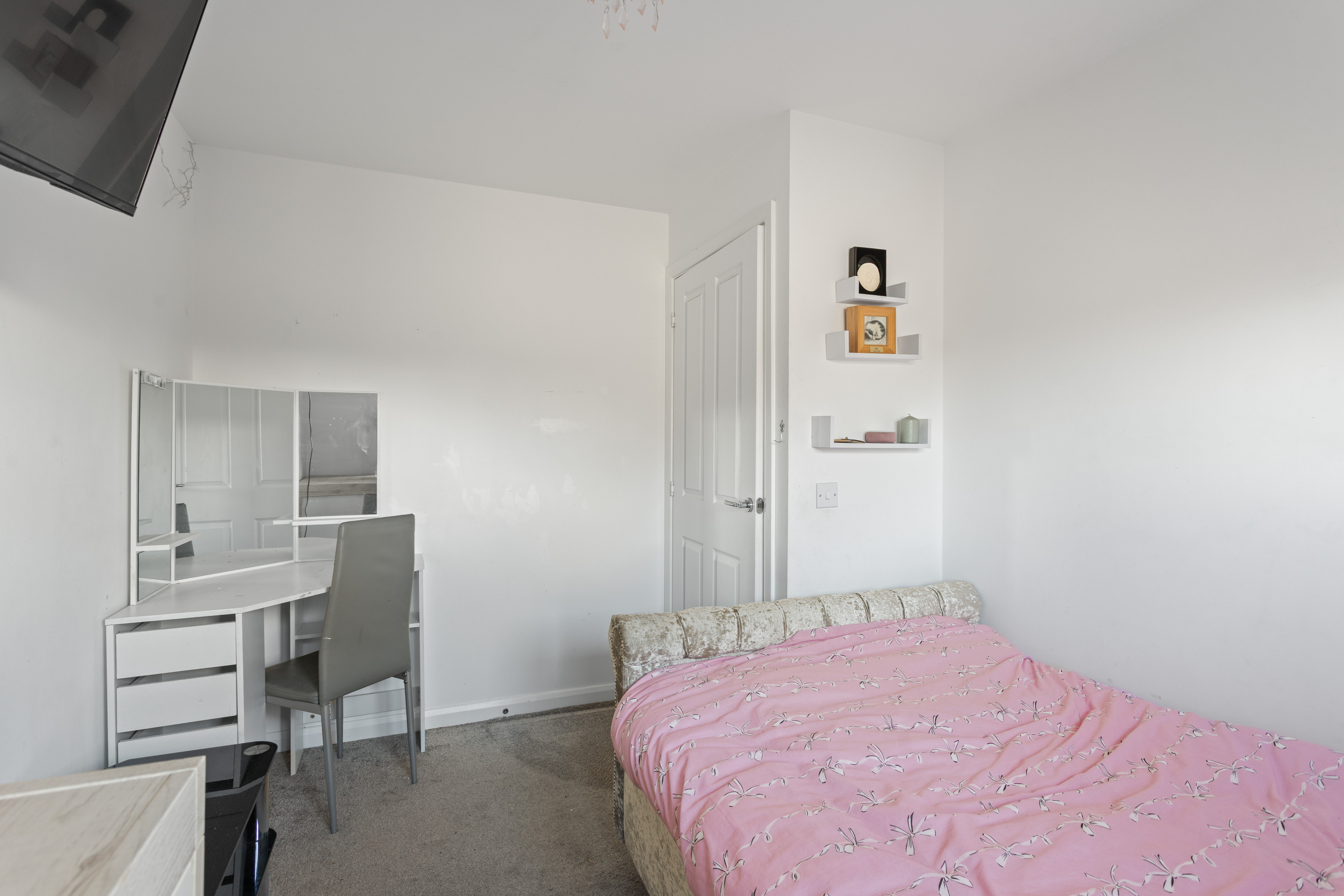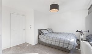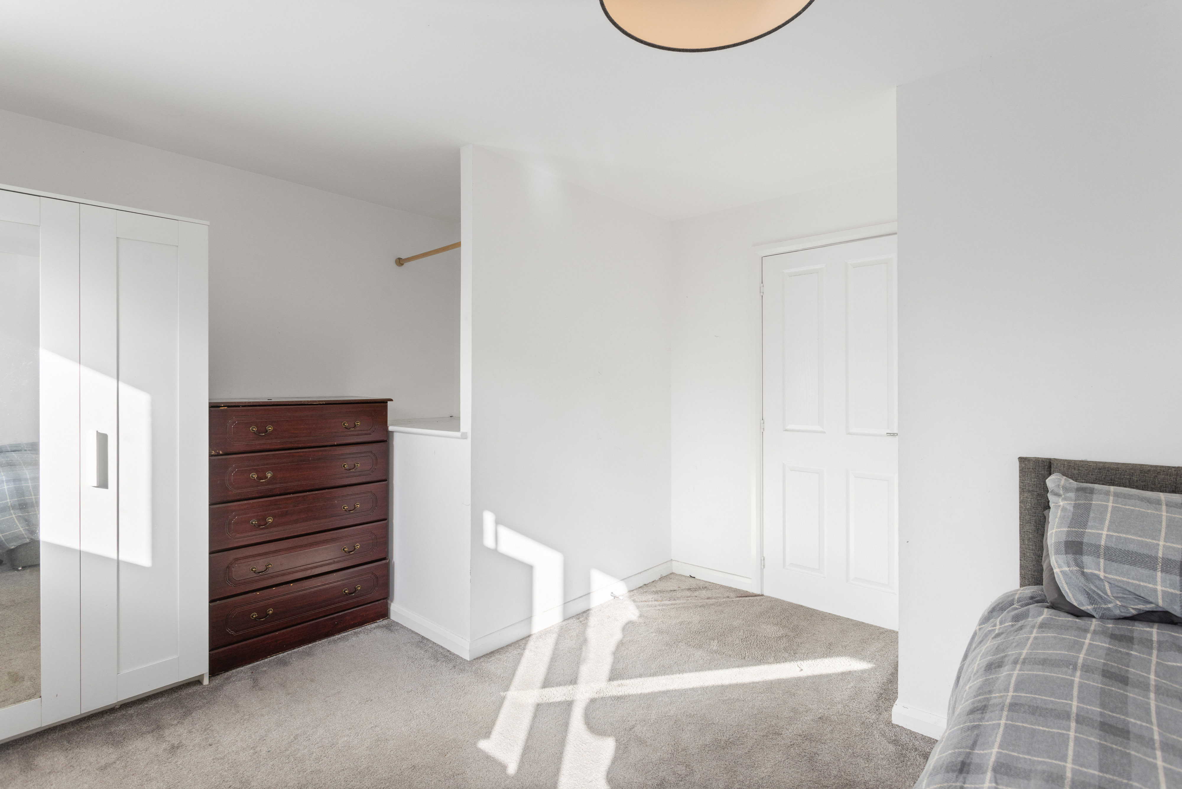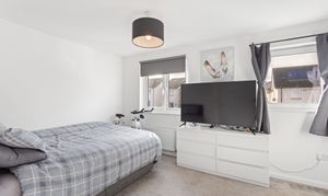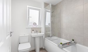 Upstairs, the property offers three well proportioned bedrooms. The principal bedroom is a generous size, comfortably accommodating a king size bed with bedside cabinets and space for wardrobe furniture and benefits from dual aspect windows which enhance the natural light. Bedroom two is another good sized double room, while bedroom three is ideal as a single bedroom, nursery or home office. The family bathroom is centrally located and comprises a modern three piece suite with a bathtub and overhead shower, fully tiled around the bath area and finished with a chrome heated towel rail.