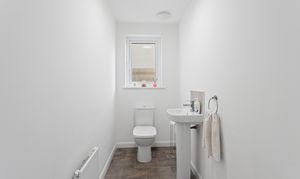 Continuing along the hallway, the downstairs WC is finished with splashback tiling and chrome accents, providing practical convenience for guests and day to day living.