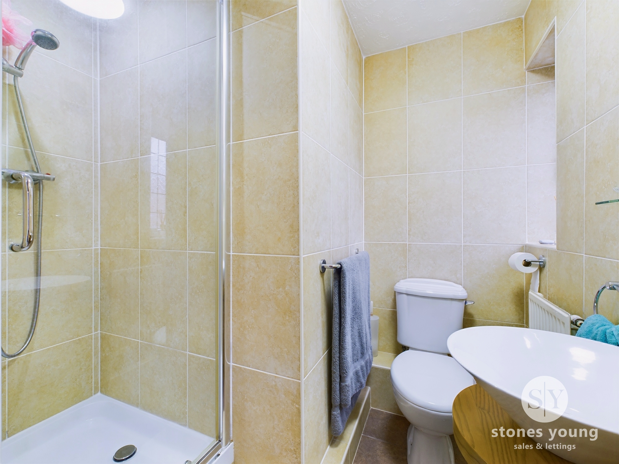 Three piece in white including shower enclosure with mains fed shower, vanity unit housing sink, tiled floor to ceiling, tilted flooring, uPVC double glazed frosted window, panel radiator.