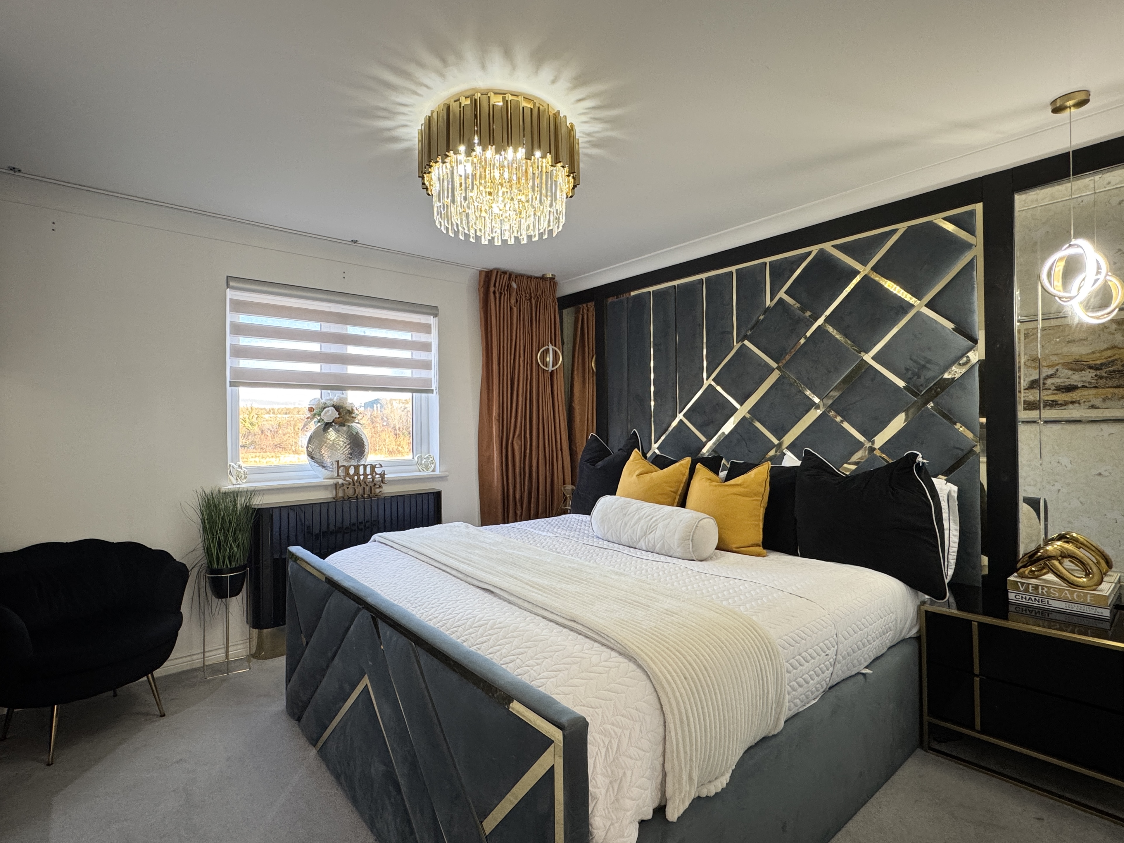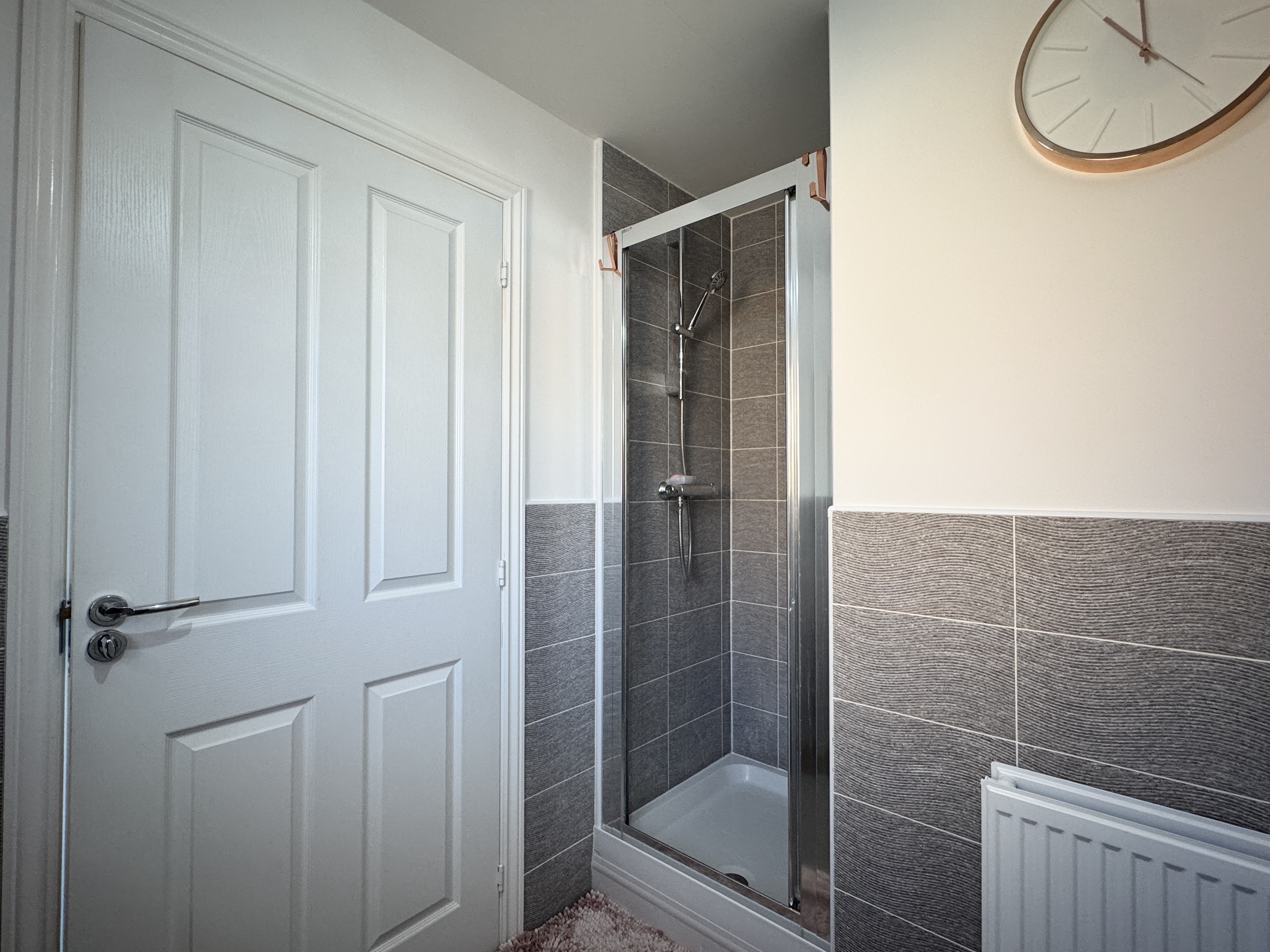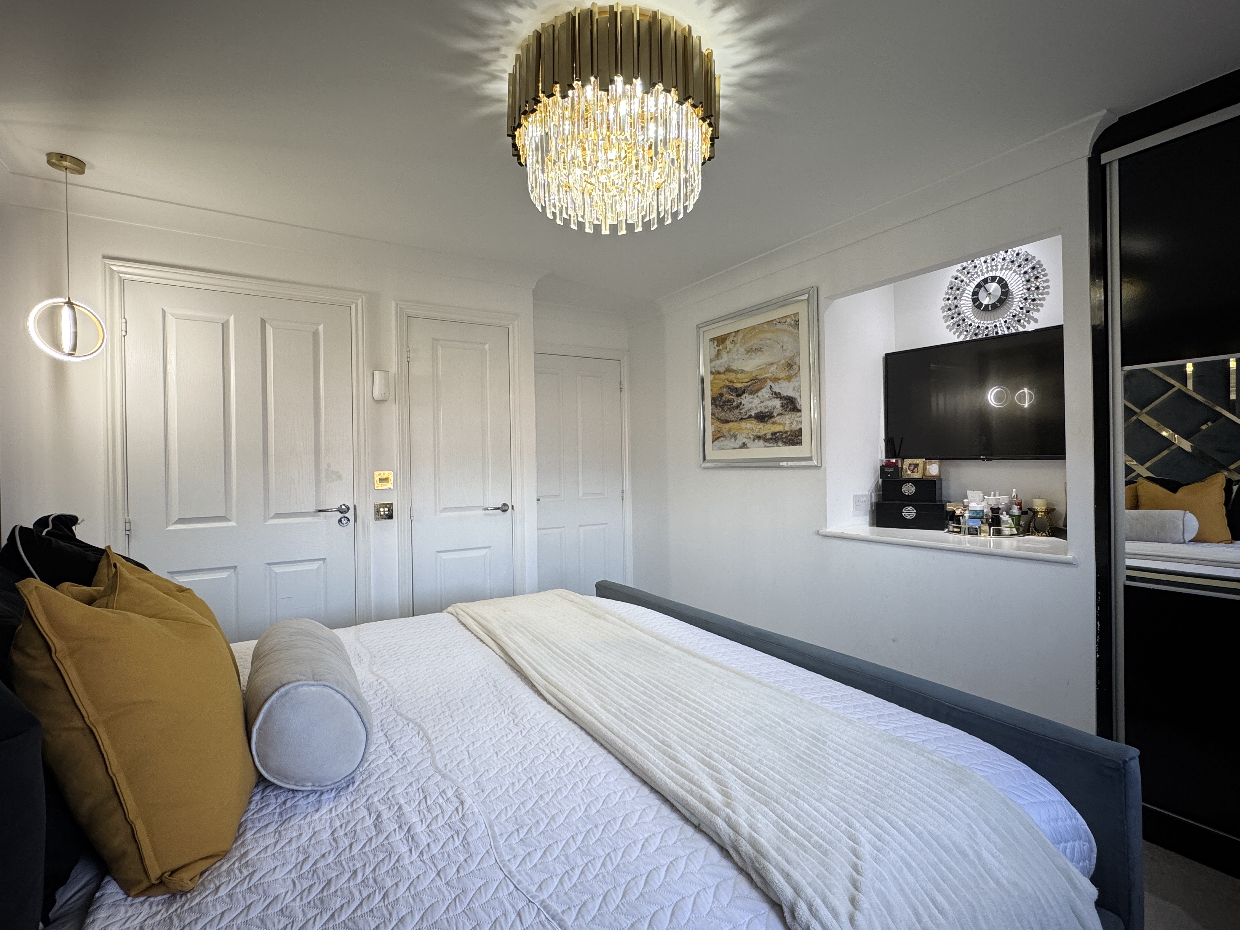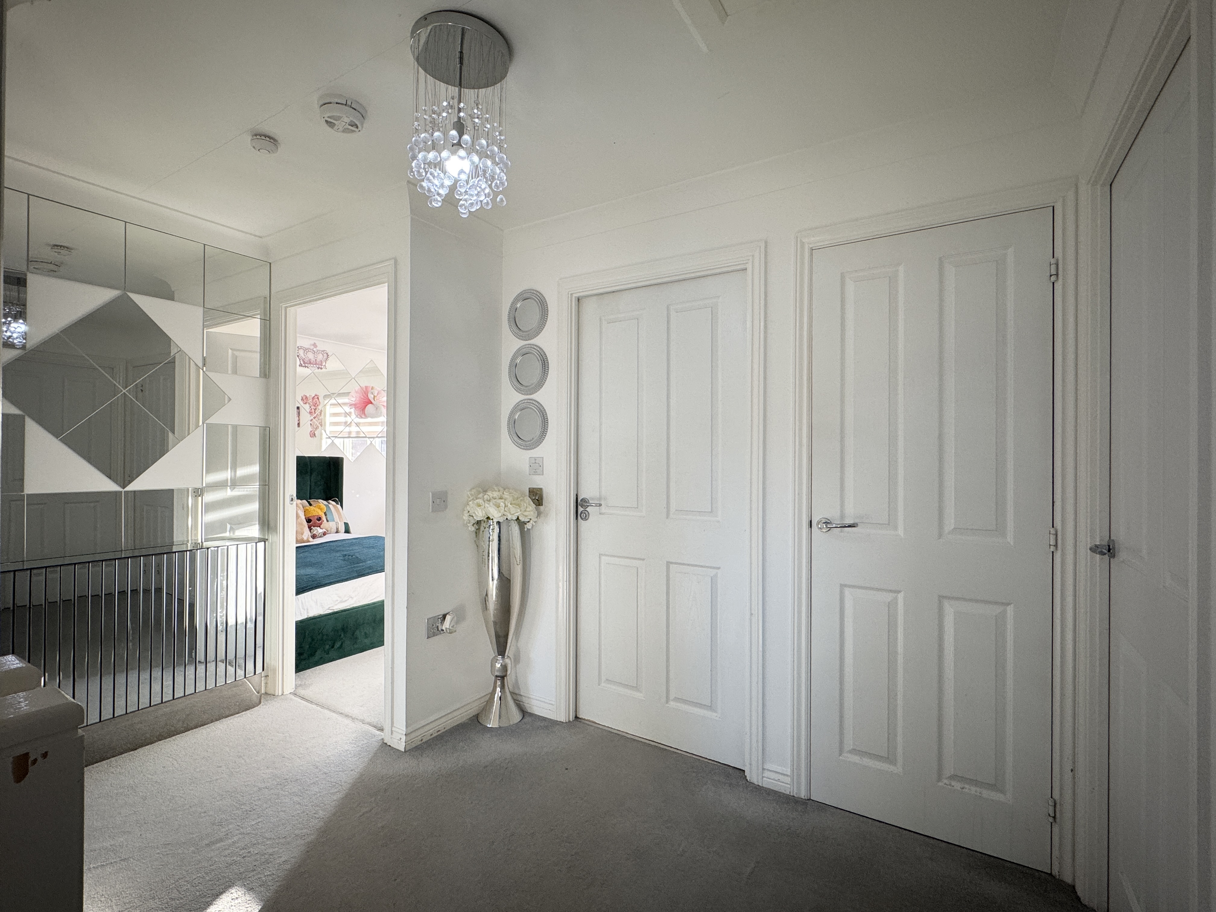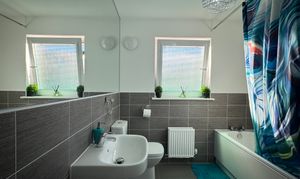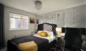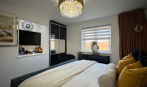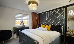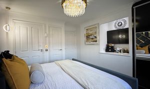 Ascend the staircase to find a spacious upper landing with a handy cupboard for storage. The upper level hosts four double bedrooms, with a Jack n Jill bathroom shared between bedrooms 2 and 3. The master bedroom and bedroom 2 both feature fitted mirrored wardrobes, offering ample storage solutions. The master bedroom further benefits from a tastefully appointed en-suite bathroom. Notably, the master bedroom comfortably accommodates a super king-size bed, while the remaining three bedrooms have king-size beds (not included).