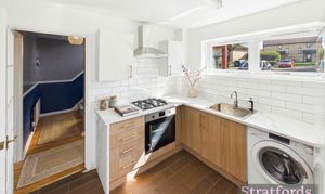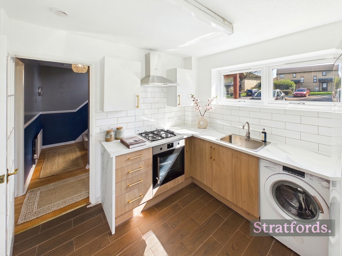 This three-bedroom semi-detached house is located in Emerson Valley, Milton Keynes. The ground floor comprises a fitted kitchen with gas hob, oven, washing machine, and fridge/freezer, alongside a generous living room with patio doors leading to the rear garden. A hallway provides access to both ground-floor rooms and the staircase.