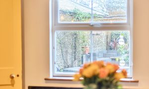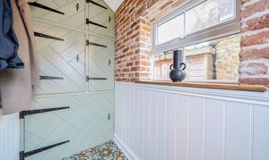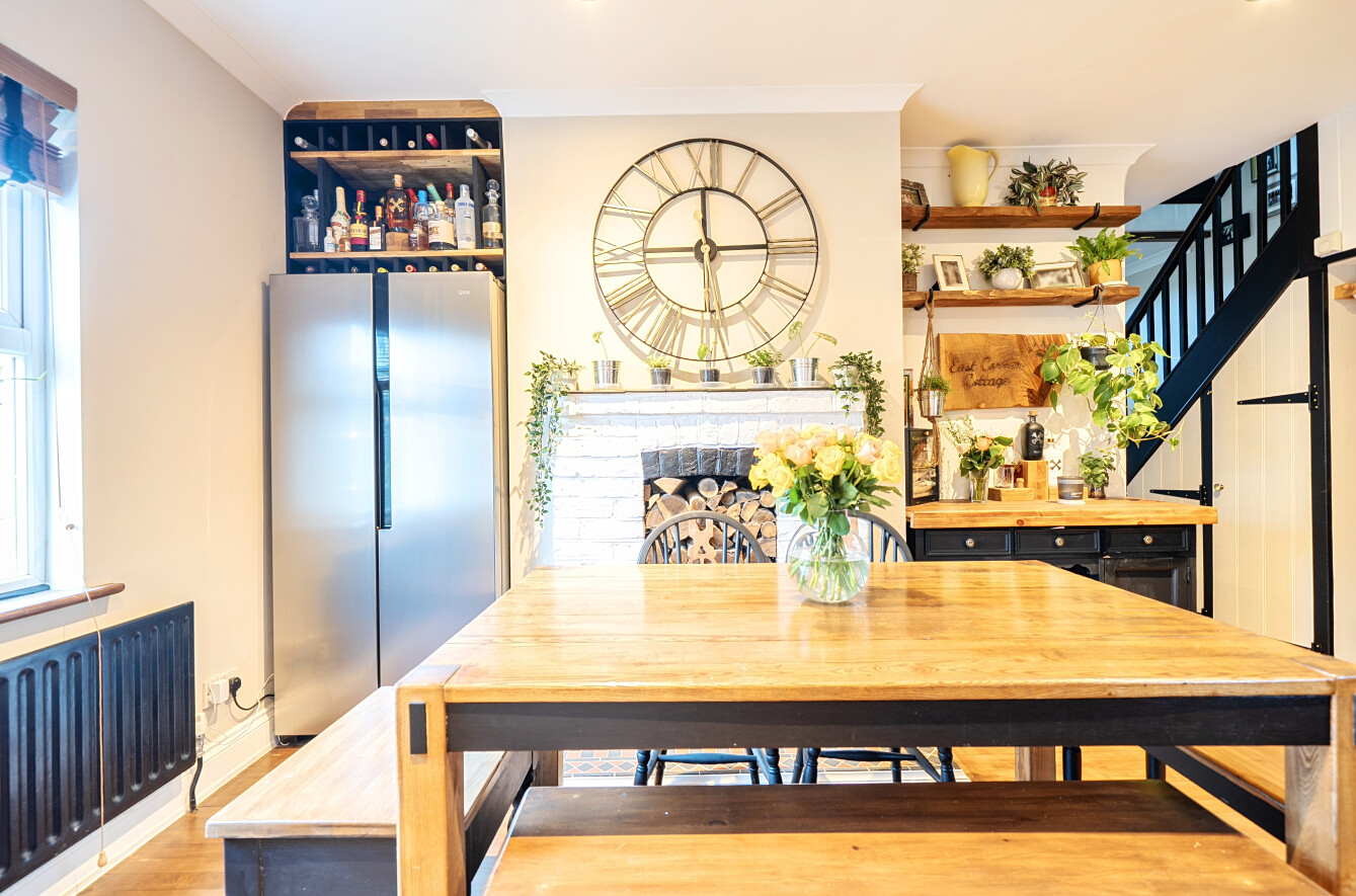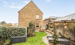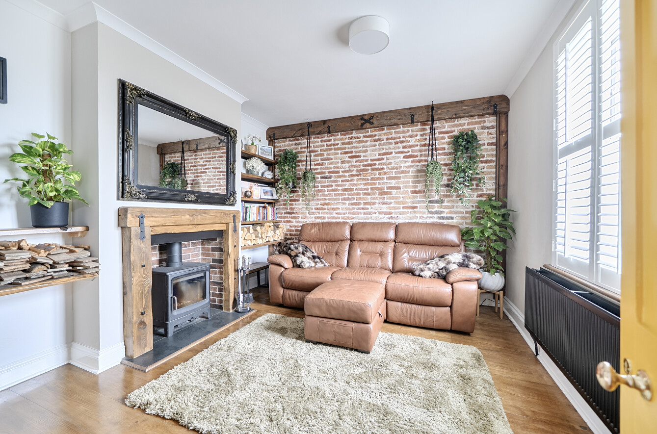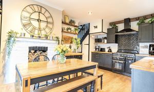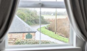 Approached via gentle rising steps, the front door opens into a welcoming traditional entrance hall. The elegant yet cosy sitting room is rich in character, featuring a mellow exposed brick wall, a wood-burning stove and picturesque views across the farmland, a truly inviting space for relaxed country living. To the rear, the spacious kitchen/dining room is appointed with classic shaker-style cabinetry, a porcelain butler sink, integrated cooker hood and dishwasher, seamlessly combining timeless design with modern convenience. A useful utility room provides further storage, space and plumbing for a washing machine and houses the oil-fired boiler. The first floor offers three bedrooms, including two doubles and a charming single bedroom which is currently utilised as a dressing room, all served by a stylish contemporary bathroom.