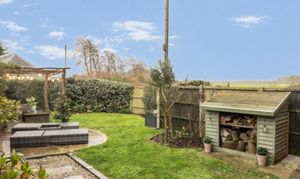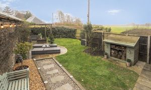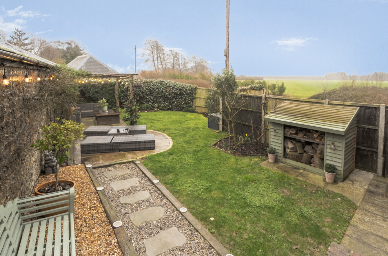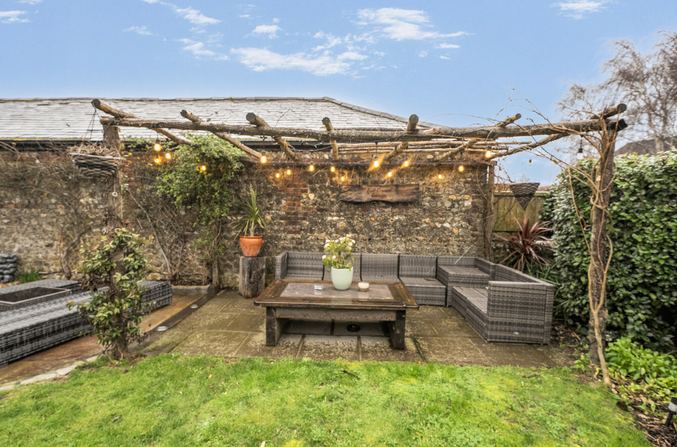 Externally, the property continues to impress with a meticulously landscaped, secluded south-facing garden, designed for both relaxation and entertaining. An ornate extended patio provides two distinct seating areas, complemented by a lawn and a striking flint boundary wall with exterior lighting, elegantly adorned with climbing pink roses. Off-road parking for two vehicles completes this inviting home.