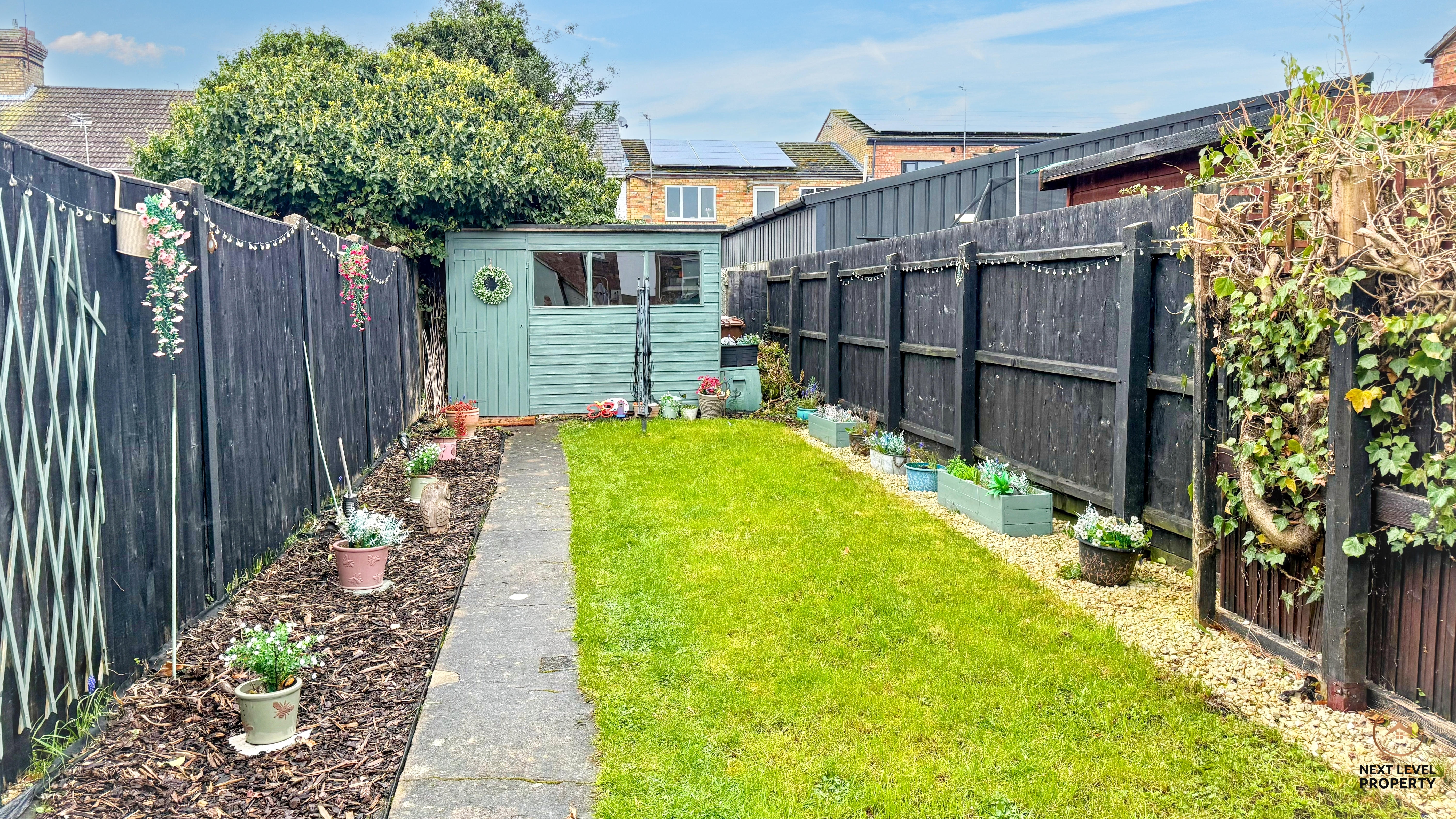 Outside, the rear garden is fully enclosed, making it ideal for both children and pets. A patio area provides the perfect spot for outdoor seating, while the lawn offers space to enjoy. A garden shed adds useful storage, and access is provided via a right of way to the side.