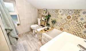 Fitted with a well-appointed suite, the bathroom offers both practicality and comfort, featuring a bath, separate walk-in shower cubicle, pedestal hand basin and close-coupled WC. A heated towel rail adds a touch of everyday luxury, while a UPVC window to the rear provides natural light and ventilation, creating a bright and functional space.