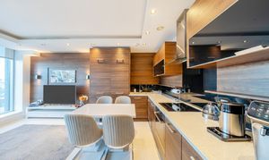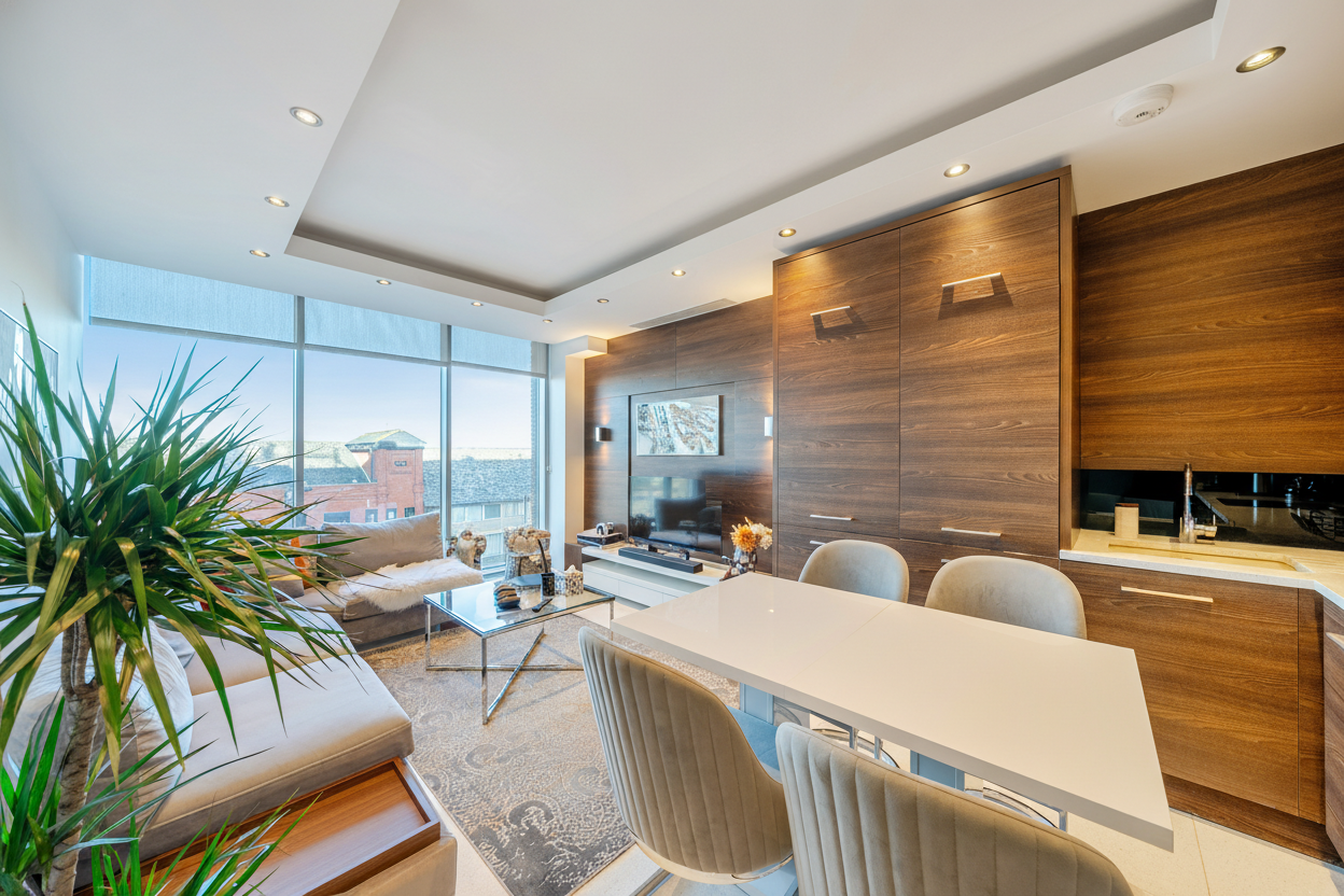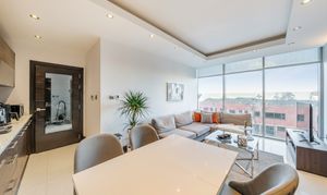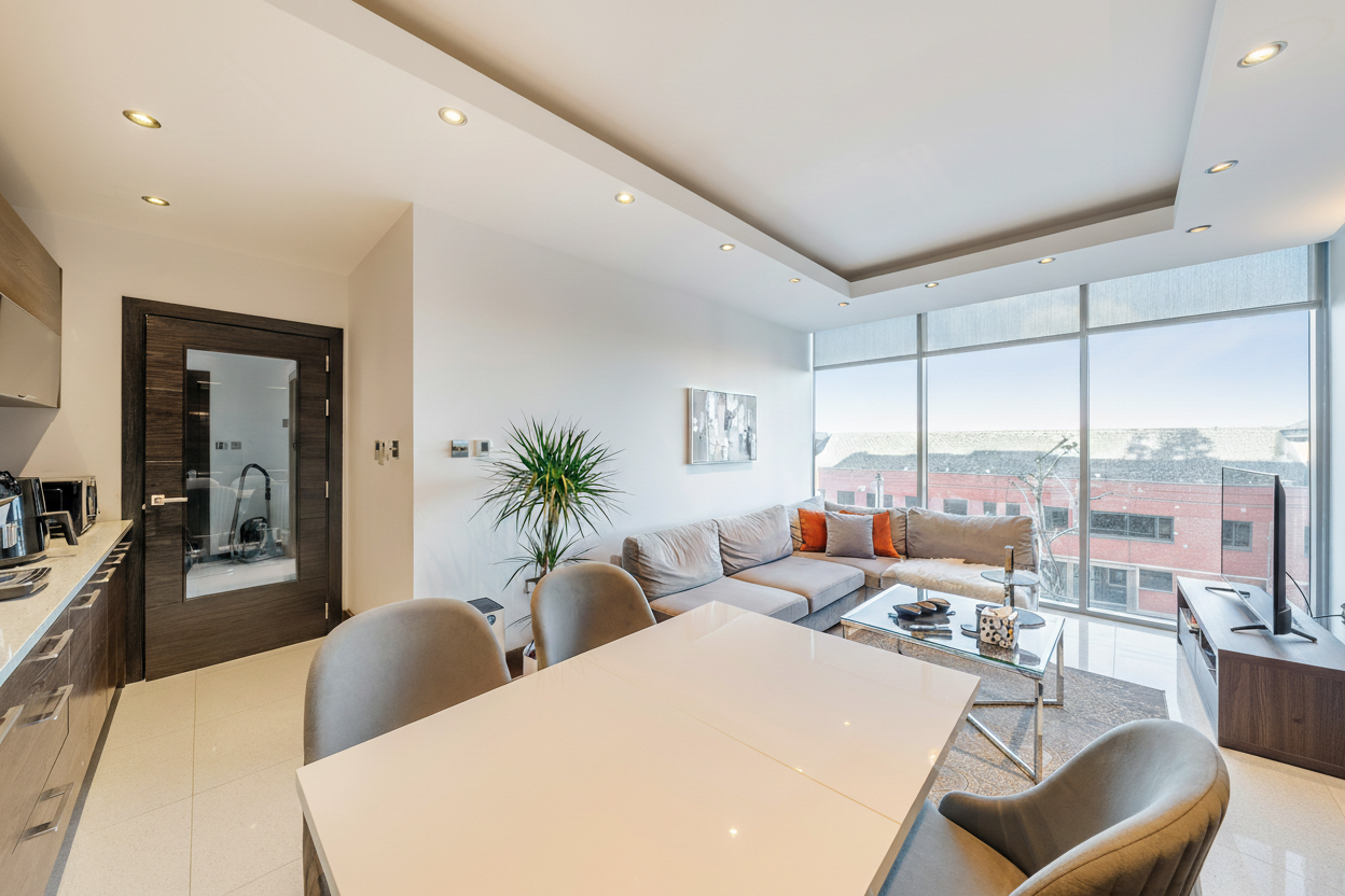 The apartment features a bright and spacious open-plan kitchen, living and dining area, creating a welcoming space that’s perfect for relaxing after a busy day or hosting friends. The contemporary kitchen is fitted with quality units and integrated appliances, blending seamlessly into the living space to enhance everyday living.