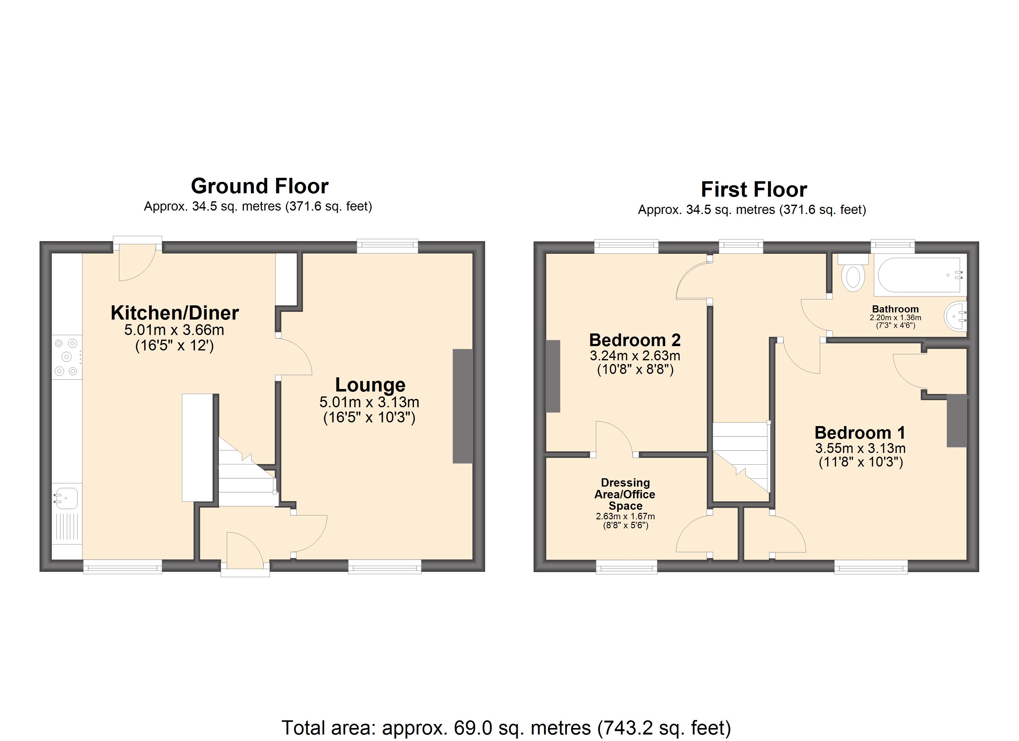 The open plan kitchen and dining area offers cooking appliances alongside a generous, dual aspect lounge which is flooded with natural light. The first floor hosts two good-sized bedrooms, with plenty of space for stand-alone and fitted furniture, complimented by a modern bathroom with a three-piece suite. Bedroom two benefits from a separate dressing/office space. To the rear is an enclosed garden, an excellent space for hosting friends and family and with a good-sized lawn allowing plenty of room for children to play.