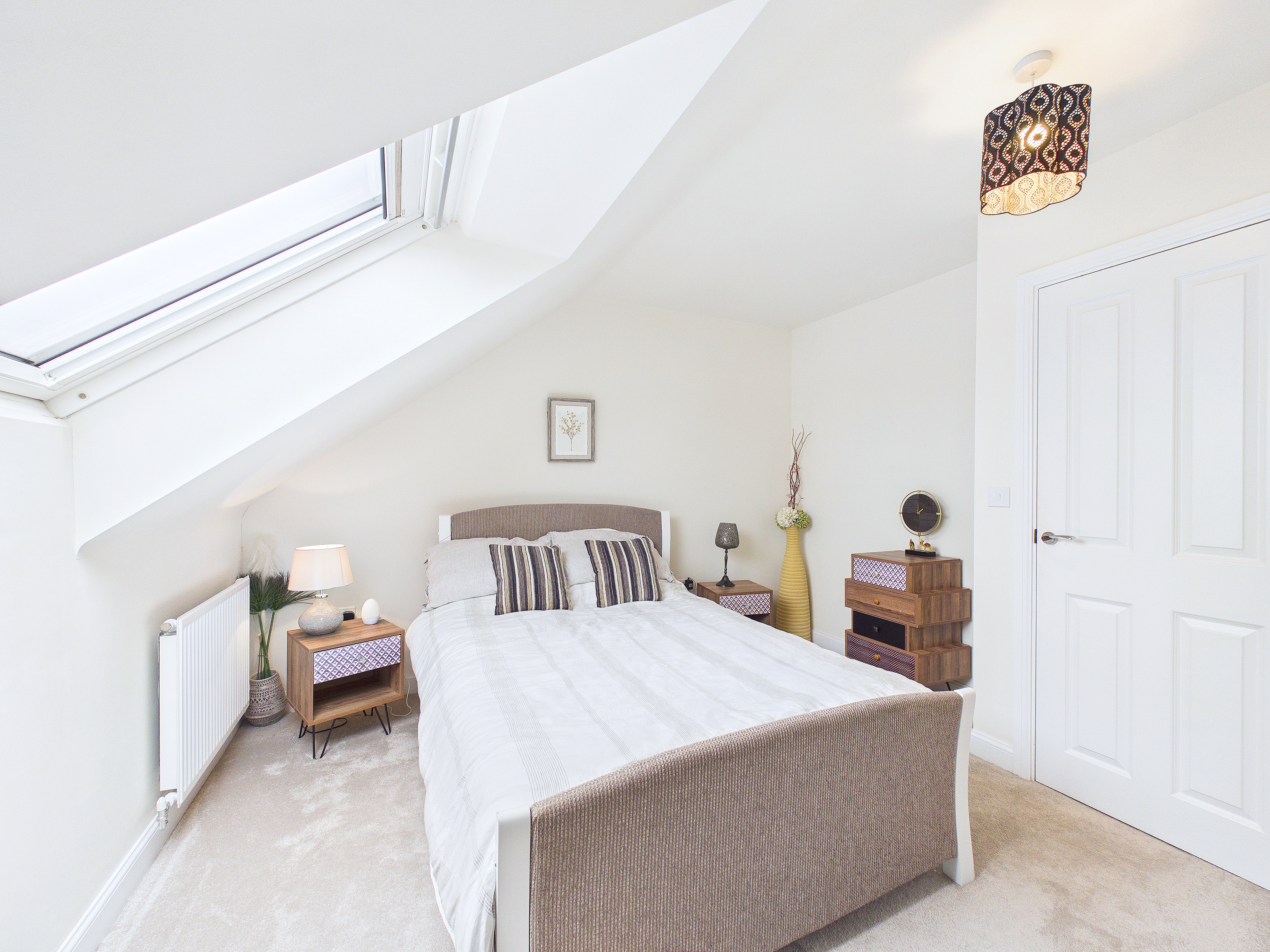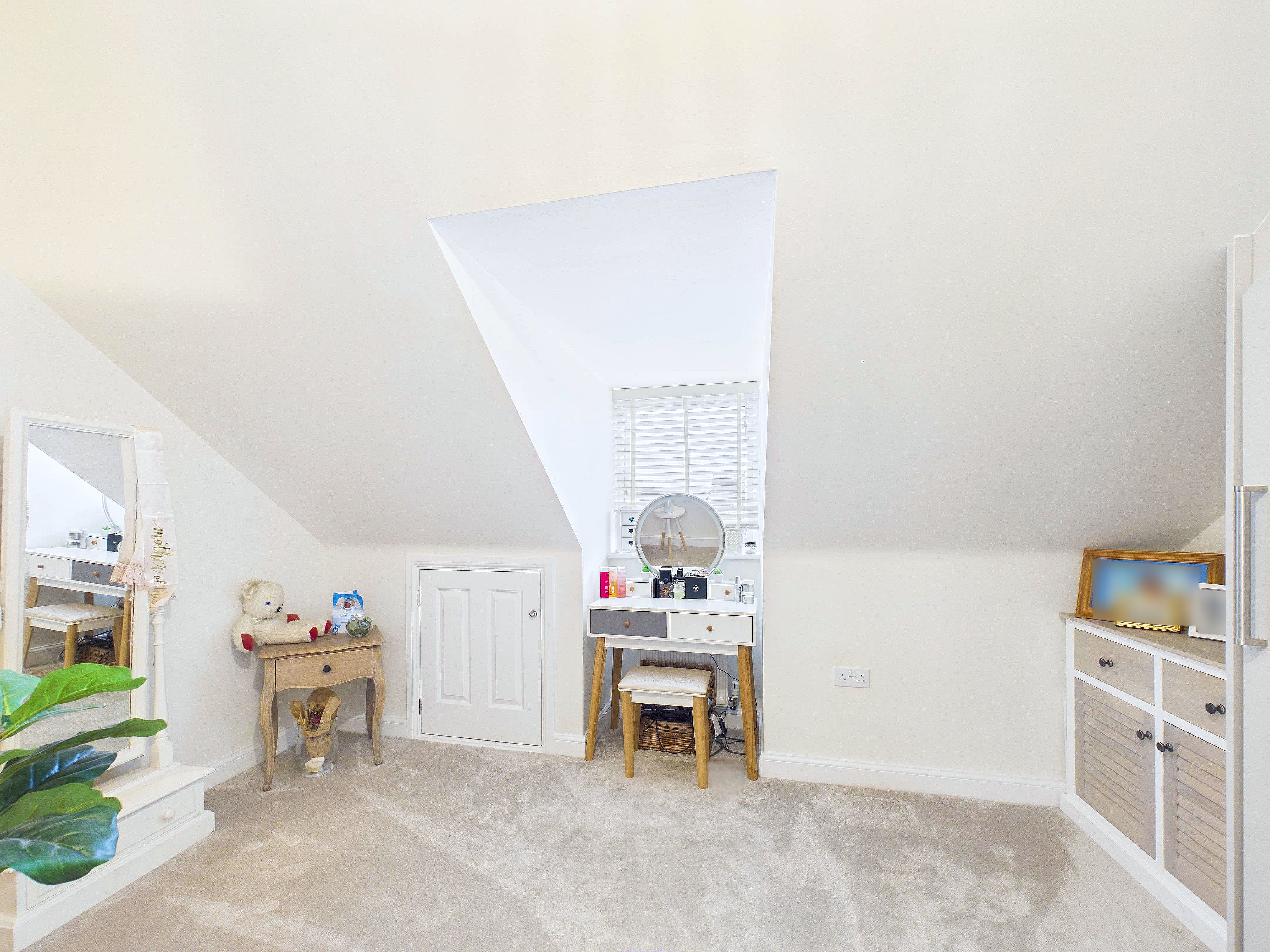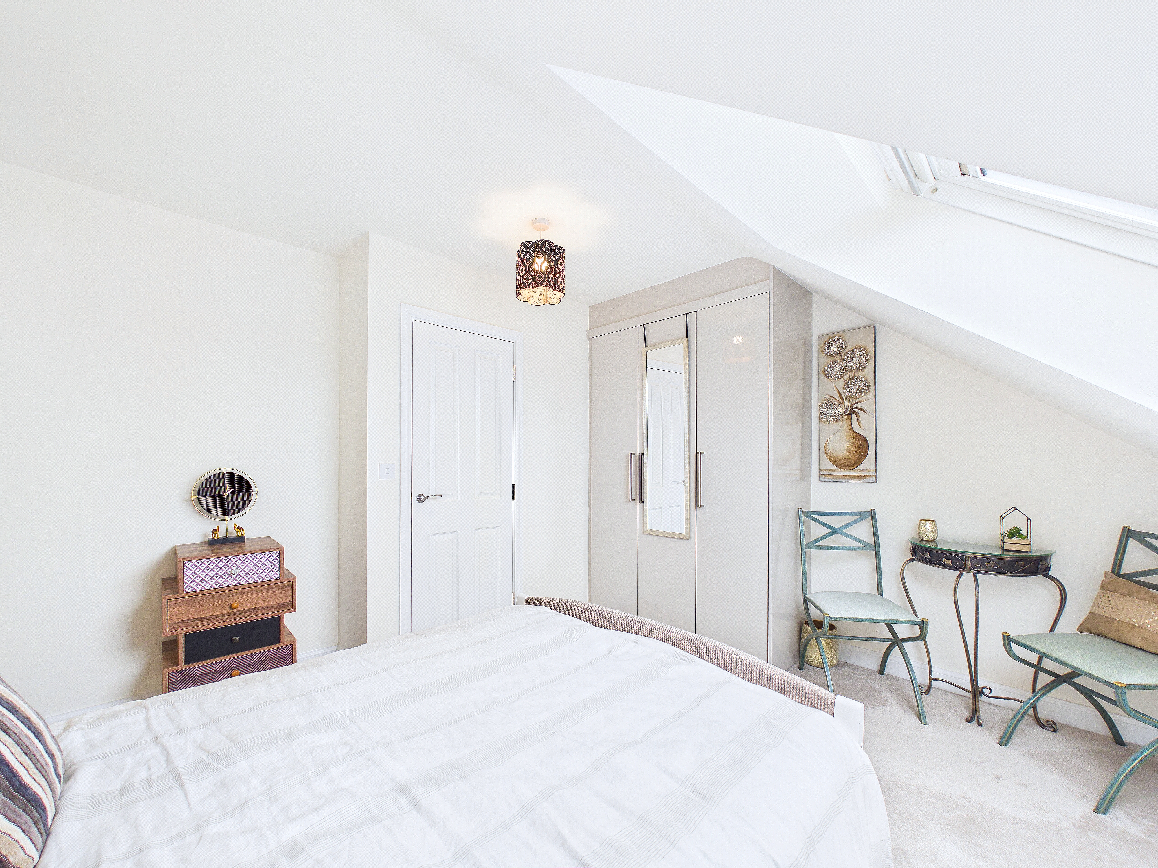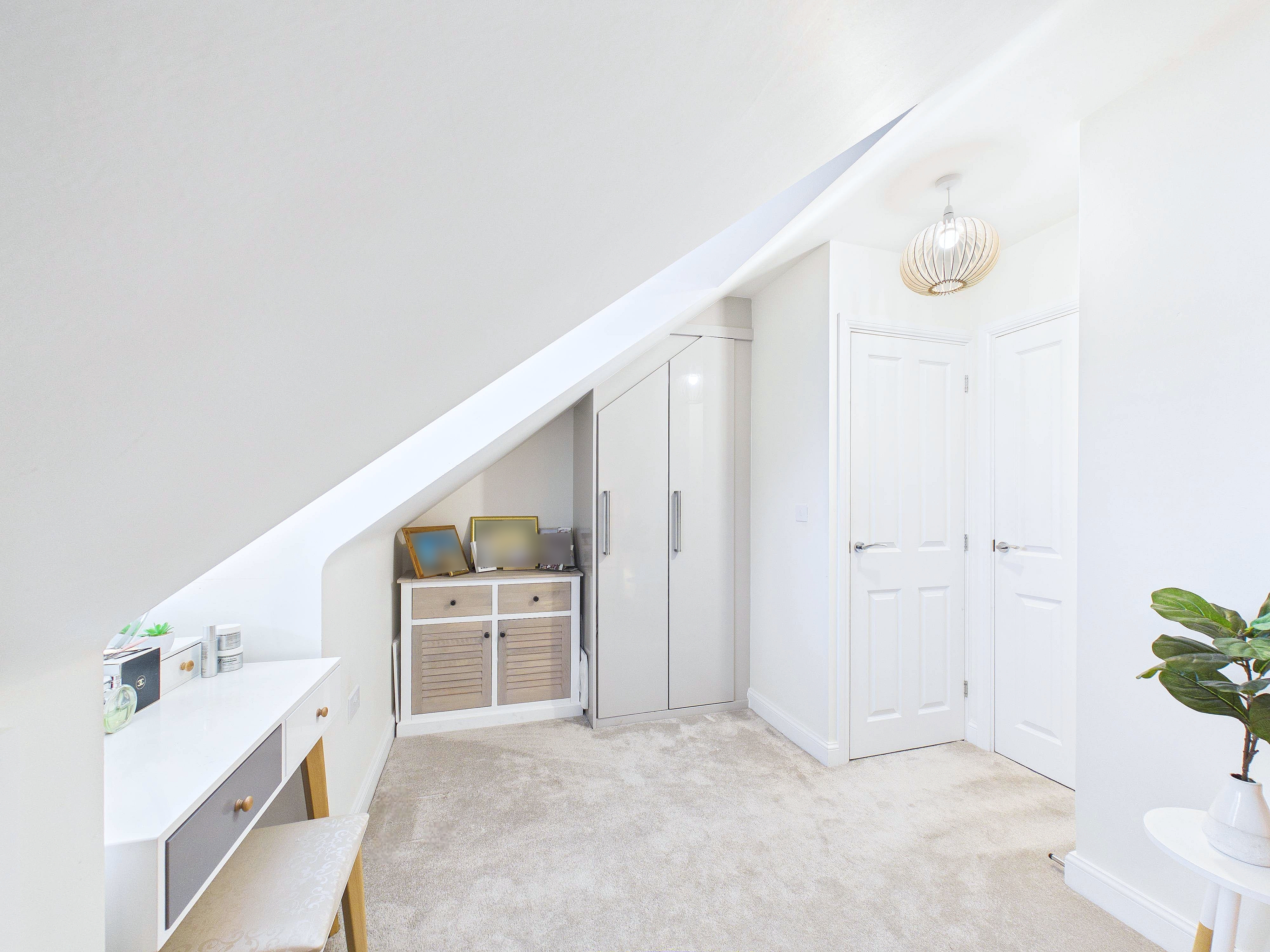 The second floor hosts two further bedrooms, both thoughtfully arranged to maximise space and usability. These rooms benefit from fitted wardrobes, while additional storage can be found within the boarded eaves in bedroom 3, offering excellent hidden storage solutions. A contemporary family bathroom serves this level, finished with modern fittings and a clean, stylish design.