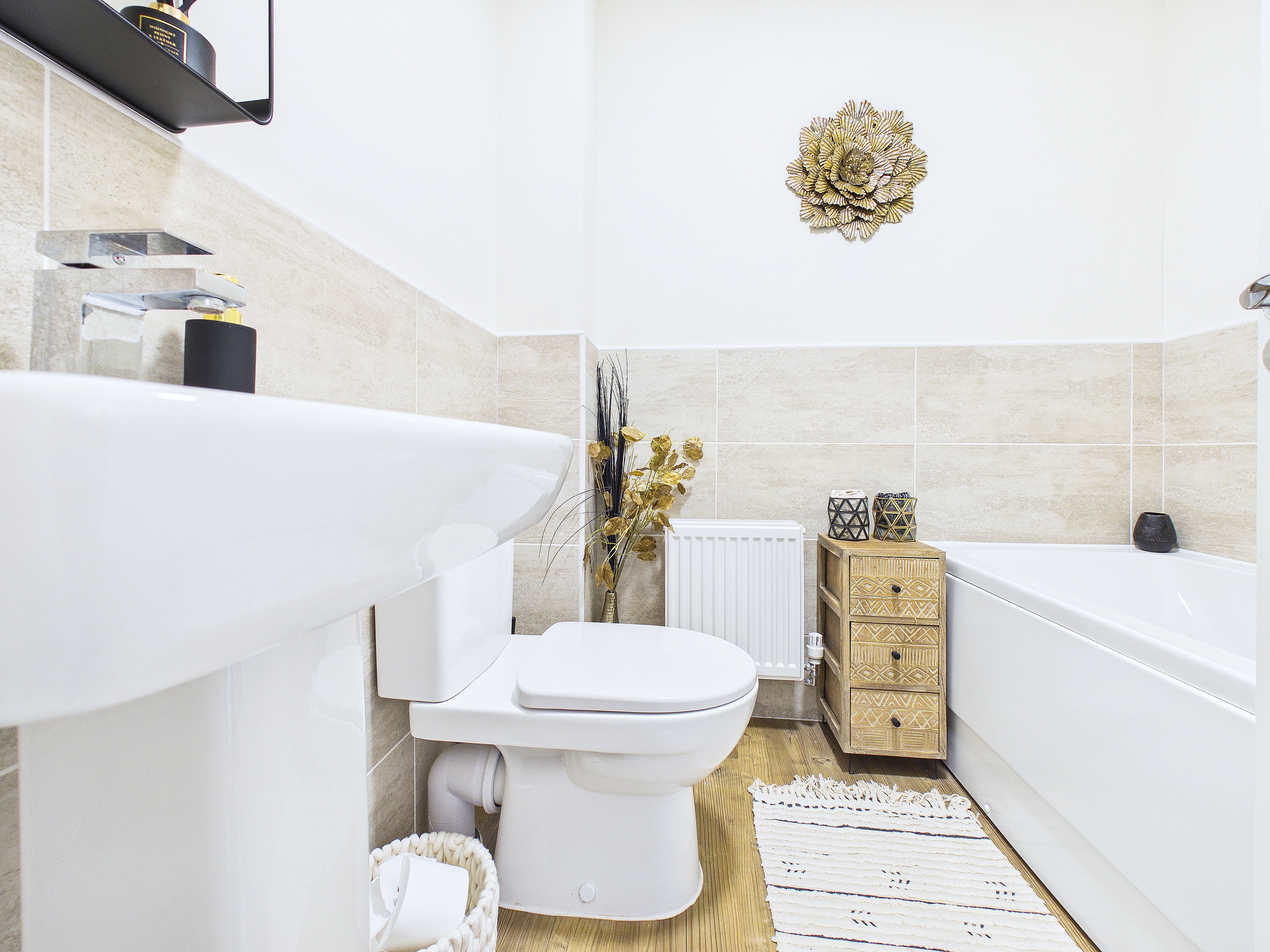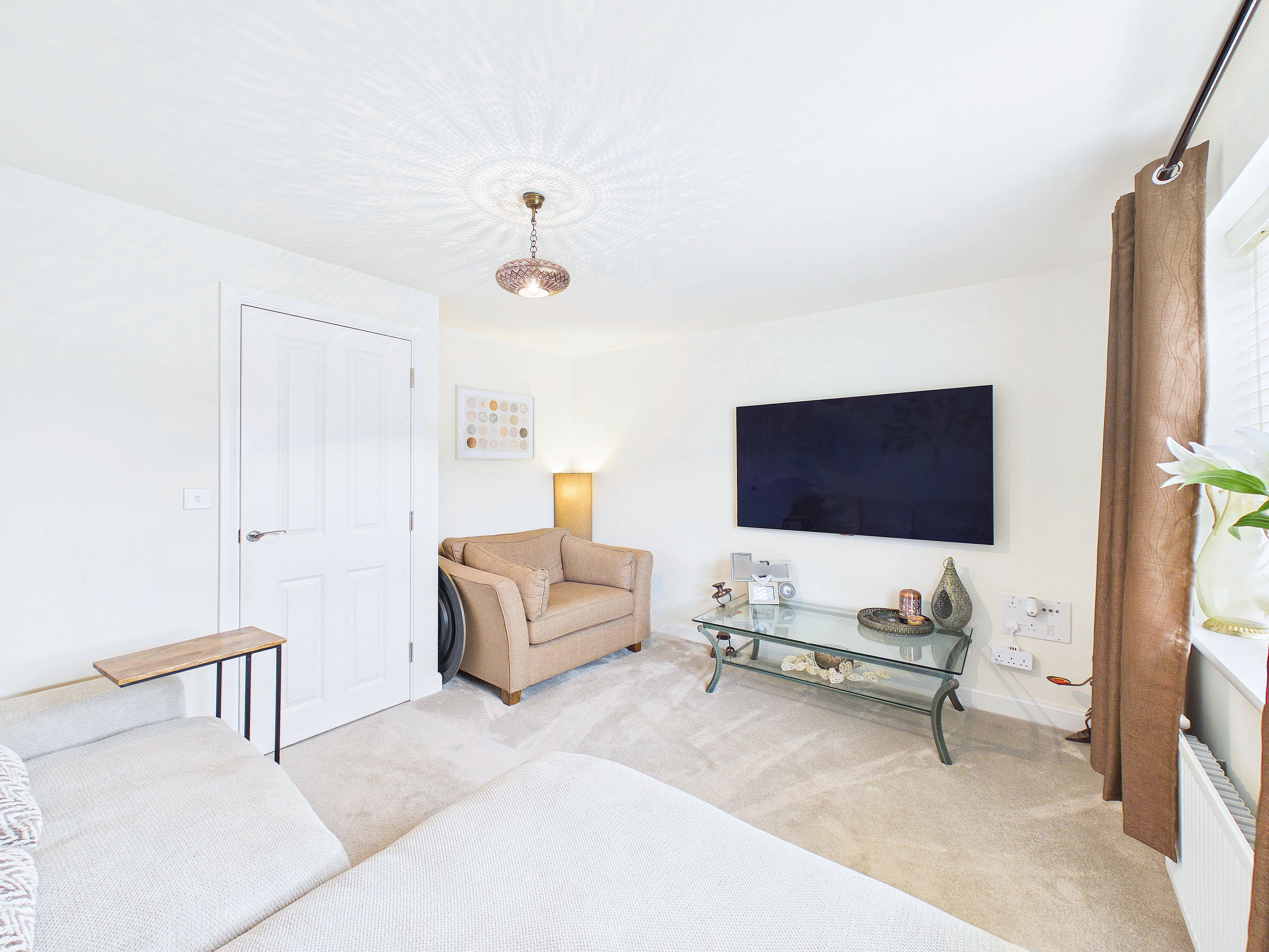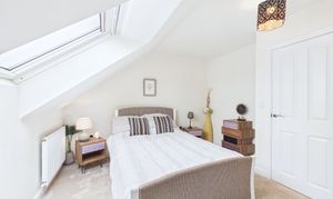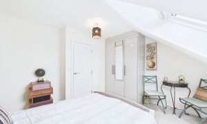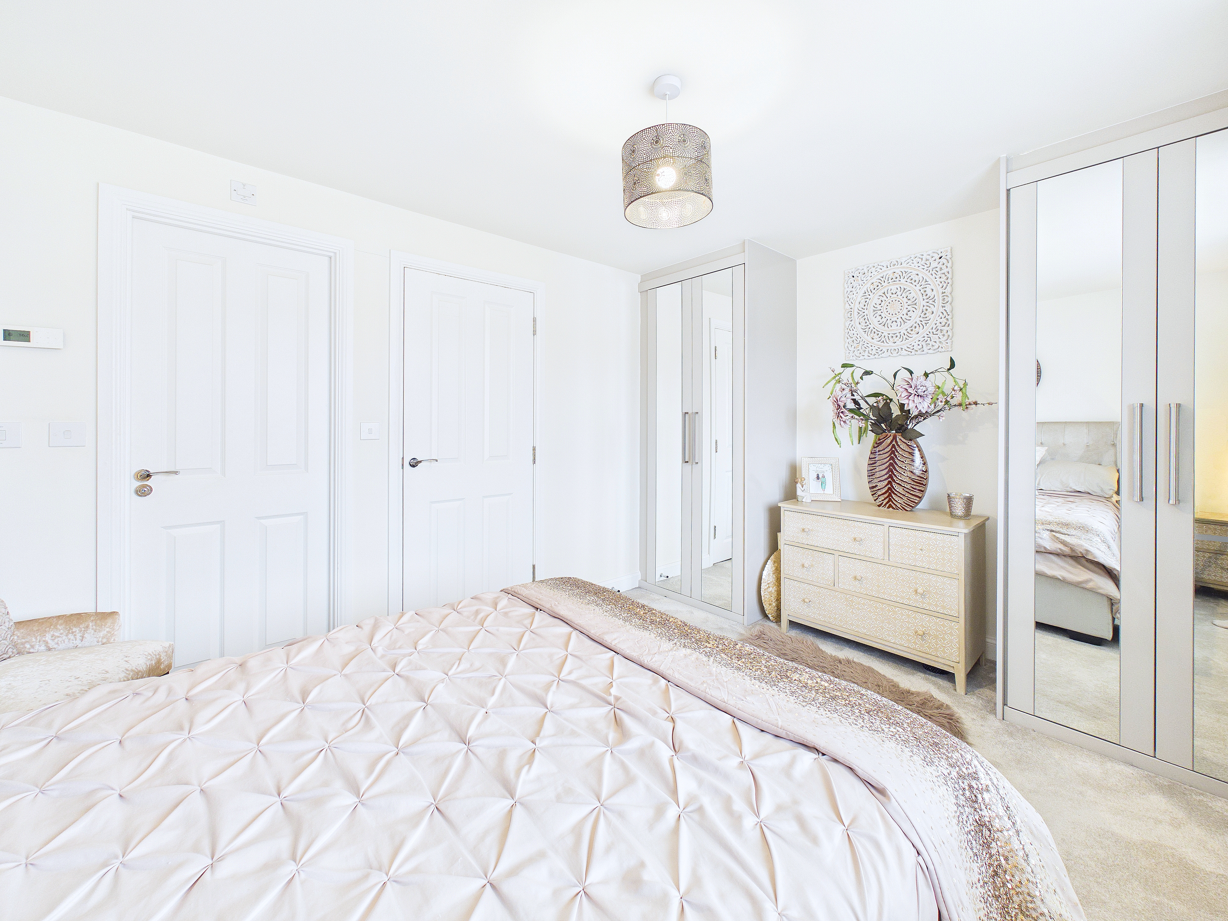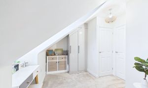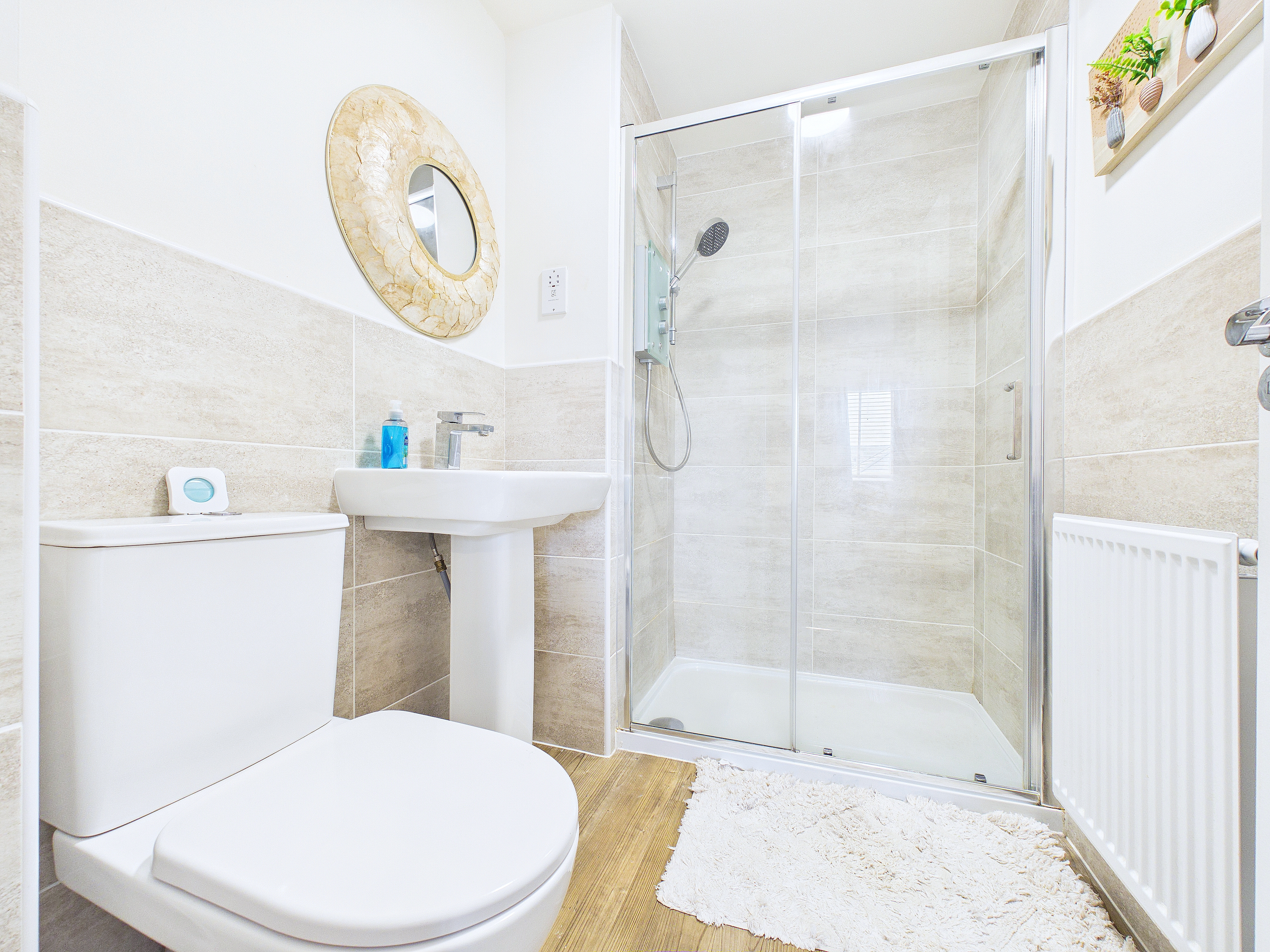 The second floor hosts two further bedrooms, both thoughtfully arranged to maximise space and usability. These rooms benefit from fitted wardrobes, while additional storage can be found within the boarded eaves in bedroom 3, offering excellent hidden storage solutions. A contemporary family bathroom serves this level, finished with modern fittings and a clean, stylish design.