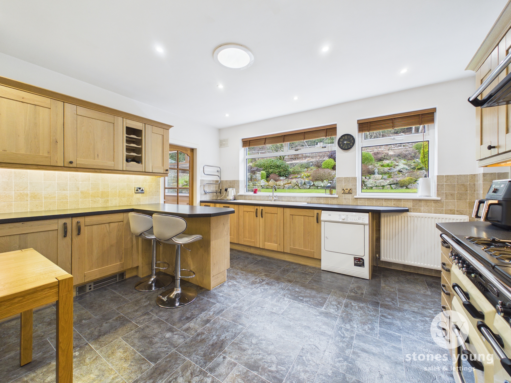 Range of fitted wall and base solid oak units with contrasting worksurfaces, sink and double drainer, breakfast bar with seating for three, plumbed for washing machine, integral NEFF dishwasher, integral microwave, space for freestanding cooker with gas hob, LVT flooring, panel radiator, upvc double glazed window x 2