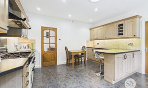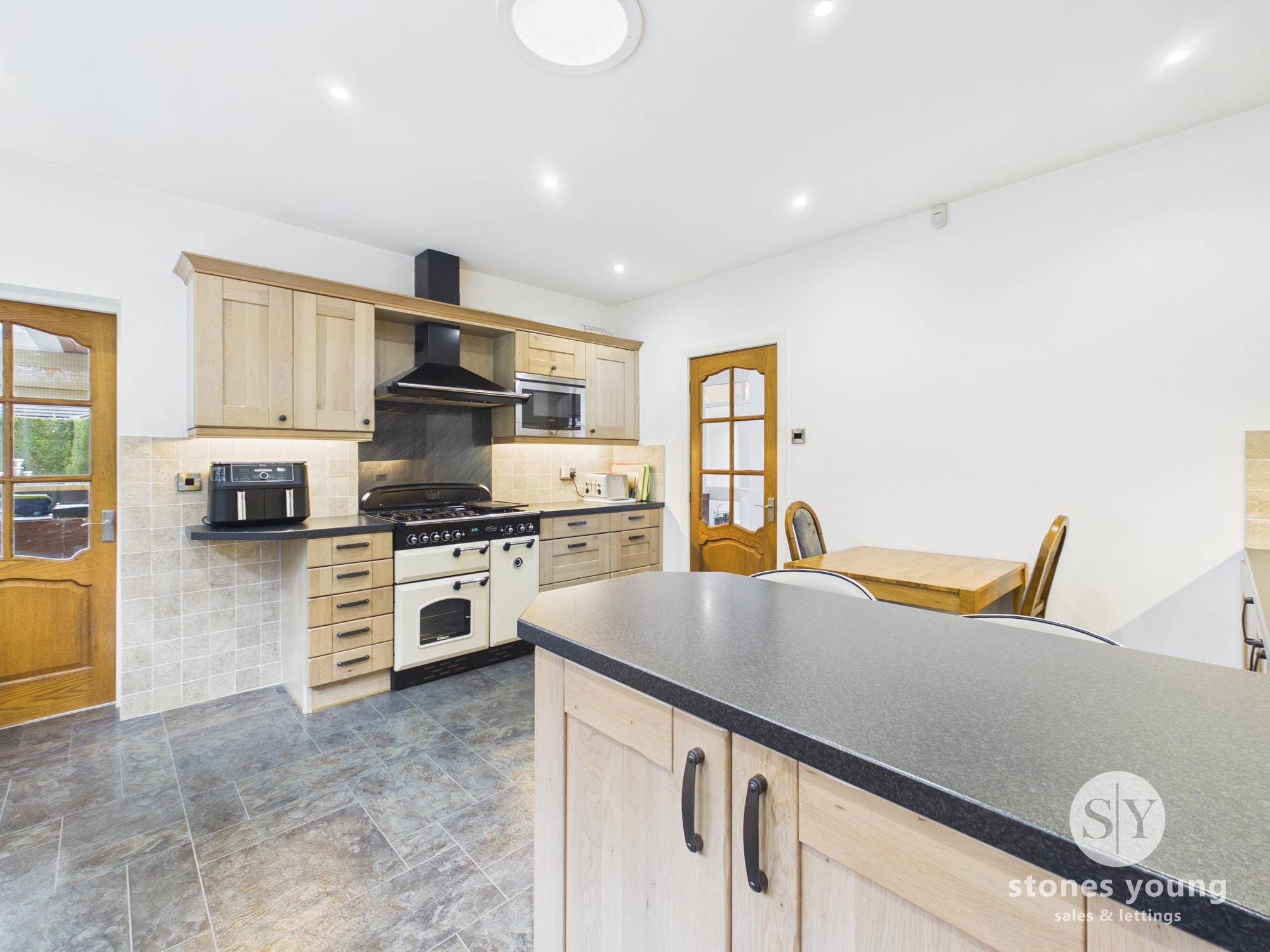 The expansive interior is introduced by a welcoming entrance hallway with a striking vaulted ceiling, setting the tone for the impressive space within. The bungalow boasts three separate reception rooms, each offering generous proportions and the versatility to adapt to a variety of lifestyles, whether used as formal entertaining spaces, a family lounge, play room or a fourth bedroom. An additional office space provides the ideal environment for working from home or quiet study. The property is served by a modern kitchen diner, designed to meet the demands of contemporary living with an electric Rangemaster cooker with gas hob, oven and drill, complimented by a fitted breakfast bar.