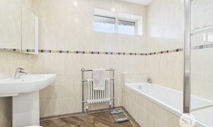 Three piece suite with shower over bath, wc and sink, heated towel rail, LVT flooring, upvc double glazed frosted window