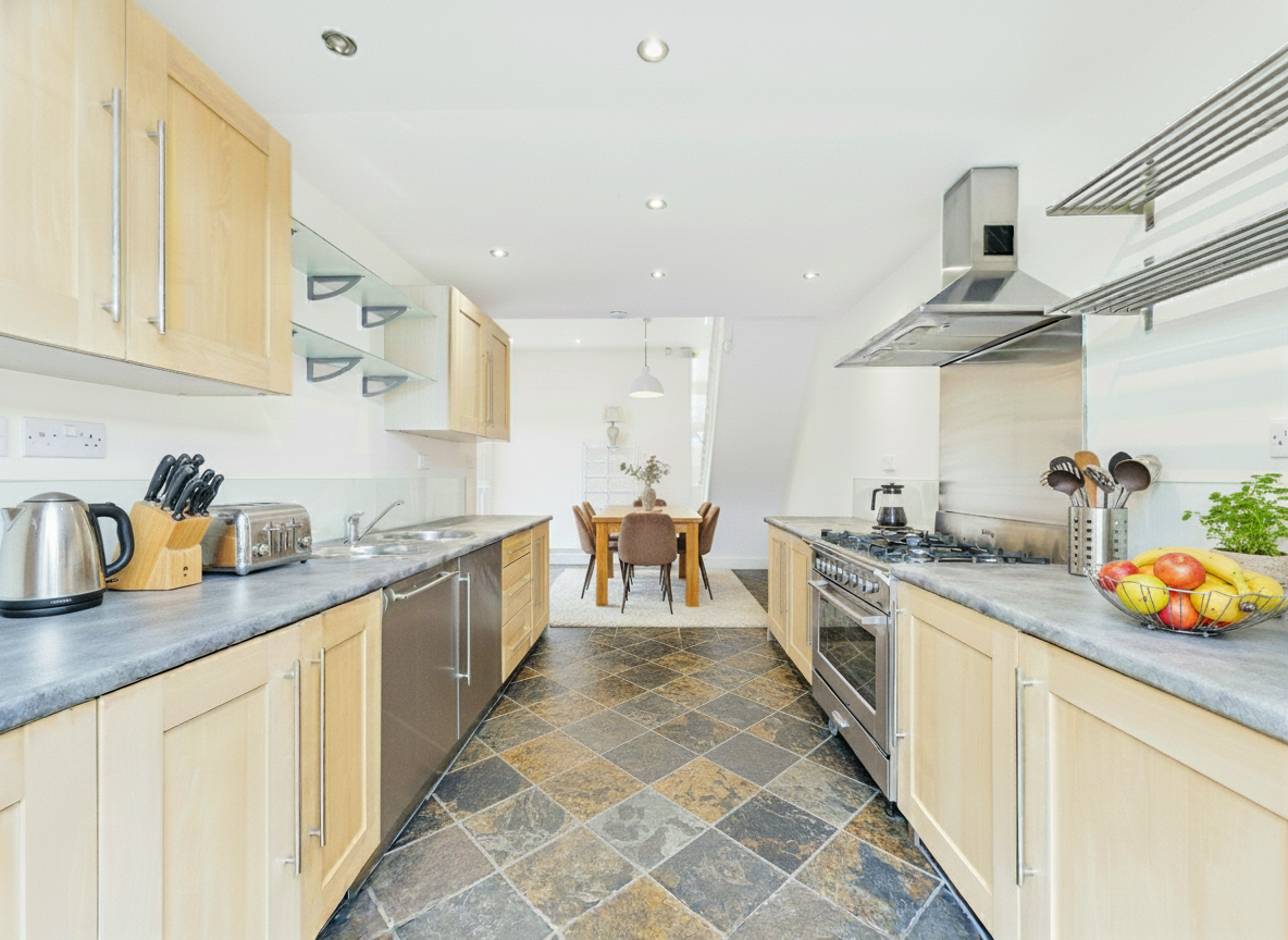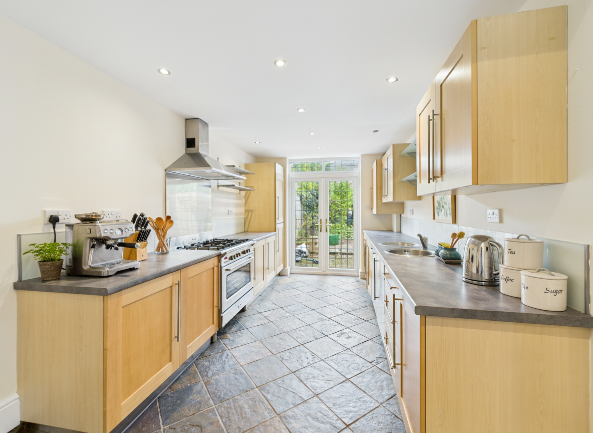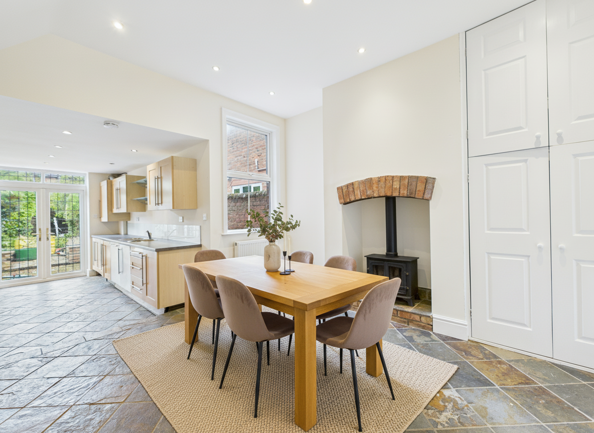 The dining area offers excellent floor space, complemented by slate-effect tiled flooring, a chimney breast with a fitted burner, and built-in storage to the recess. A step leads down to the kitchen, which is fitted with a range of shaker-style units with brushed metal fittings, work surfaces with inset circular stainless steel sink, and a collection of integrated appliances, including a range-style oven with splashback and extractor over. From here, UPVC double glazed French doors open directly to the rear garden, creating a seamless flow between indoor and outdoor living.
