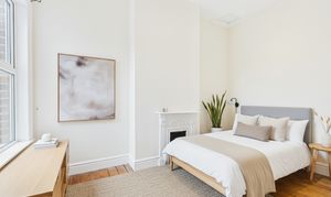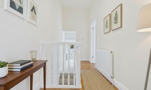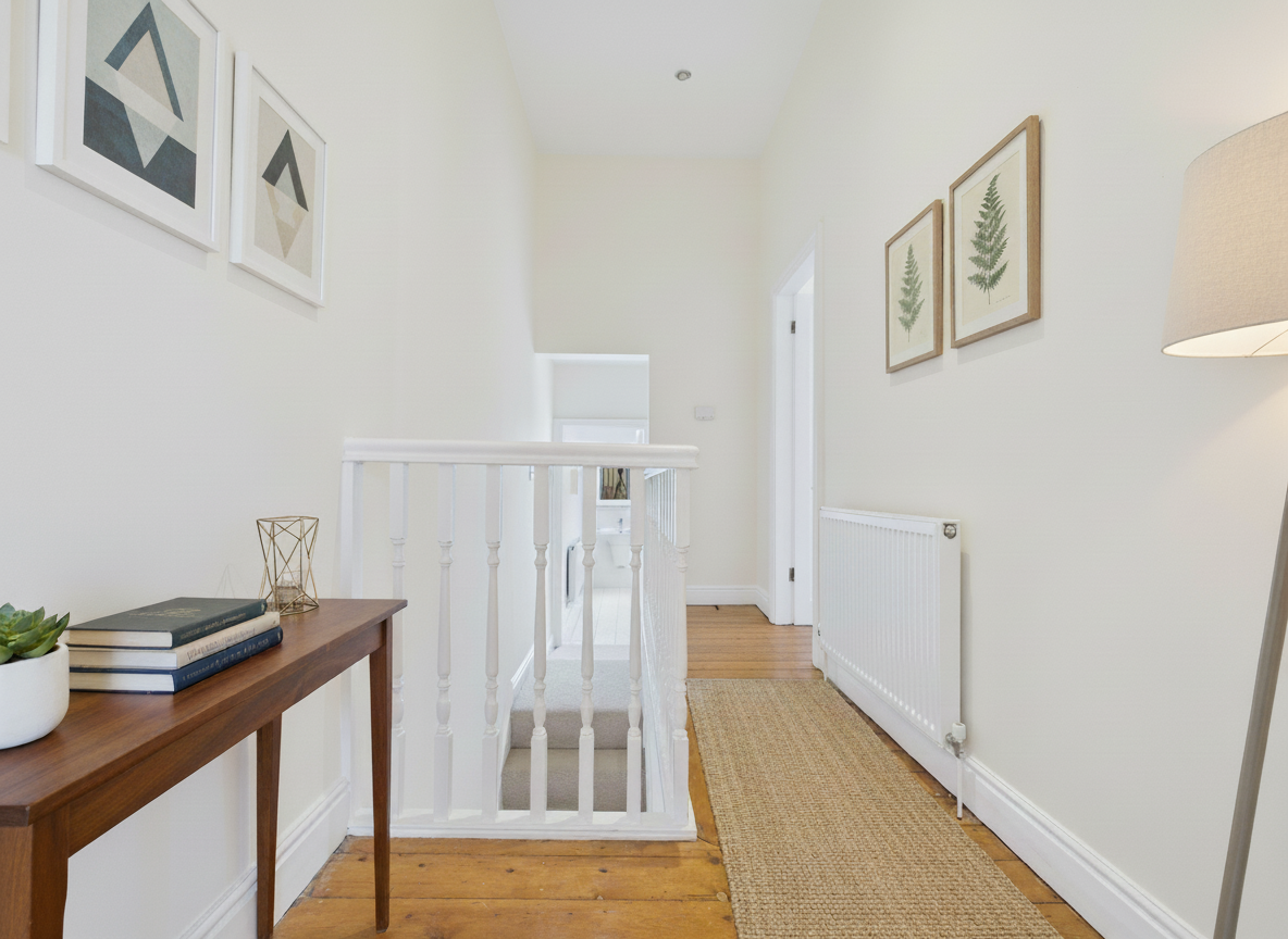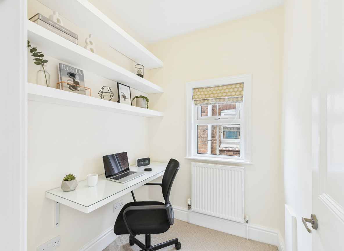 Upstairs, the split landing reveals exposed floorboards, a charming feature that continues through the main and second bedrooms. The principal bedroom is particularly generous in size, while the second bedroom includes an attractive period fireplace. The third bedroom provides flexibility as a small single room or ideal home office, suiting modern working lifestyles.