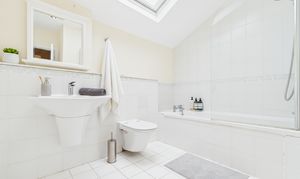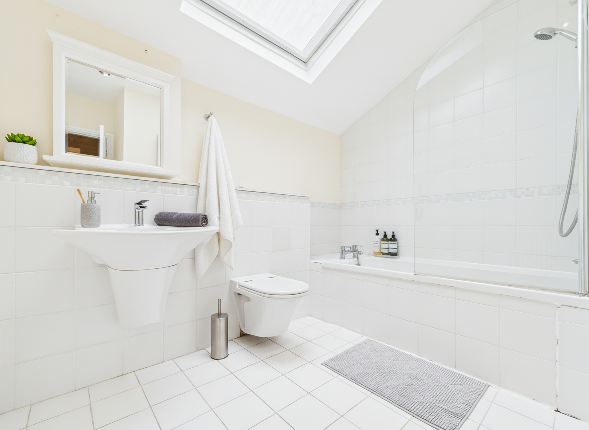 The spacious bathroom completes the accommodation, fitted with a white three-piece suite featuring a shower-over-bath arrangement, tiling to floor and walls, and a pitched ceiling with skylight window allowing natural light to flood in.
