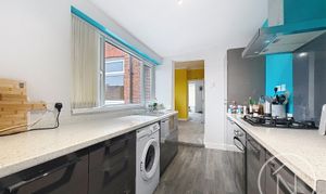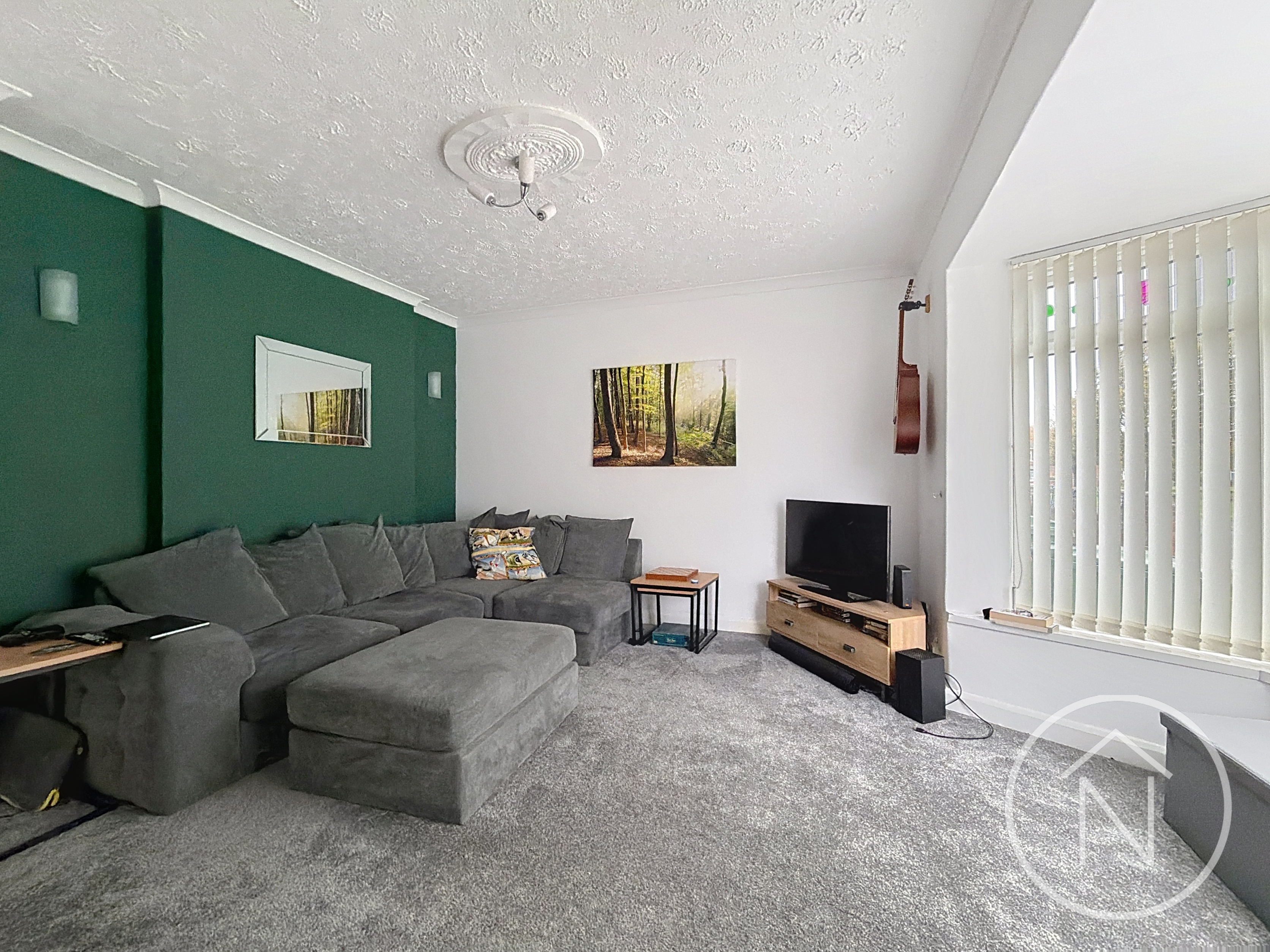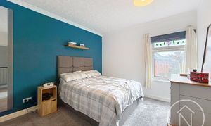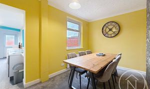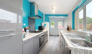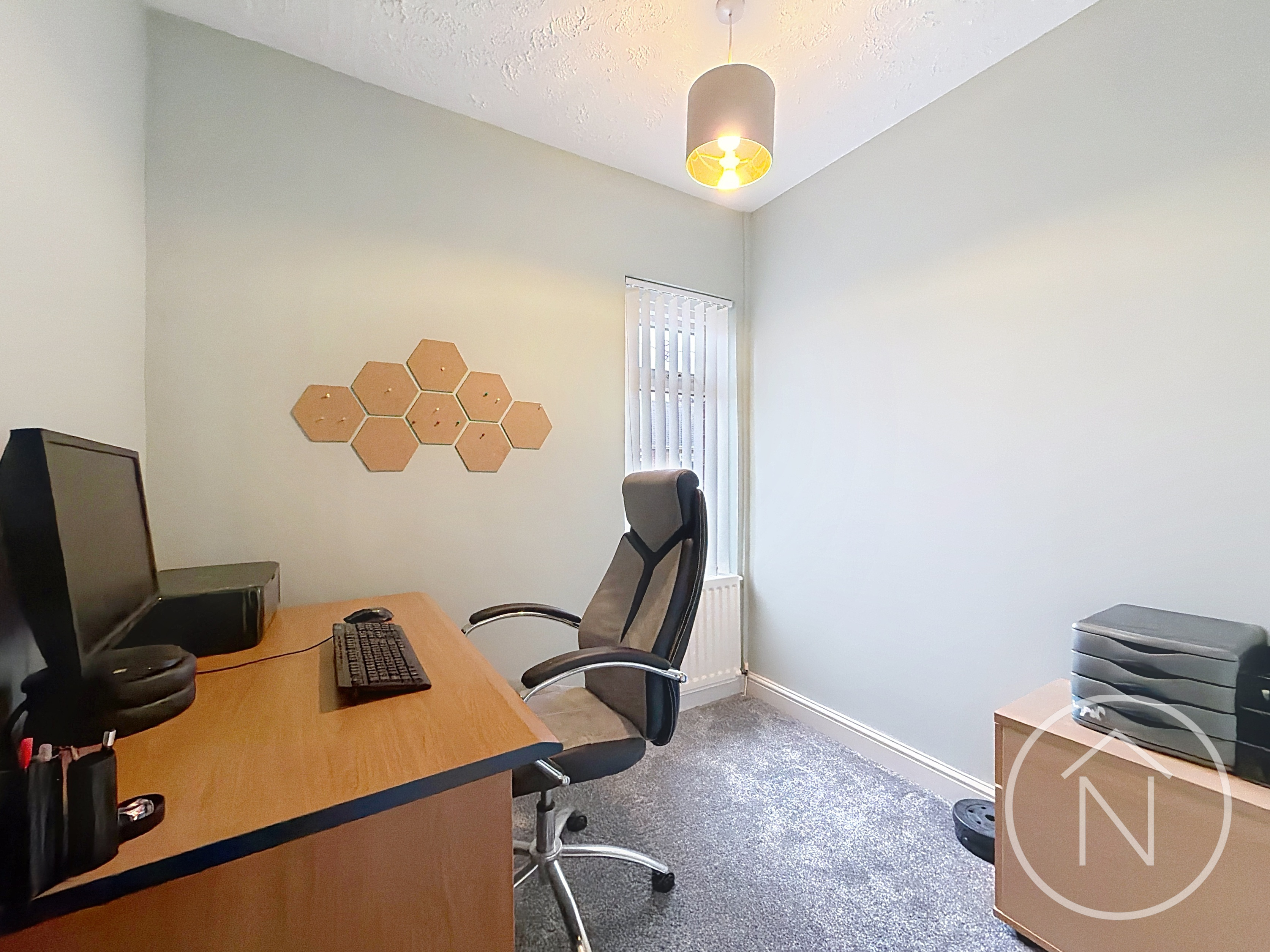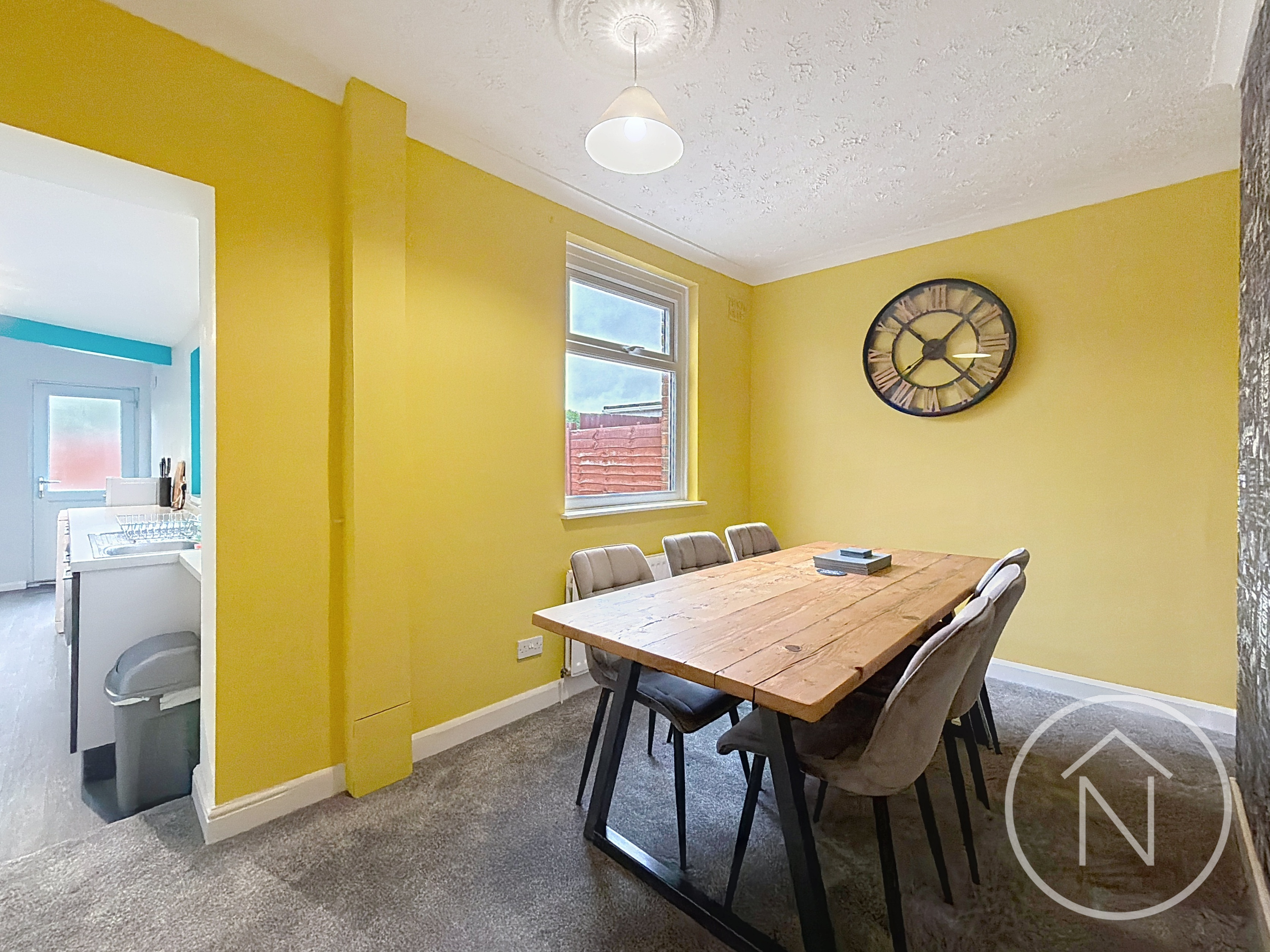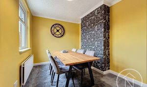 This beautifully presented three-bedroom, one-bathroom mid-terraced house offers a perfect blend of modern style and practical living. The home welcomes you with a bright and spacious living room, complemented by a large bay window that fills the space with natural light. The open plan kitchen and dining area provides a contemporary setting for family meals or entertaining, boasting sleek modern kitchen units and ample countertop space. Vibrant accent walls and modern decor throughout the home create a stylish, inviting atmosphere. A dedicated home office provides an ideal space for remote work or study, benefitting from excellent natural light.