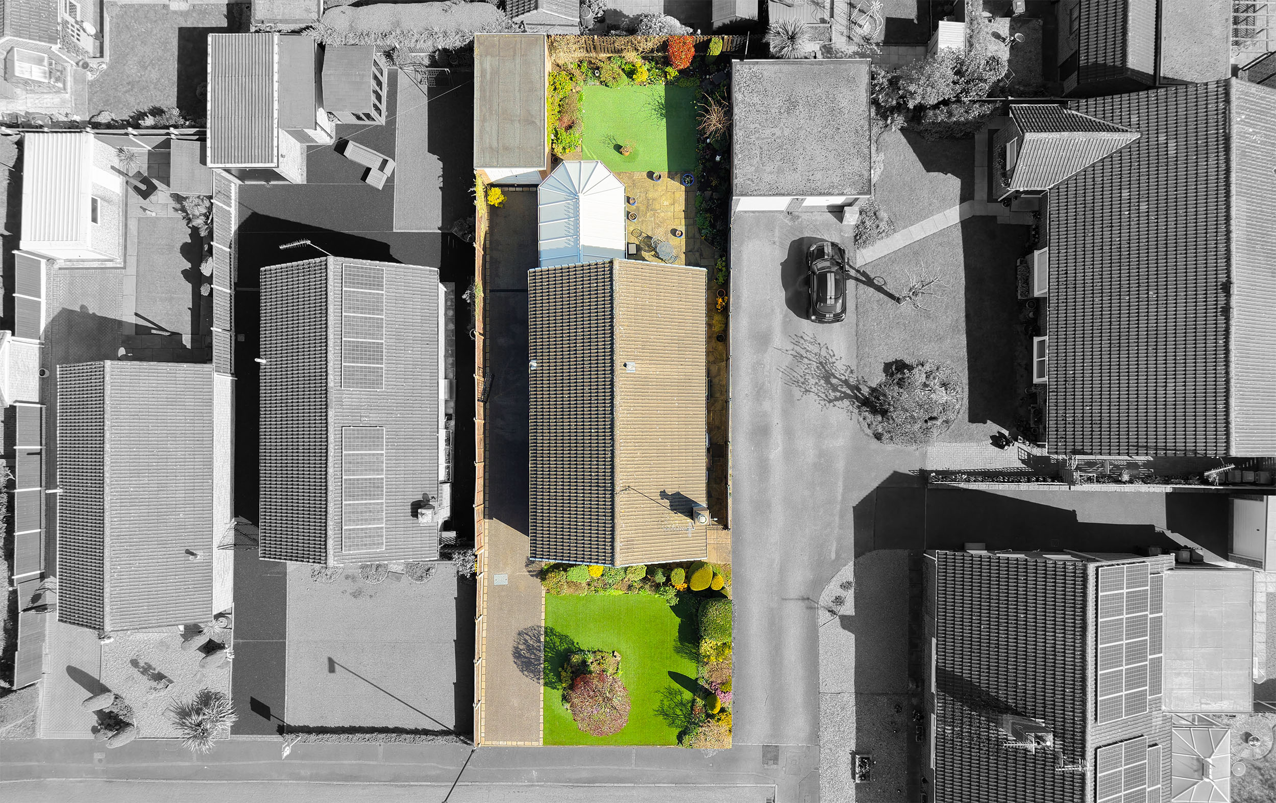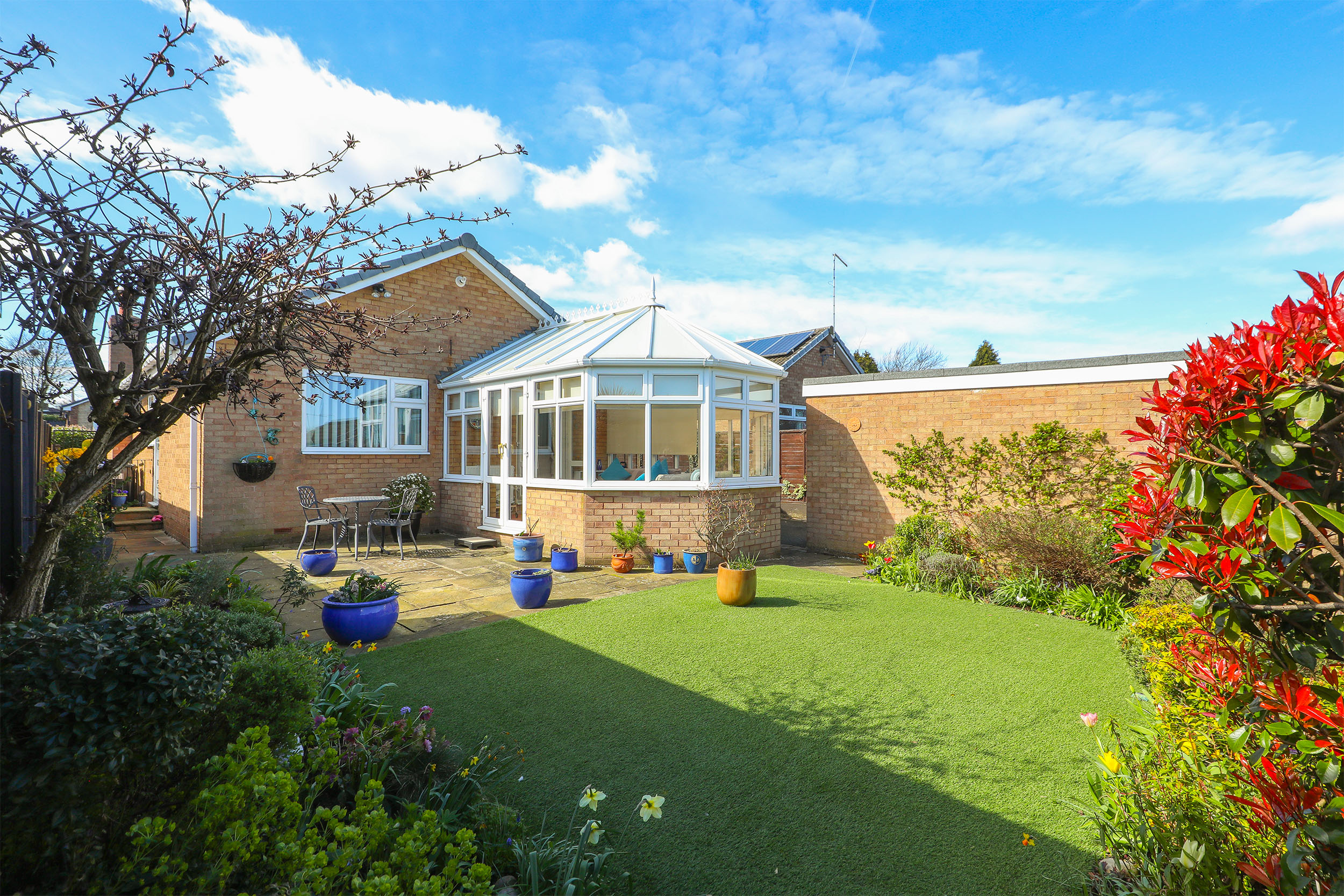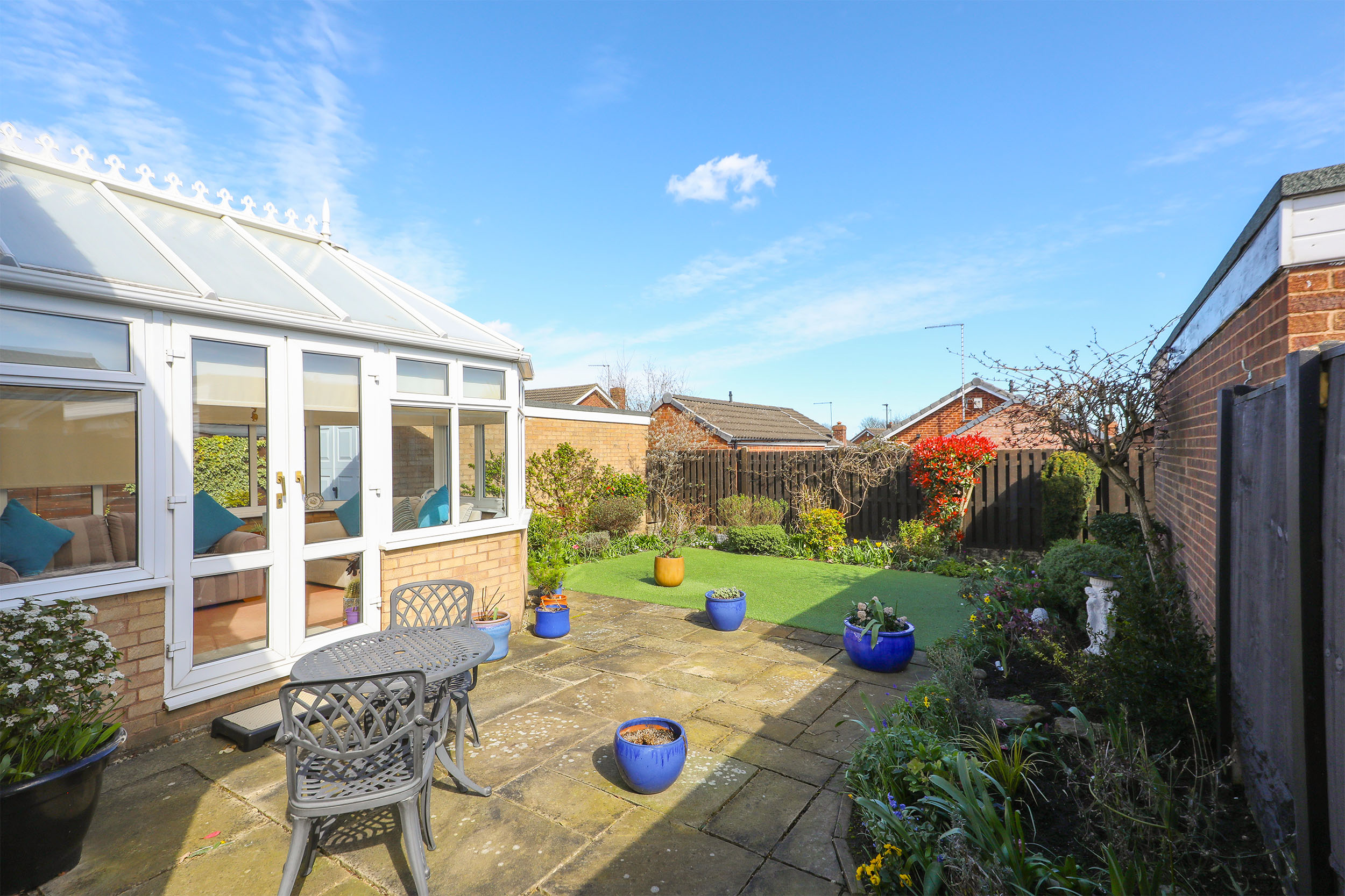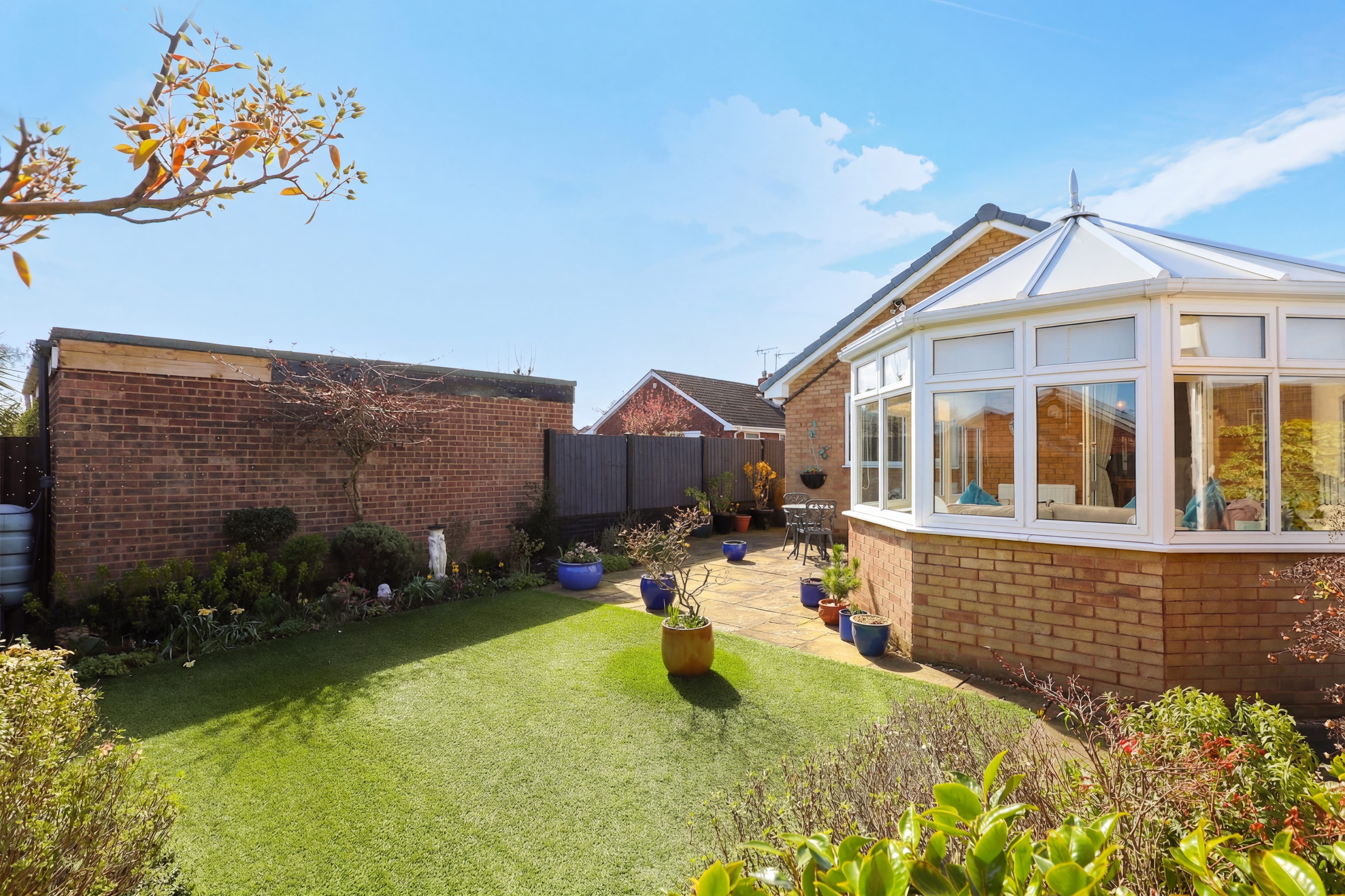 Externally, the home continues to impress with an exceptionally well-maintained and low-maintenance rear garden. A generous patio area provides the perfect spot for outdoor seating and entertaining during the warmer months, while an artificial lawn ensures ease of upkeep. The garden is framed by established borders filled with mature plants and flowers, adding colour and interest throughout the seasons.