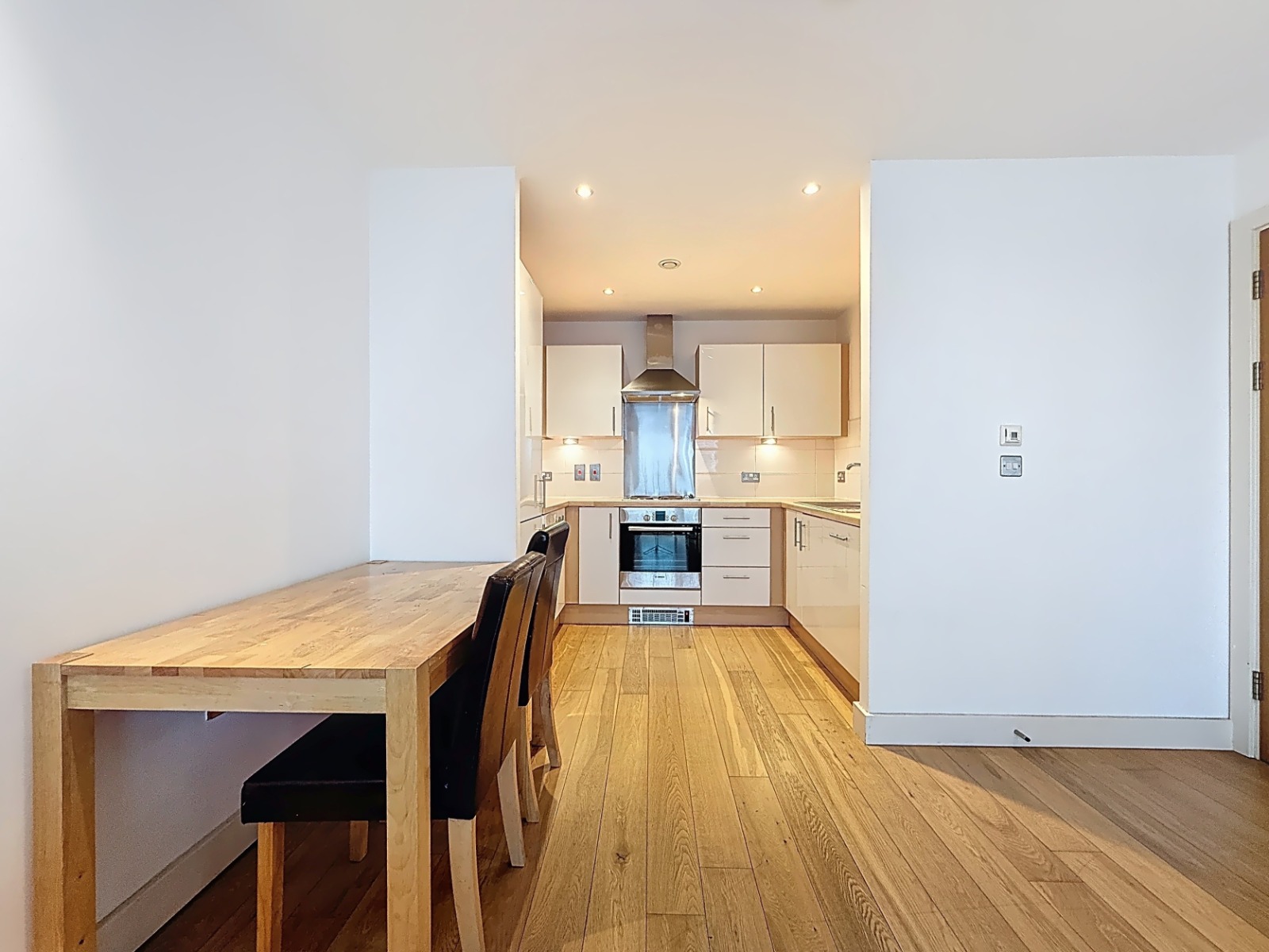 Wood flooring enhances the contemporary finish while recessed ceiling lighting contributes to a clean and modern atmosphere.