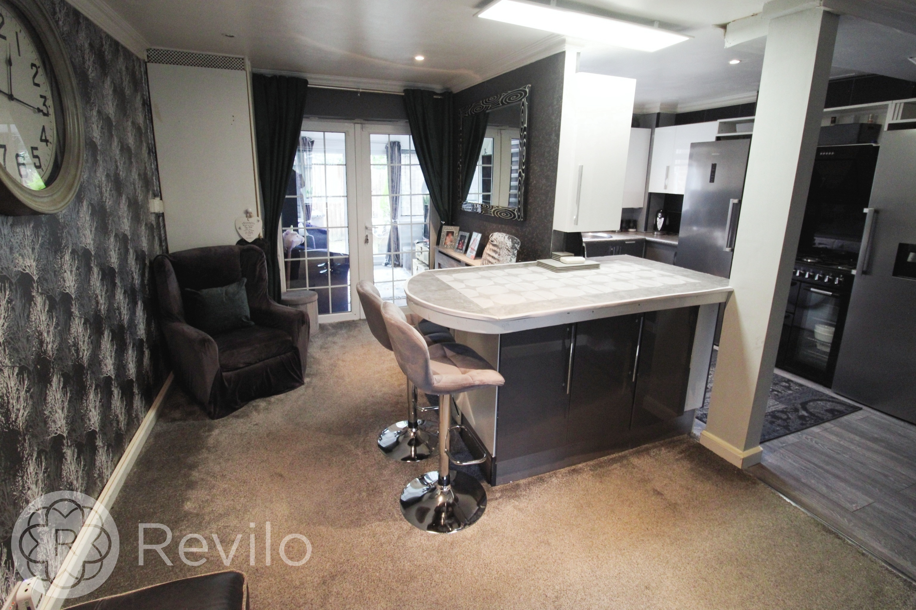 Open plan kitchen diner, breakfast bar, Range cooker, space for large freestanding fridge & freezer, space for a washer and dryer, ample storage, archway through to the lounge, rear facing window and French doors giving access to the Conservatory.
