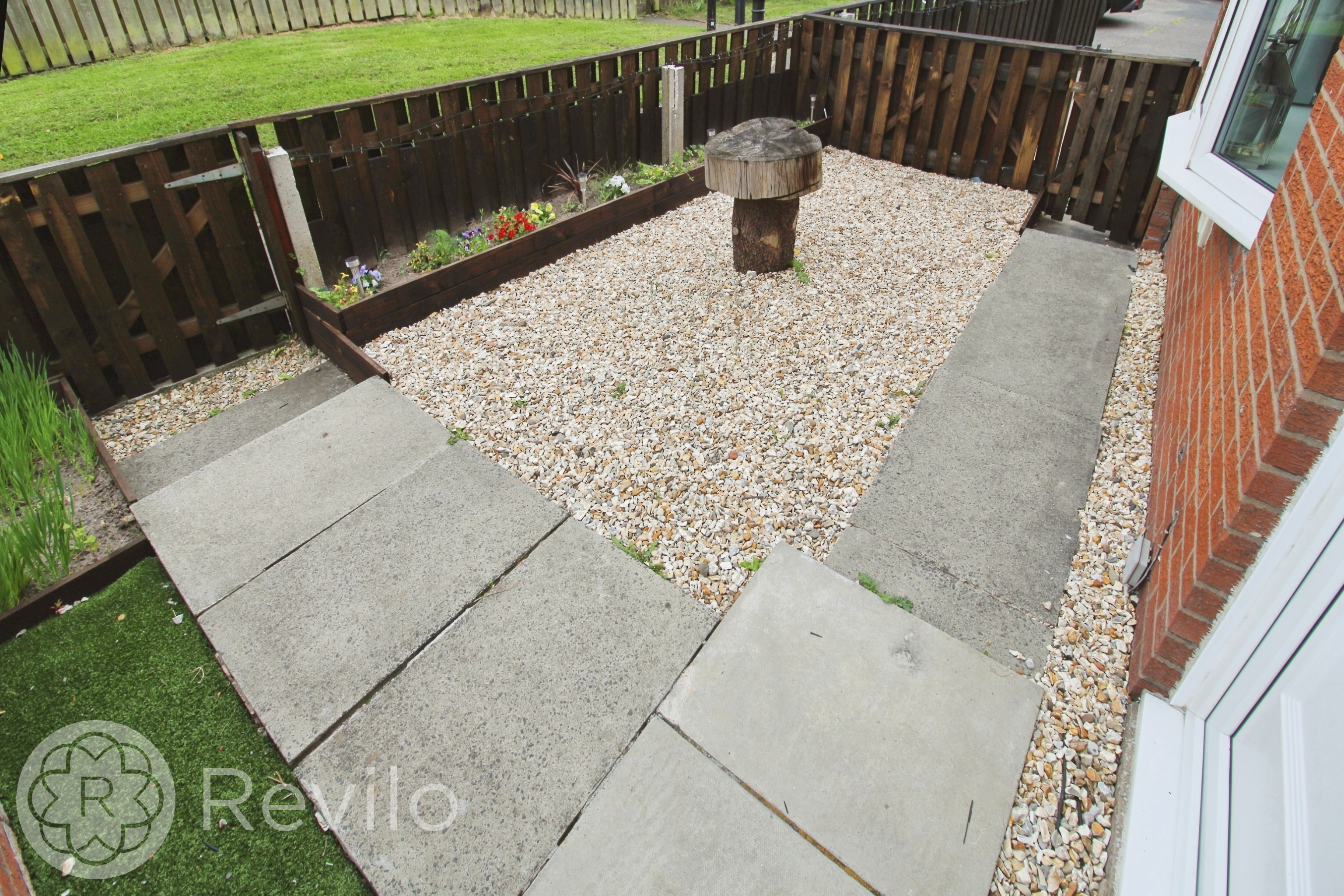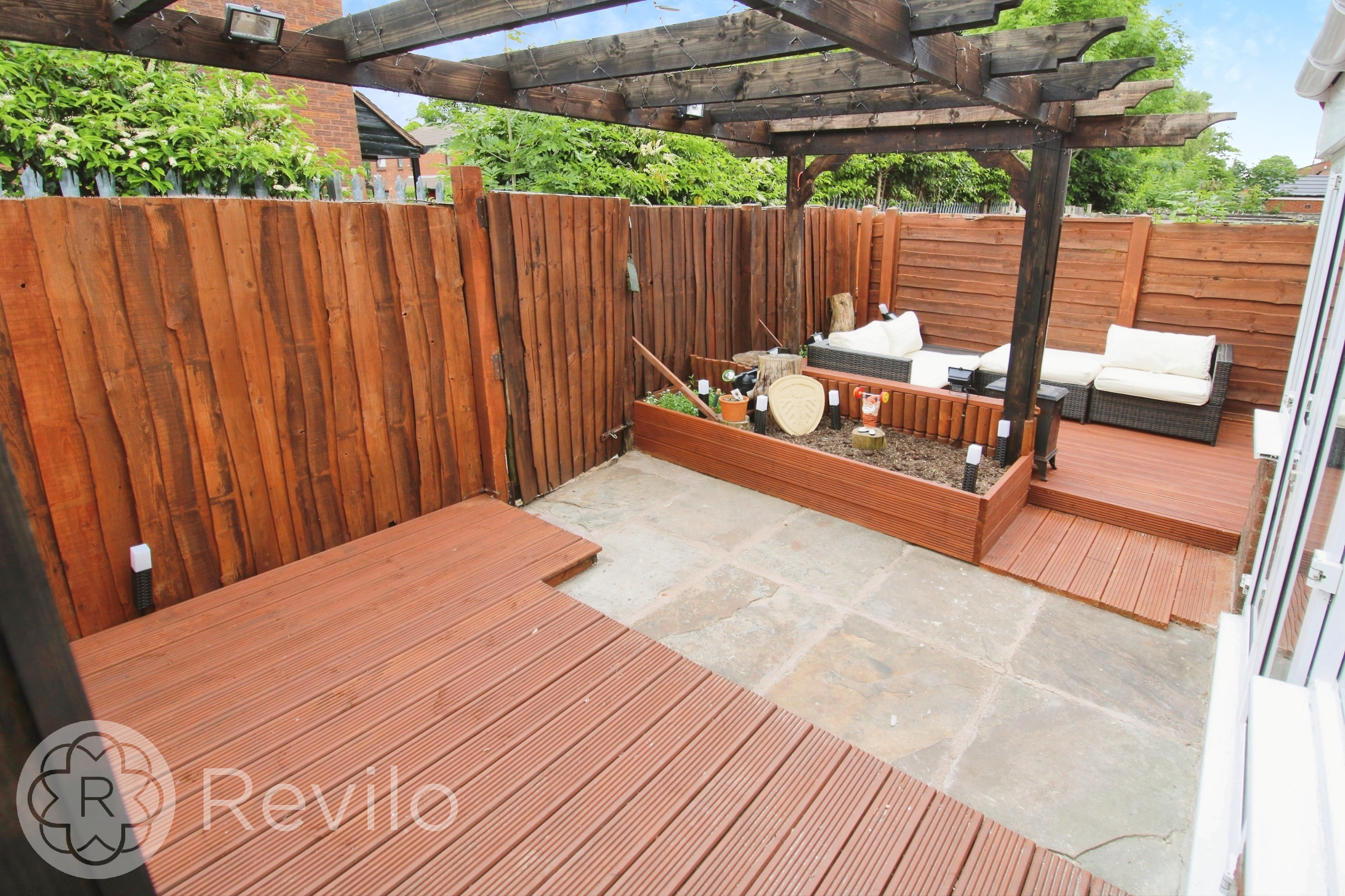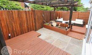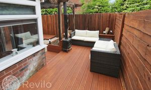 Gated front courtyard garden with paved pathway, planting beds to borders and fenced boundary. Private garden to the rear with paved patio, wooden deked seating areas, planting beds and fenced boundary.
