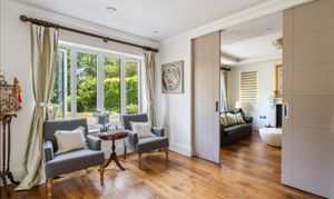 The ground floor flows seamlessly from an expansive open-plan kitchen with walk-in larder to multiple reception rooms, and bi-fold doors onto a stunning Zen-inspired garden complete with pond, tiered lawns, and entertaining terrace. A private home office, utility room, and guest WC complete this level. Upstairs, the principal suite impresses with garden-view Juliette balcony, walk-in wardrobe, and luxury en suite featuring a statement bath, while three further bedrooms are served by two family bathrooms and a guest en suite. The versatile top floor provides two additional double bedrooms and en suite, plus a dedicated yoga/gym studio with potential to extend. With double garage, ample parking, and just minutes from local shops, schools, and green spaces, this property offers an unrivalled lifestyle opportunity blending family living with peaceful retreat.