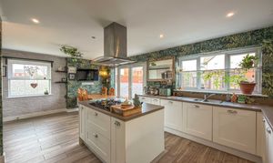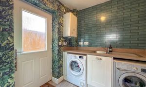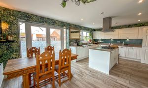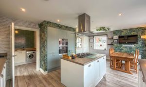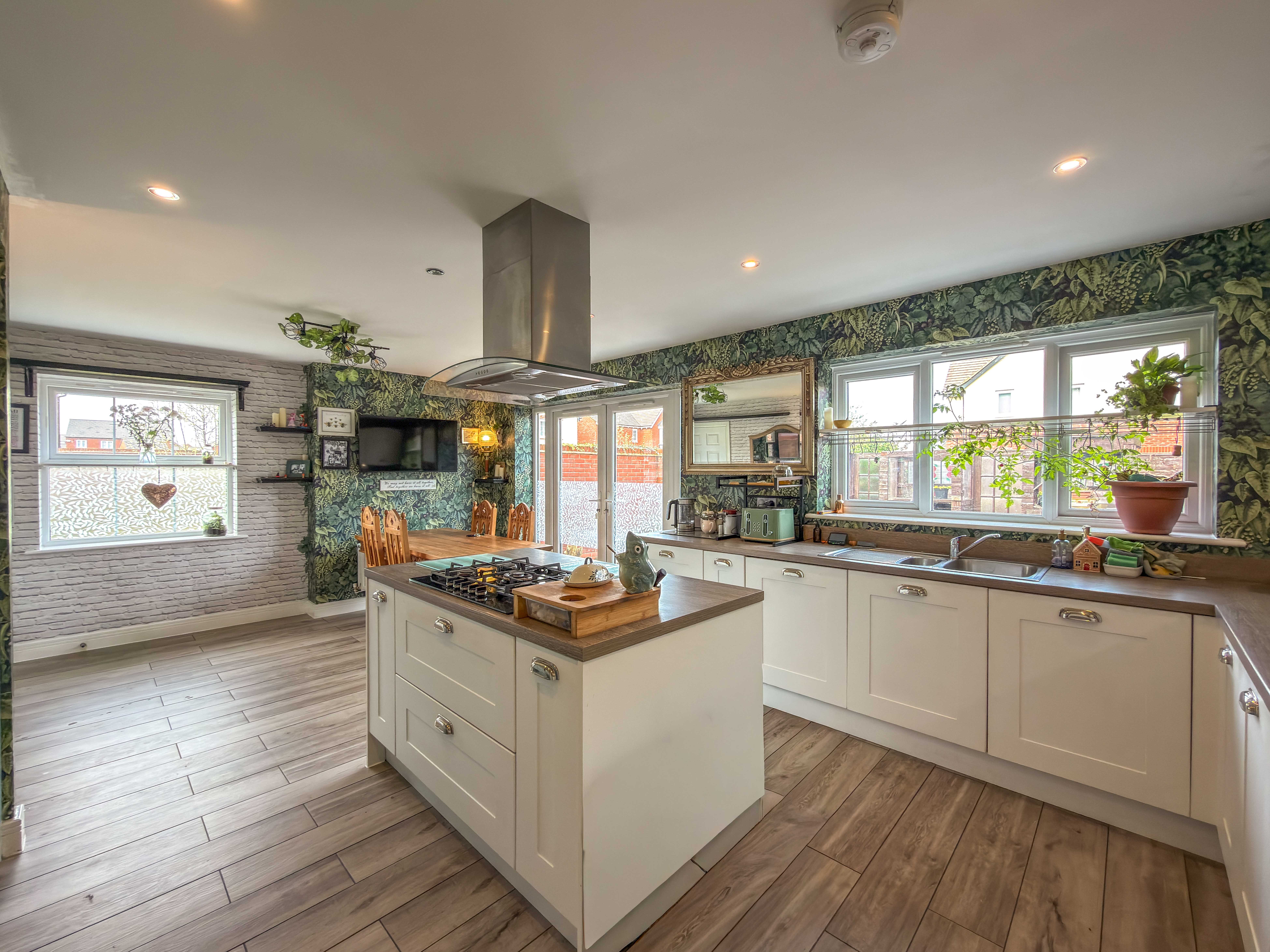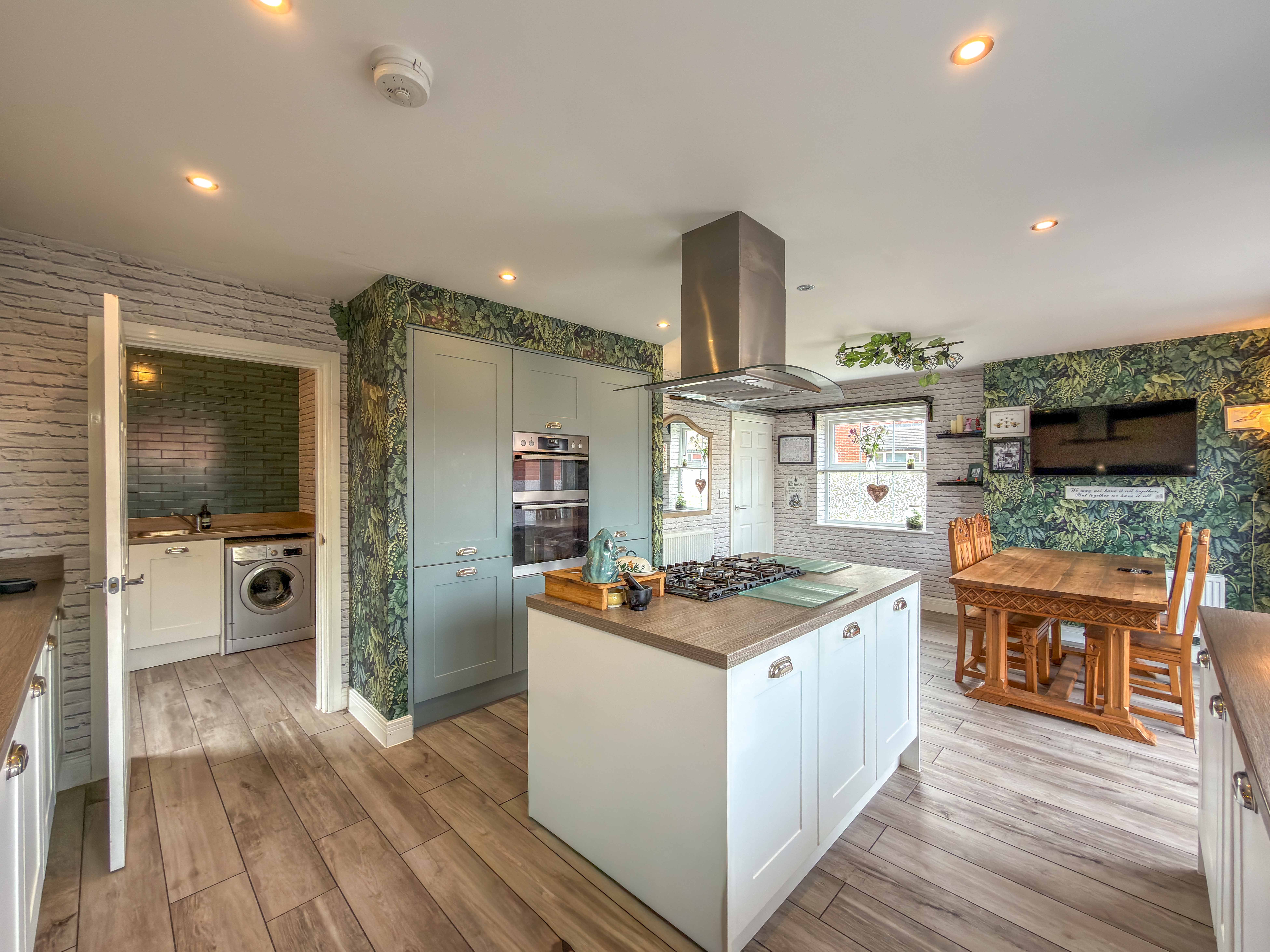To the rear lies the true heart of the home - a generous open-plan kitchen, dining and living space, designed for both everyday family life and entertaining. The kitchen is fitted with a range of shaker-style units and integrated appliances including double oven, gas hob, extractor, fridge, freezer and dishwasher. There is ample space for both dining and seating areas, while French doors open directly onto the garden, creating a seamless indoor-outdoor flow. A separate utility room provides additional storage, plumbing for laundry appliances and access to the rear garden.