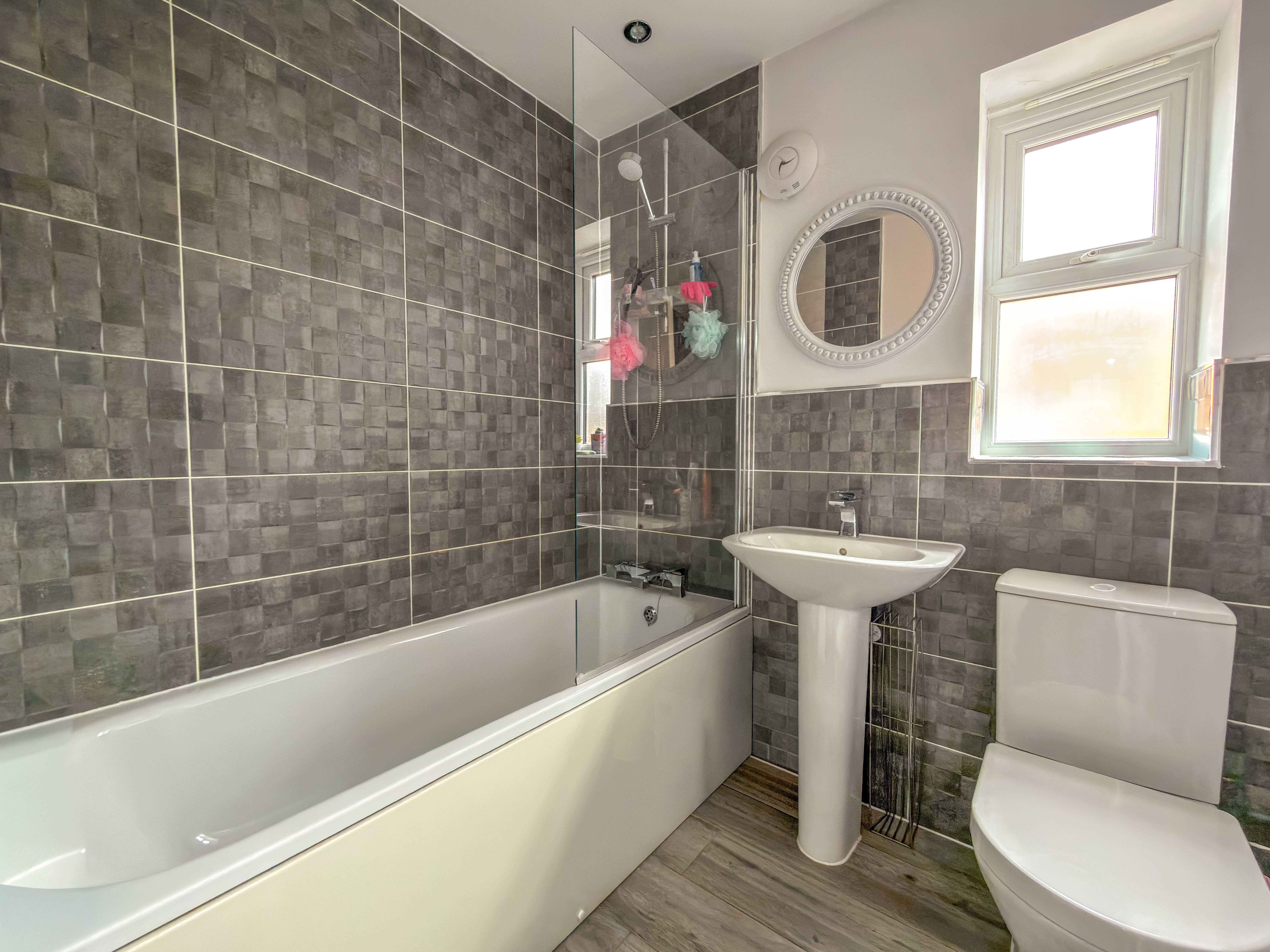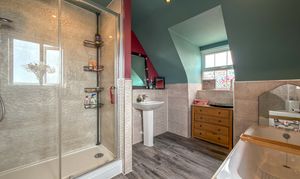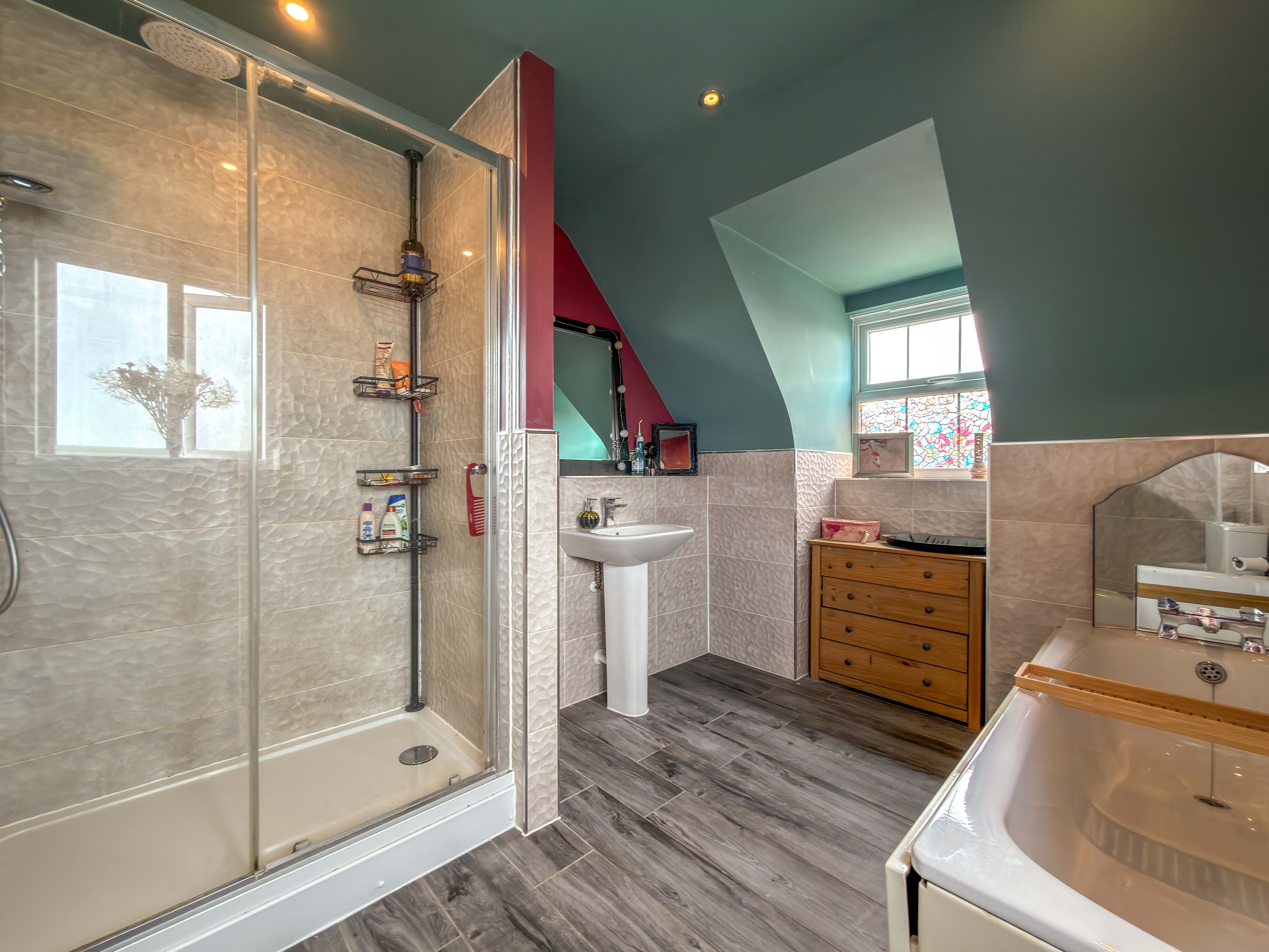 Bedroom two is a generous double and benefits from its own en-suite shower room with walk-in unit and mains-fed shower. Two further double bedrooms offer excellent space, one enhanced by a bay window, while a fifth bedroom provides a generous single/smaller double. These rooms are served by a modern family bathroom, fitted with a white suite and shower over the bath.