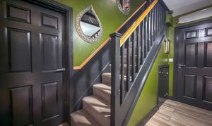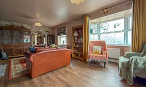 To the front of the property, a stylish living room enjoys a bay window that floods the space with natural light, complemented by decorative wall panelling, creating a warm and inviting setting.