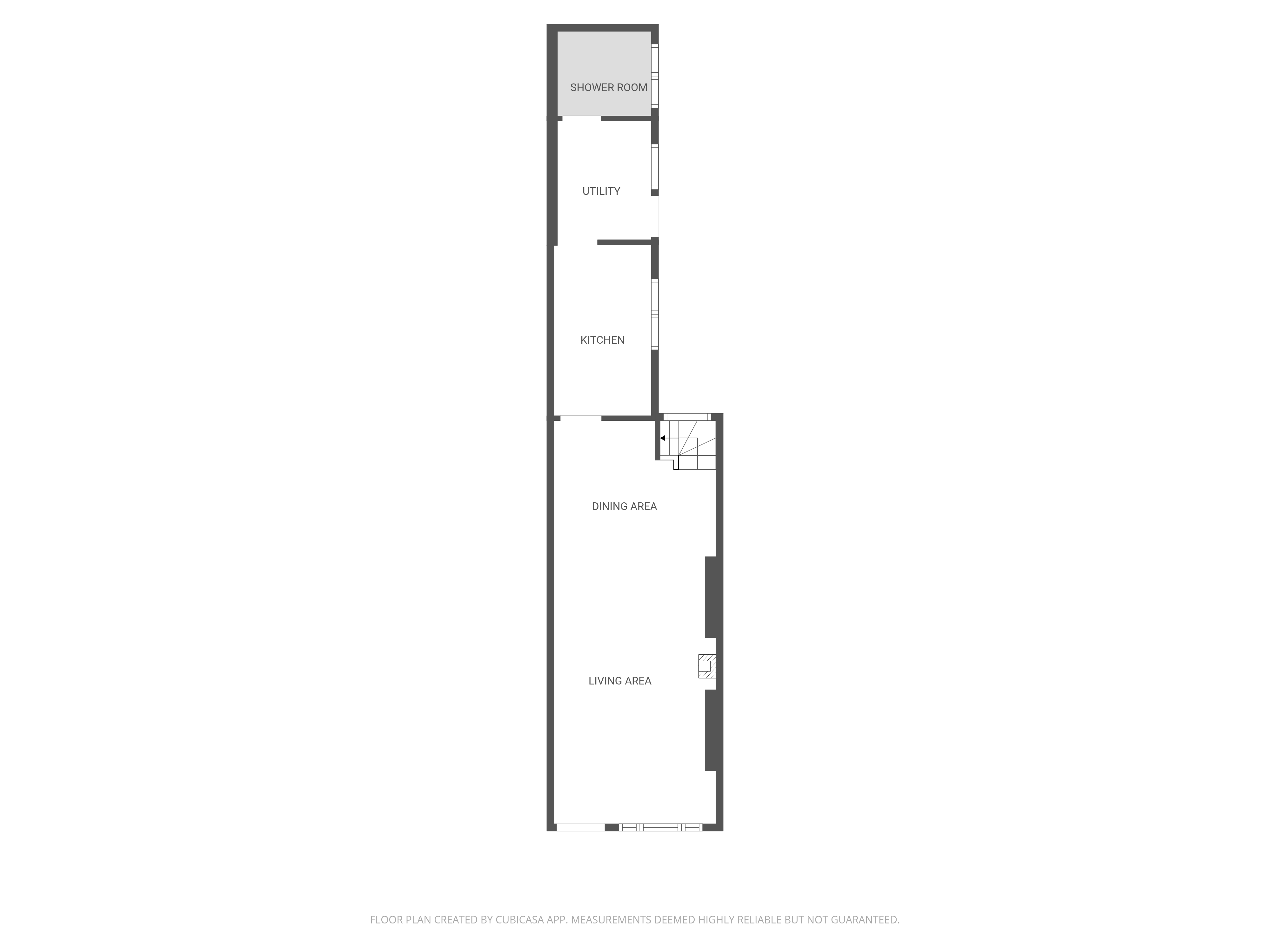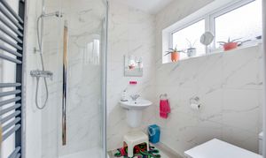 Features a modern tiled shower cubicle, a wash hand basin, and a low-level WC, all set against a clean, contemporary finish. The tiled flooring is practical and easy to maintain, and a heated towel rail adds a touch of comfort. There is a double-glazed side window and the full-height tiled walls.