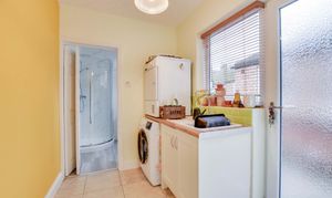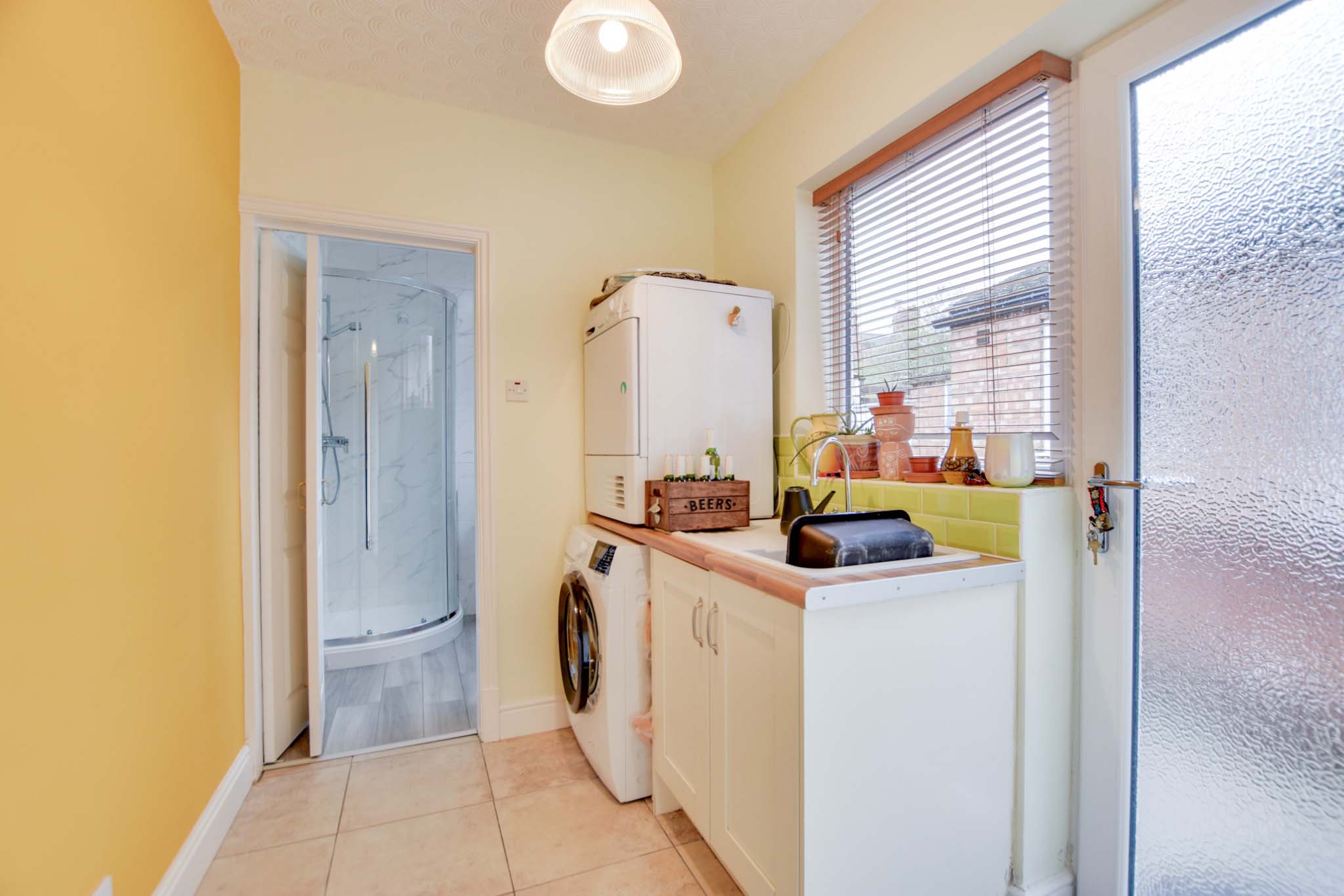 A practical space with a double-glazed window and door that bring in plenty of light. There’s a sink and drainer set into the worktop, along with plumbing for a washing machine and space for a tumble dryer stacked above. The layout gives you a handy area to take care of laundry and extra household chores without encroaching on the main kitchen.