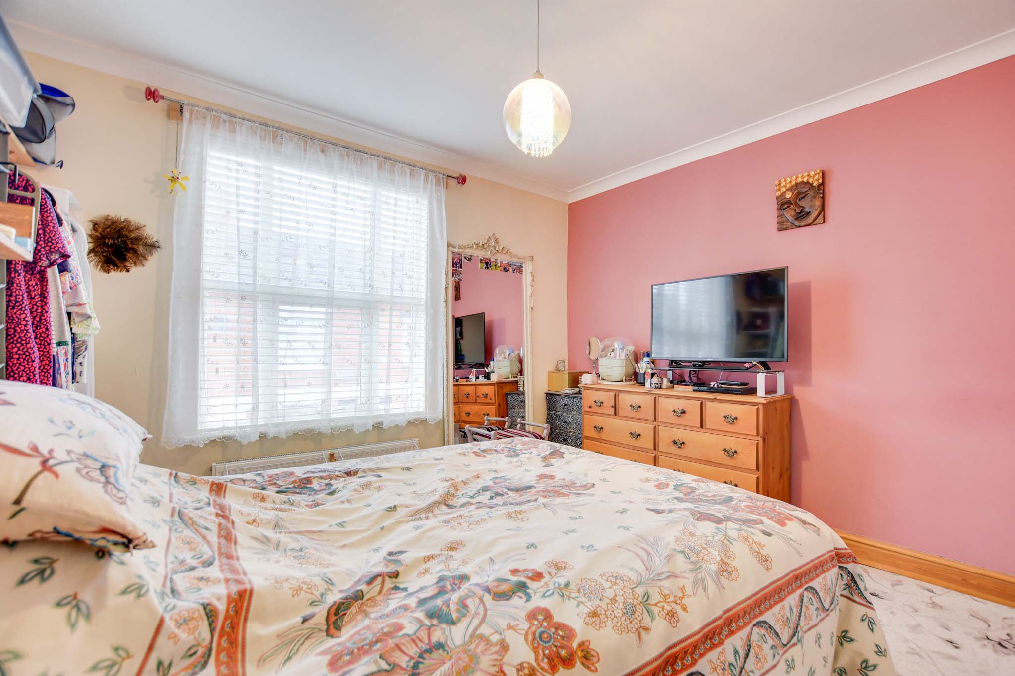 Enjoys a large double-glazed window to the front, which brings in plenty of natural light and gives the room an airy feel. There are handy built-in shelves and open hanging rails that make great use of the space, and a radiator sits beneath the window to keep the room warm. It’s a comfortable, generous double bedroom with plenty of room for furniture