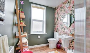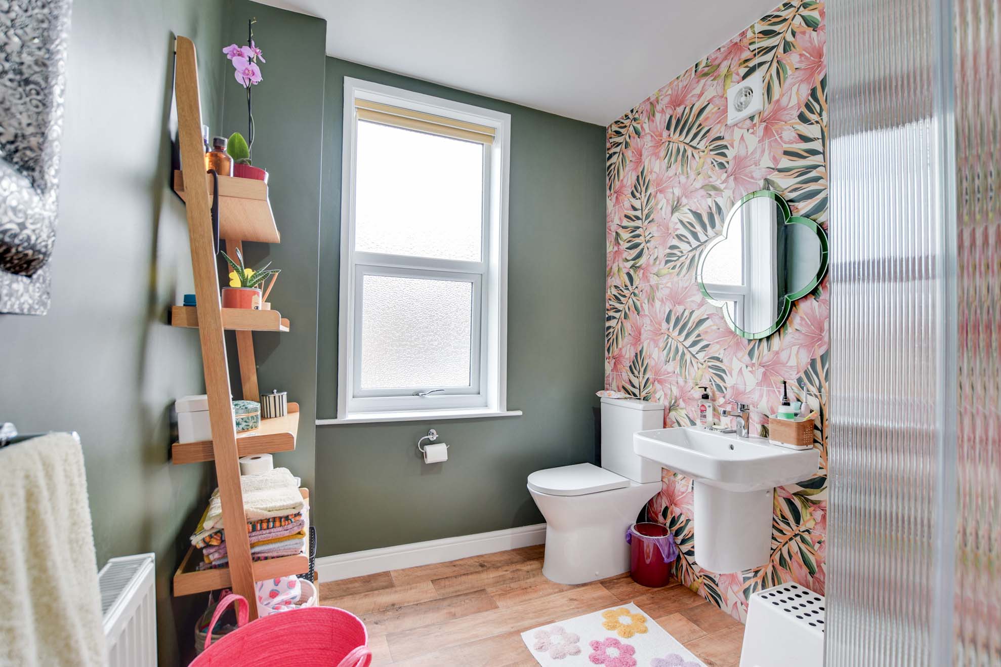 The first-floor shower room has a bright, modern feel thanks to the double-glazed rear window and colourful décor. It features a generous walk-in double shower with tiled surrounds, along with a wash hand basin and a low-level WC set neatly to one side. There’s useful storage too, with a cupboard housing the boiler, plus an extractor fan for ventilation. The wood-effect flooring adds warmth to the space, and a radiator keeps the room comfortable.