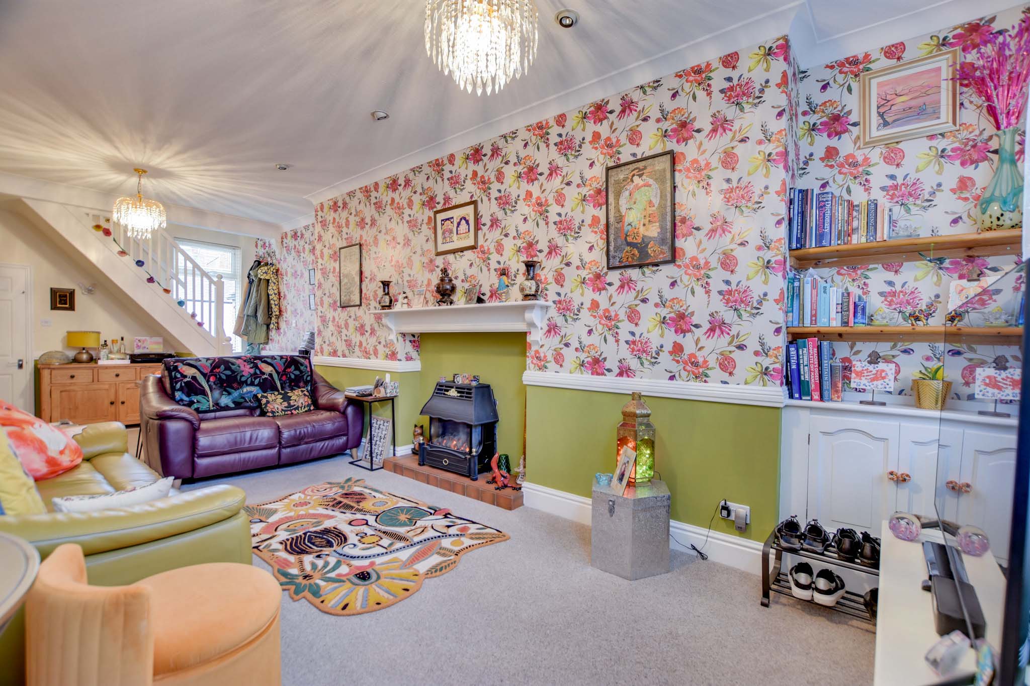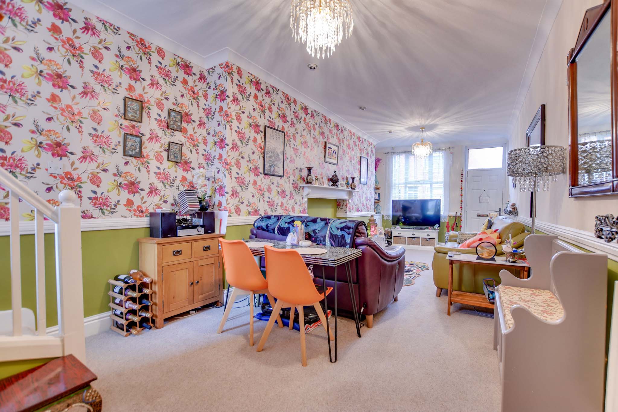 This lovely through-lounge enjoys double-glazed windows at both the front and rear, which keep the space bright. The focal point of the room is the gas fire set within a surround, adding a cosy touch to an already inviting space. A dado rail runs the length of the room, complementing the colourful décor. There’s also a TV point and two radiators to keep the room comfortable all year round.