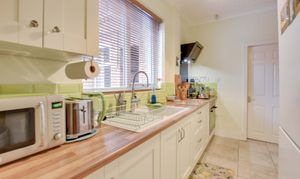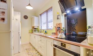 The kitchen has a double-glazed window to the side that brings in plenty of natural light. It’s fitted with a built-in oven and an induction hob topped with a sleek chimney hood, giving the room a modern touch. There’s a sink and drainer set beneath the window, along with a good range of wall and base units that offer plenty of storage. The warm wood-effect worktops and tiled flooring tie everything together nicely, and a radiator keeps the space comfortable throughout the year.