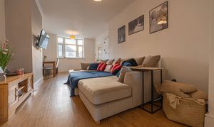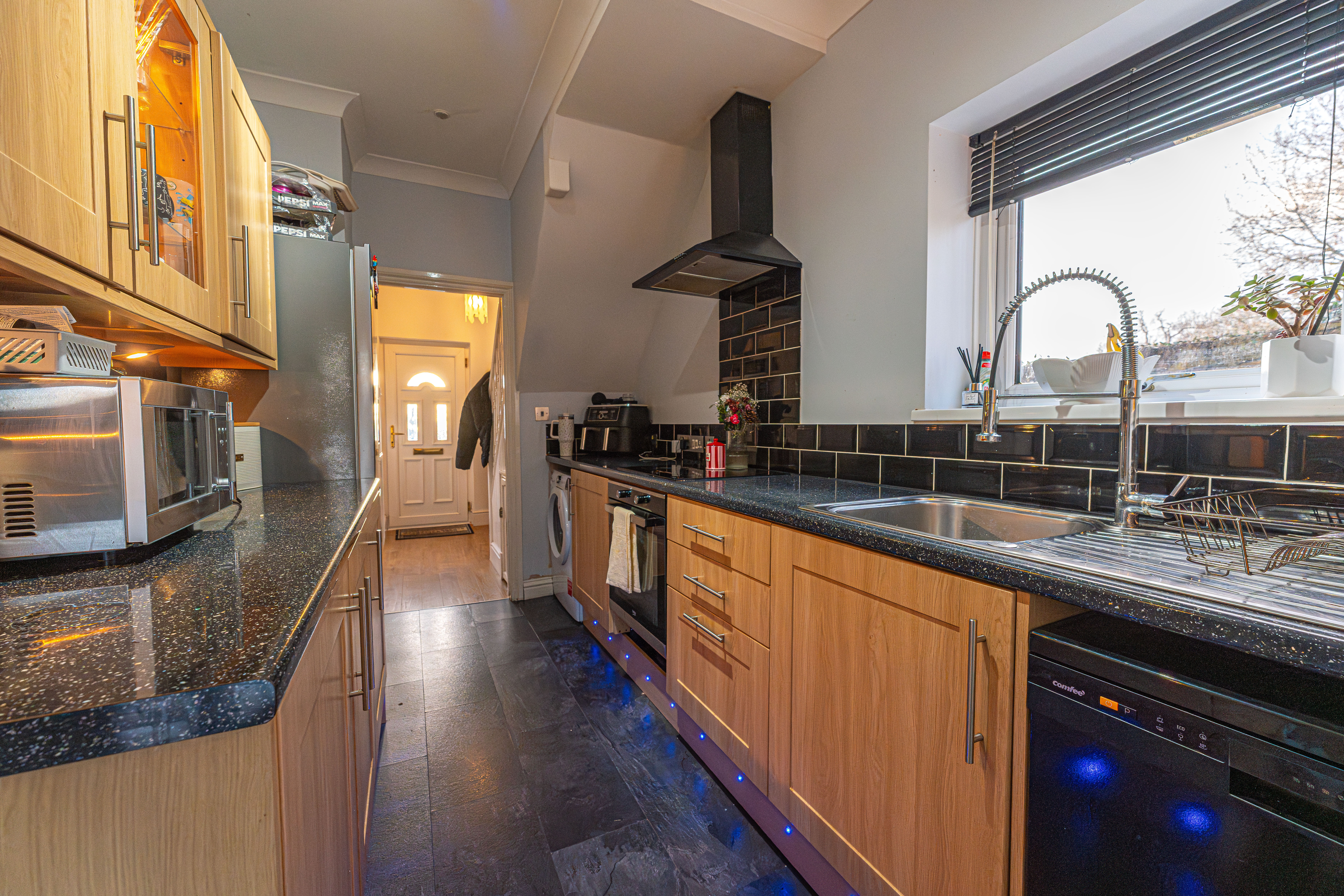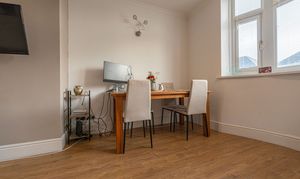 We enter this well presented property through the front, where we are welcomed into the impressively sized reception room, which is flooded by light through multiple windows, with a bay aspect at the front of the house providing a warm and bright space for relaxing and entertaining. This spacious reception room supports flexible living arrangements with a fluid open plan design, and is currently doubled up as the living room and dining area, while French doors to the rear open up to another generous reception room, which is also lit by a doorway to the garden. Also on the ground floor is the sleek kitchen, enjoying a practical galley style design with ample room for appliances, as well as offering great storage options and undercounter lighting.