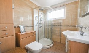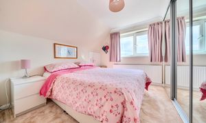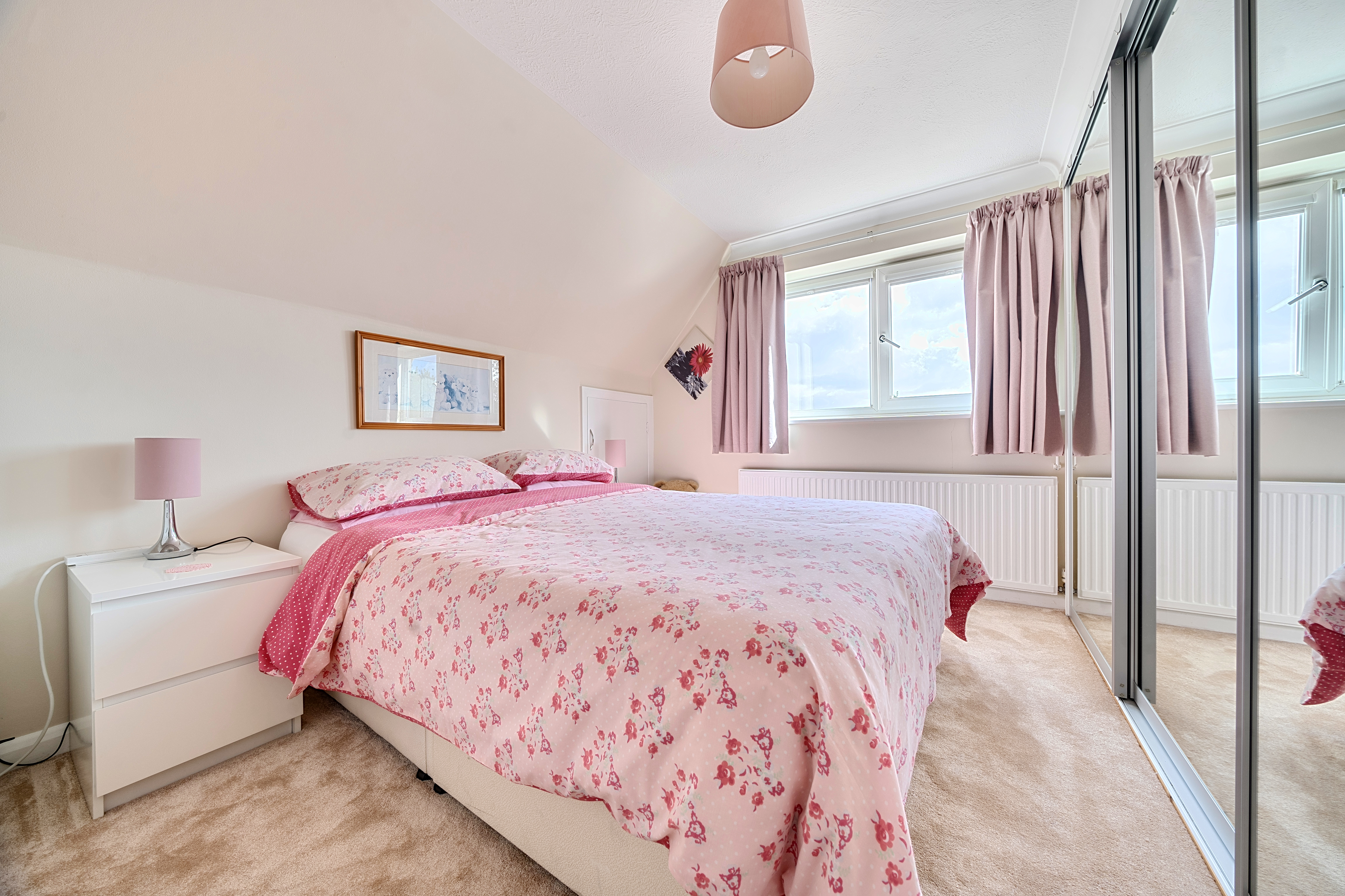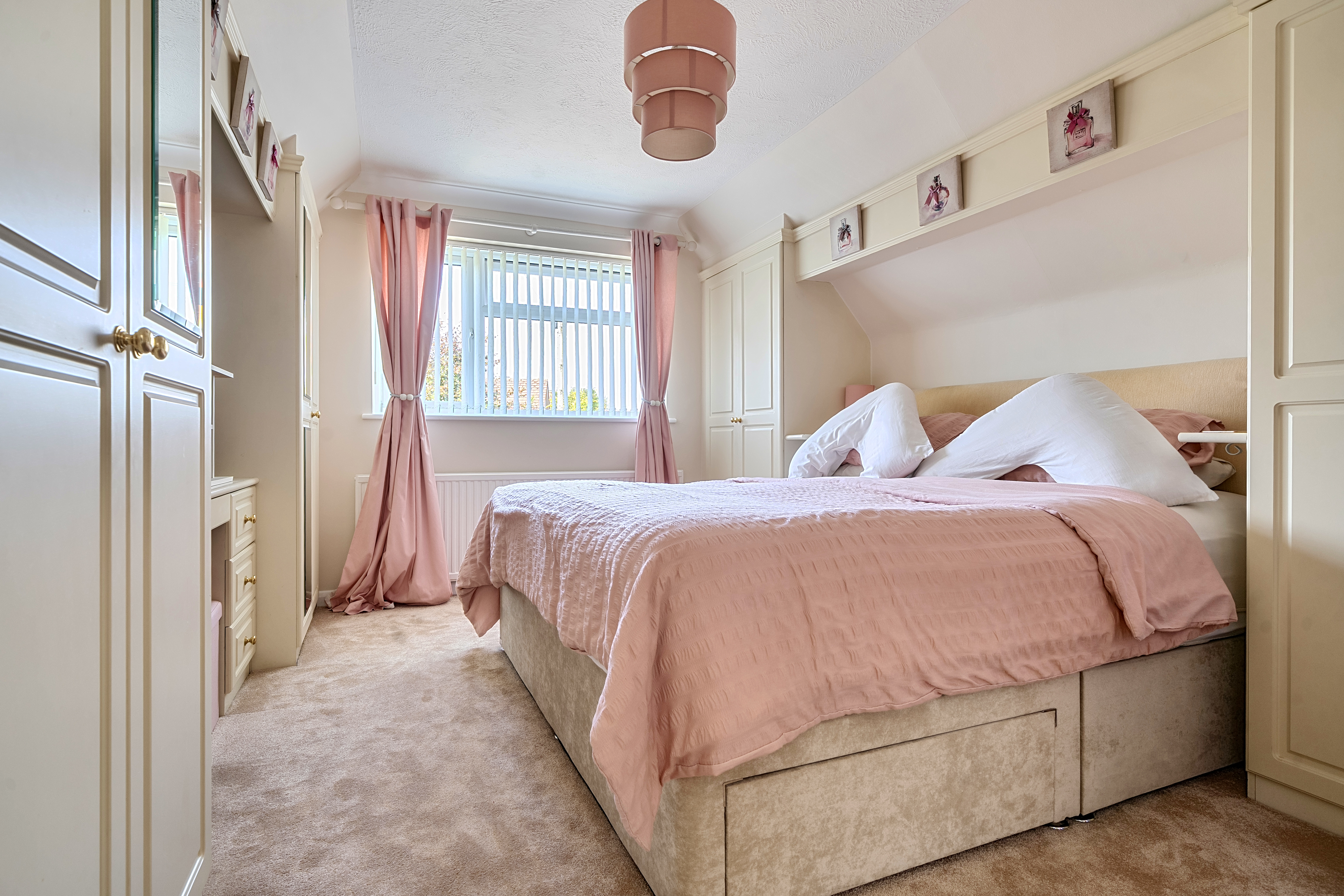 On the first floor, the master bedroom boasts fitted wardrobes and a stylish en-suite bathroom with both bath and shower facilities. Bedroom two is another generous double with built-in wardrobes and access to eaves storage, served by a contemporary family bathroom with shower cubicle.