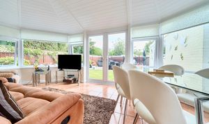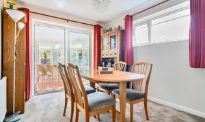 The property is arranged over two floors. On the ground floor, a welcoming entrance hallway leads to a cloakroom with W.C. and storage cupboard. The modern fitted kitchen with integrated white goods and soft closing drawers and includes a door to the driveway, while the bright and spacious living room benefits from dual-aspect windows and a feature log-burning stove. A separate dining room provides formal entertaining space, in addition to a versatile double bedroom/office and a conservatory with lovely views and direct access to the rear garden.